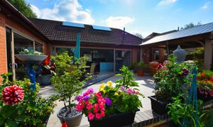 A lovely front garden with gravelled areas, flowerbeds and shrubs, paved pathway.