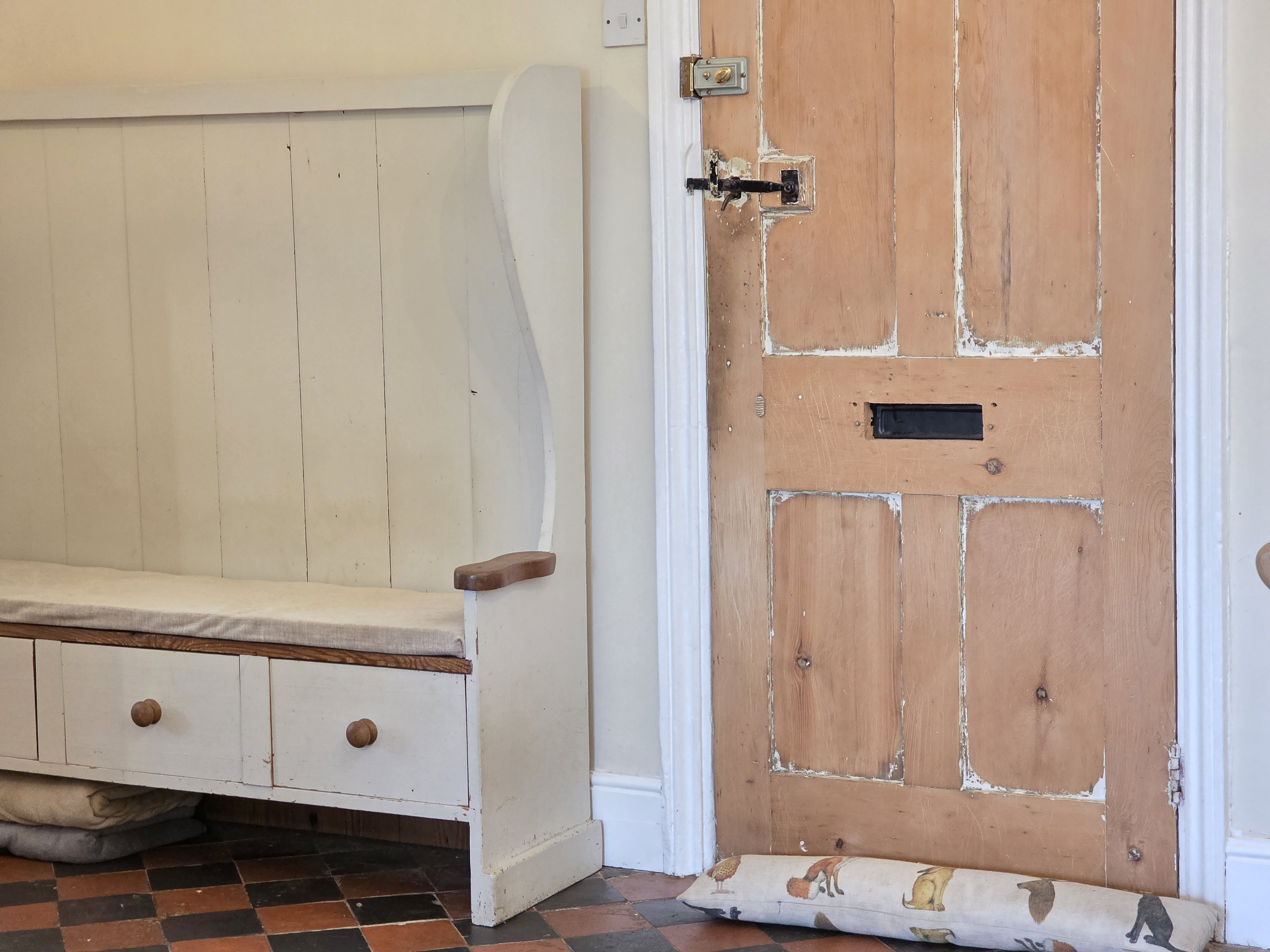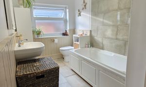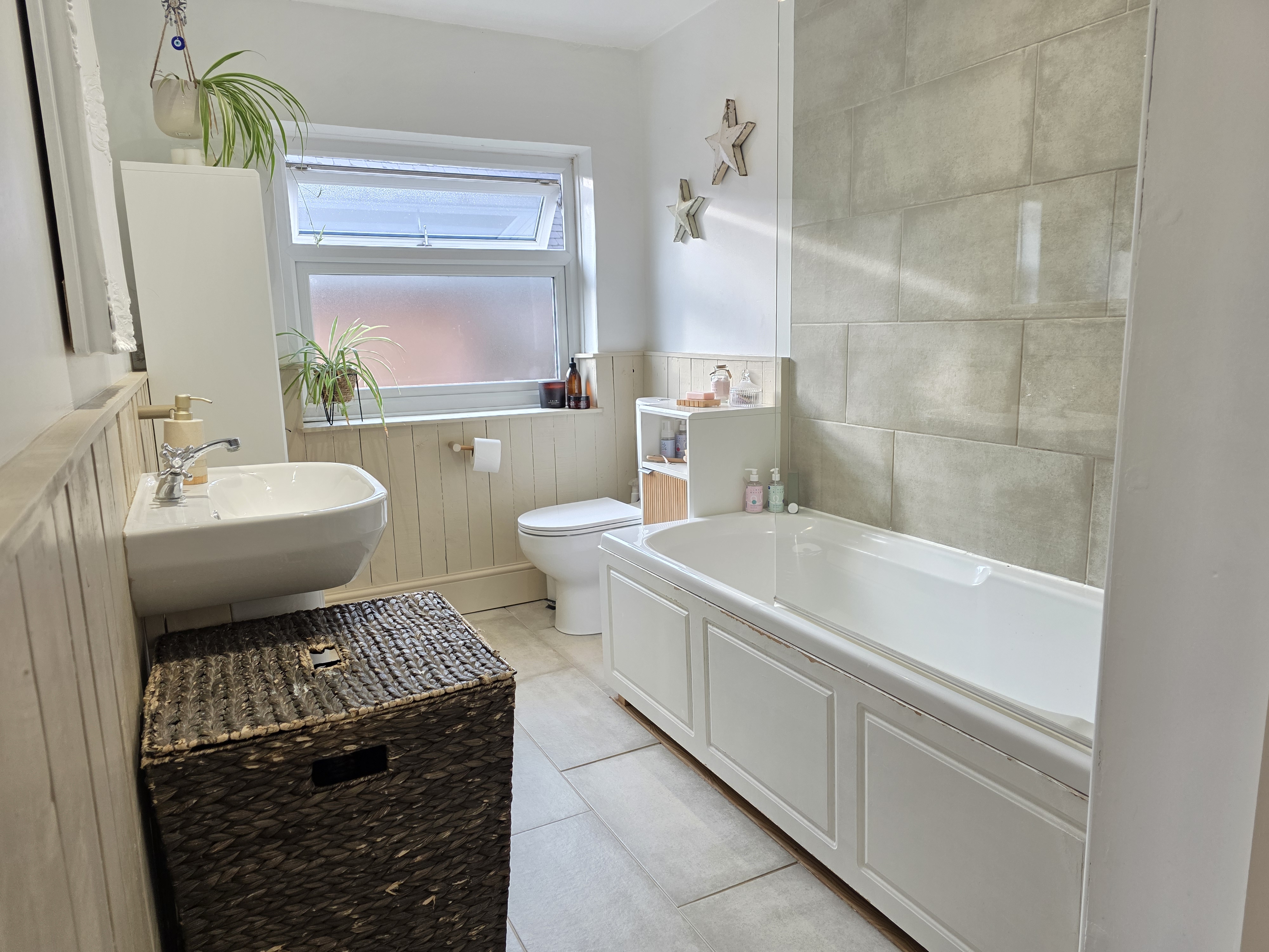 This modern country style bathroom includes panel bath with shower over, low level flush WC, wash hand basin with mixer tap, wall panelling, tiled splashbacks, tiled flooring, airing cupboard and obscure UPVC double glazed window.