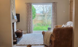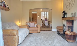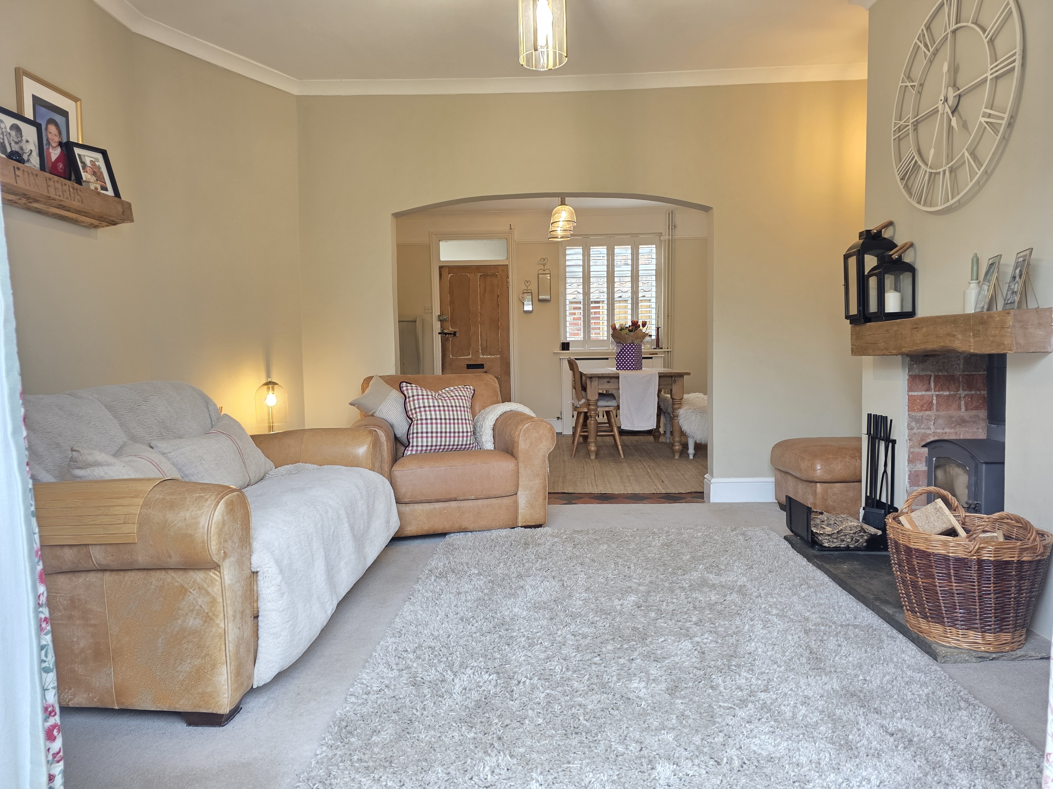 The lounge includes coving to ceiling, carpet flooring, TV connectivity, log burner, radiator, access and views out to the rear garden plus stairs leading to the first floor.