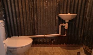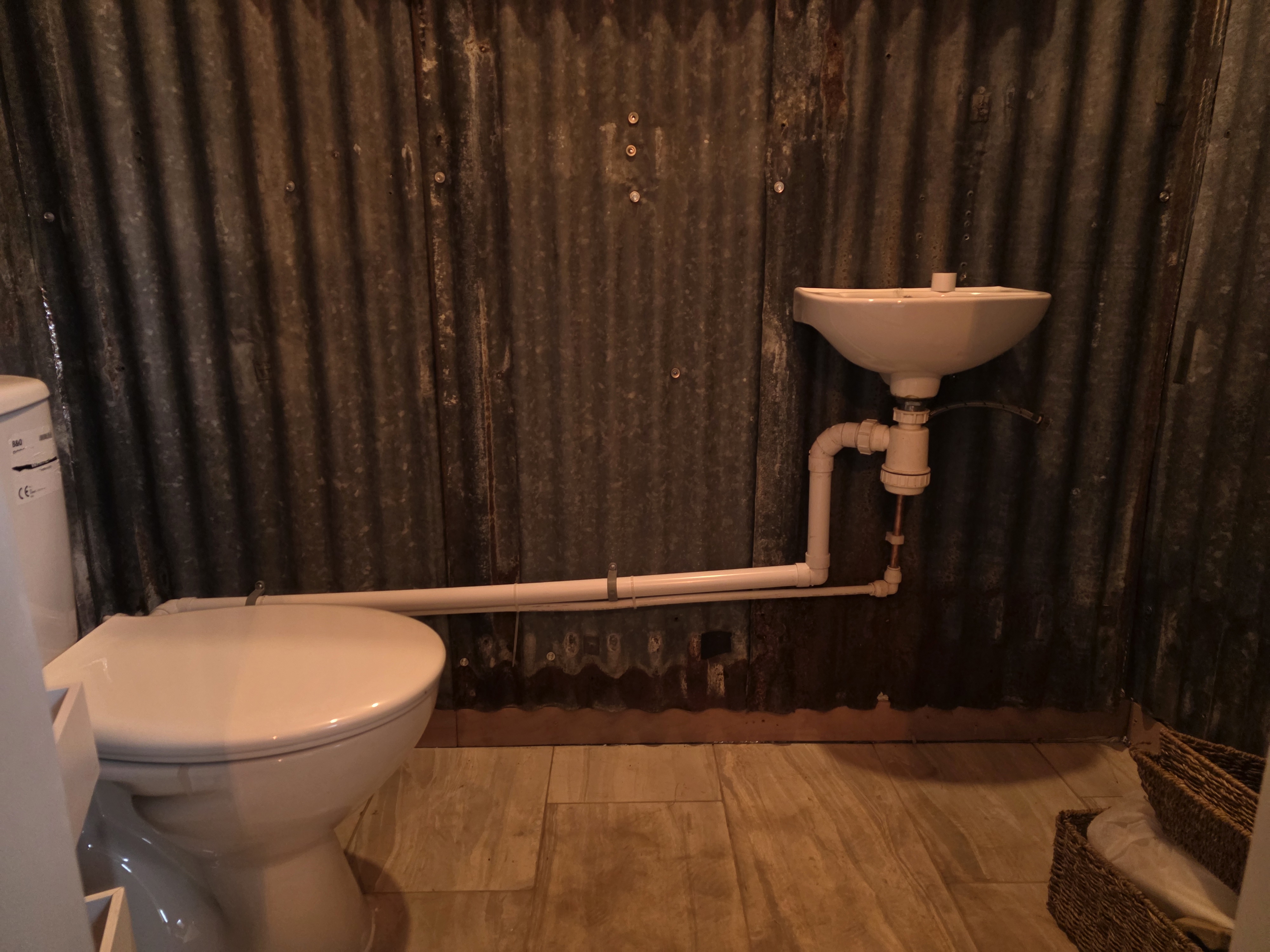 Simply includes a low level flush WC, wash hand basin and tiled flooring.
