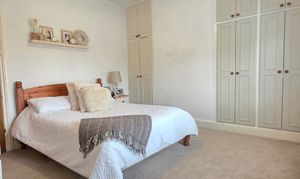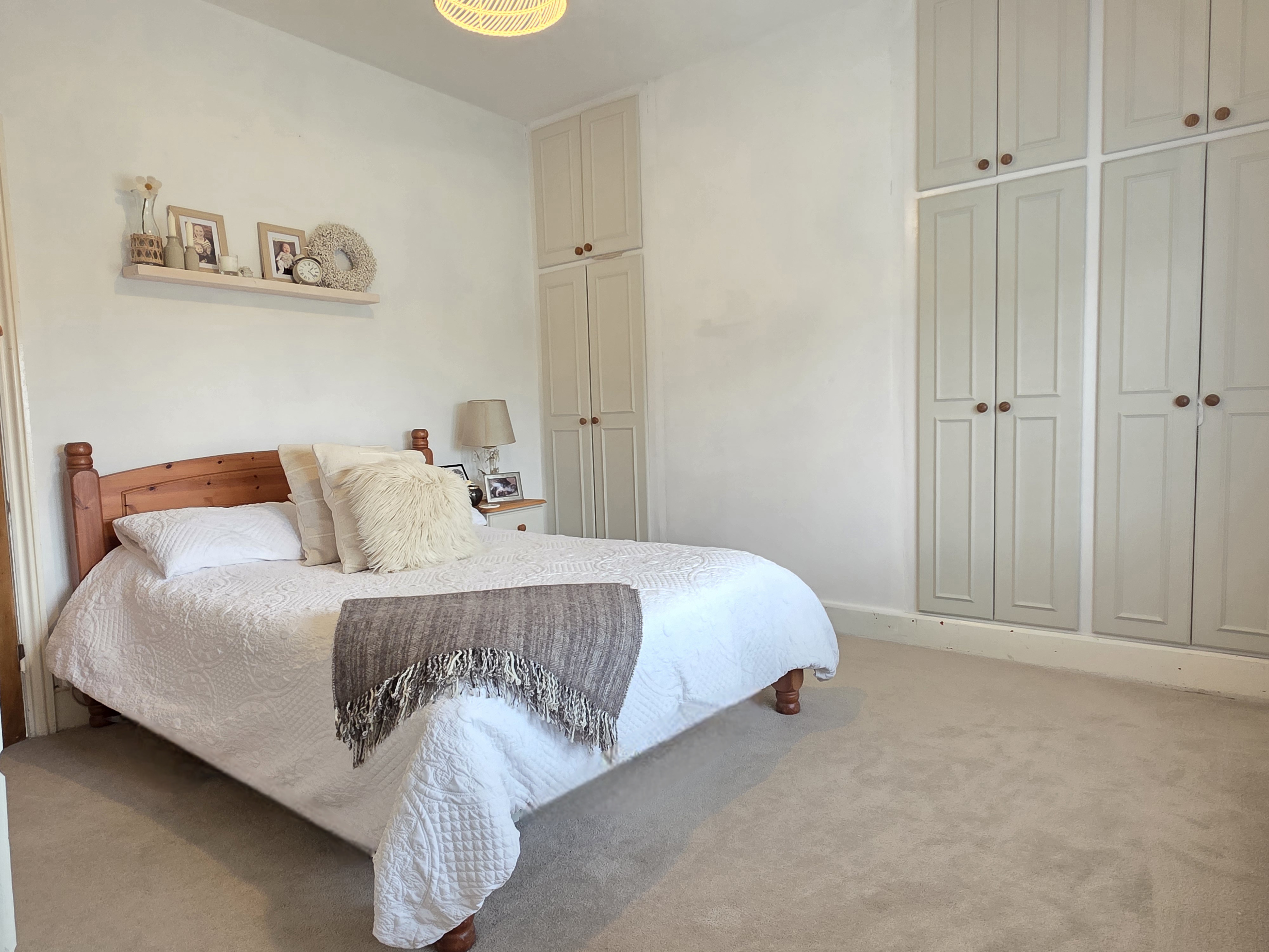 The primary bedroom has carpet flooring, integrated wardrobes, over-stair storage, radiator, venetian fitted blinds and UPVC double glazed window.