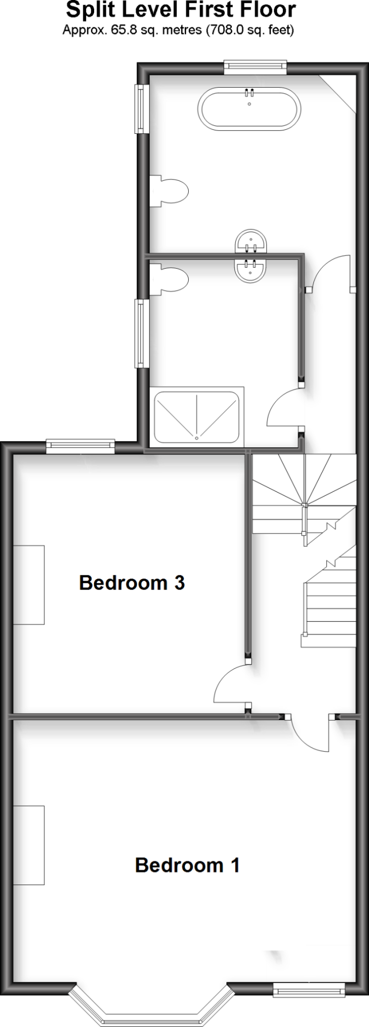 Split level landing with newly laid carpeted floor coverings. Stairs leading up to second floor. Opening and Doors To :-