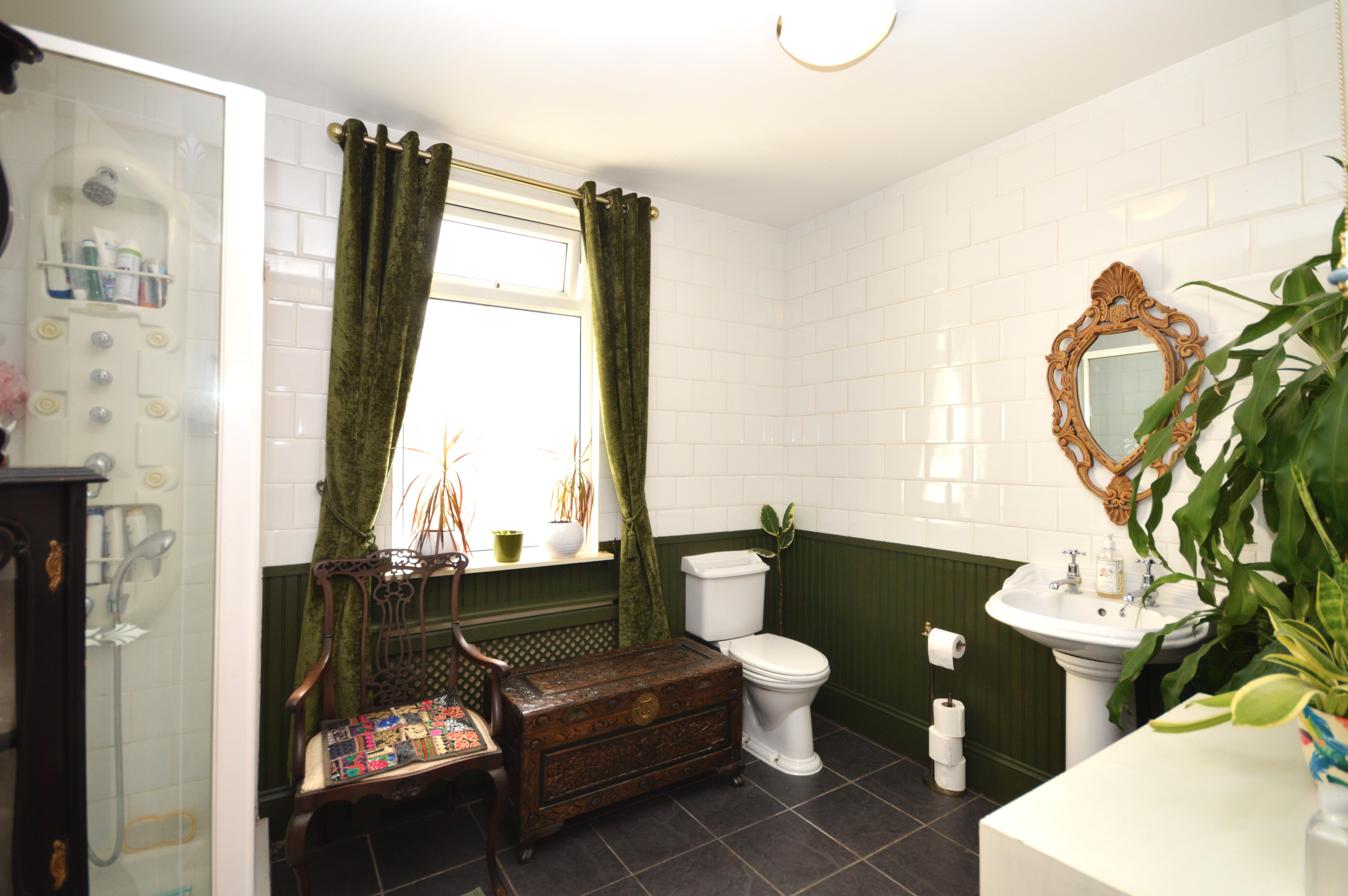 UPVC double glazed frosted window to the side. Walk in jet shower. Georgian style toilet, closed couple WC and a Georgian style pedestal hand basin. Tiled flooring, radiator, fully tiled walls with panel boarding at the bottom.
