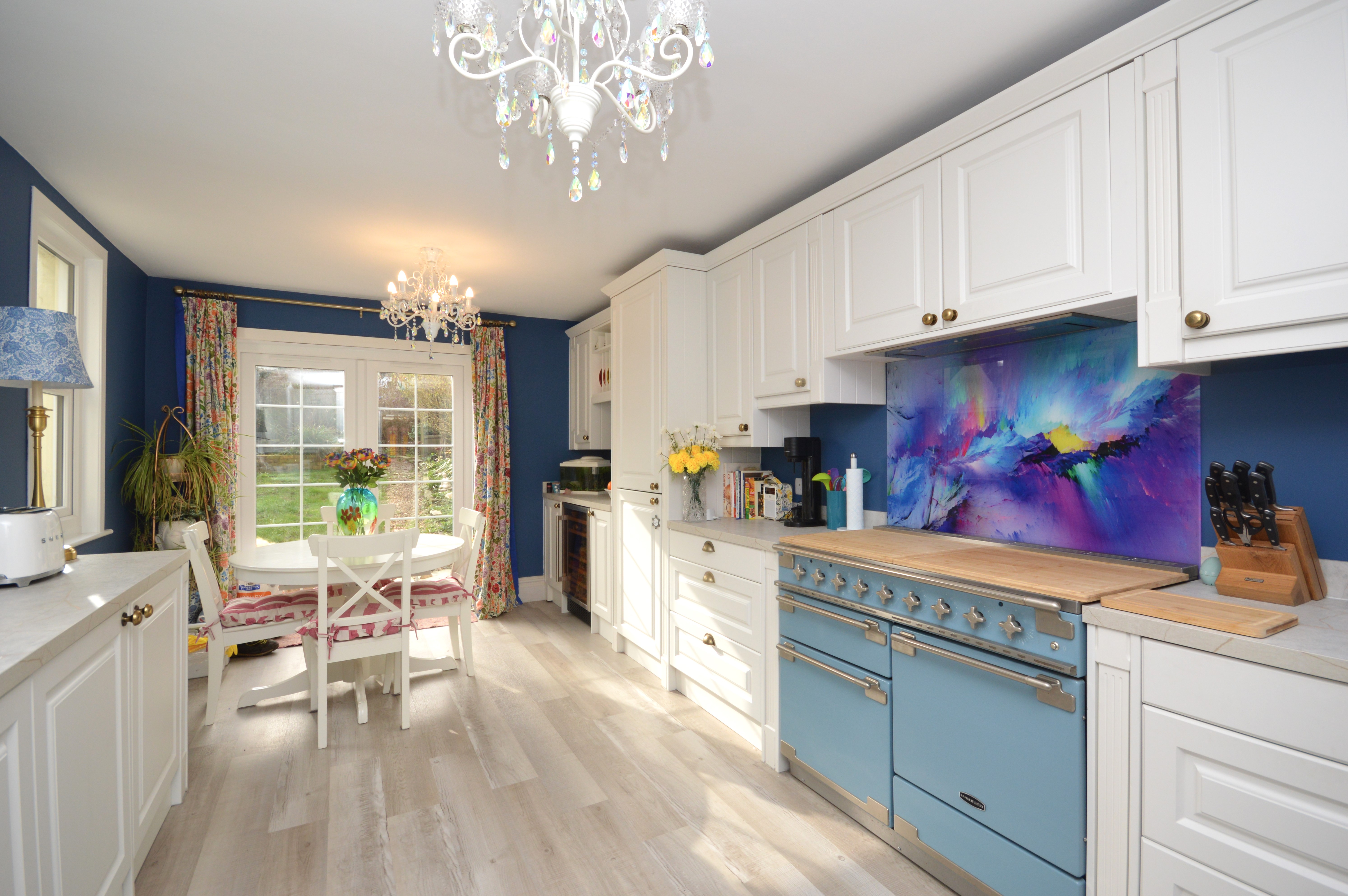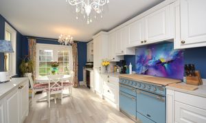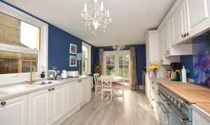 Newly fitted Georgian style kitchen units with mix of matching wall and base units. Newly fitted UPVC double glazed French doors out to the garden and newly fitted double glazed windows to the side. Integrated fridge/freezer, dishwasher, washing machine and tumble dryer. There is also a wine cooler and custom made splashback behind the space for a Rangemaster cooker. LVT flooring and designer radiator.