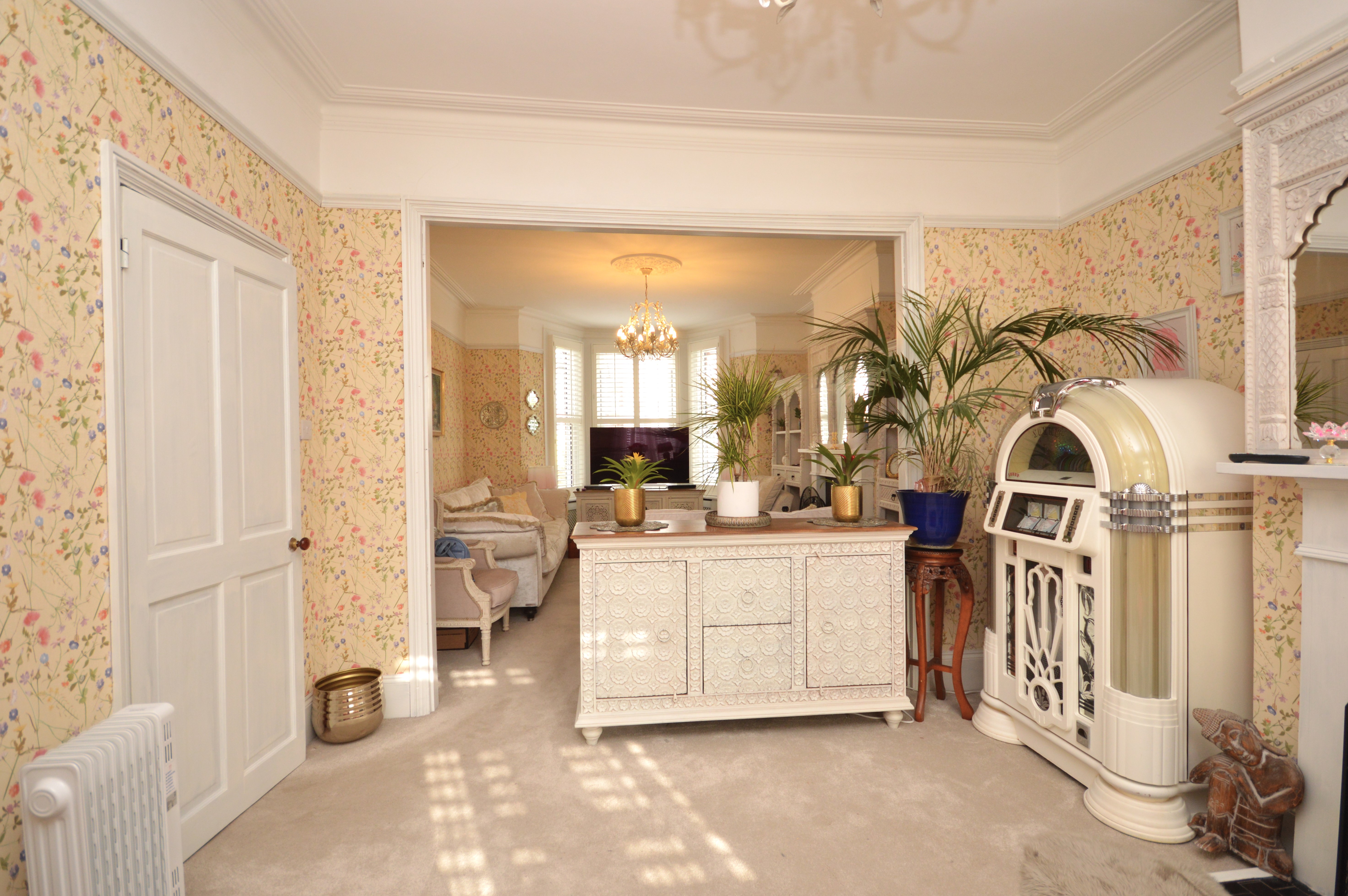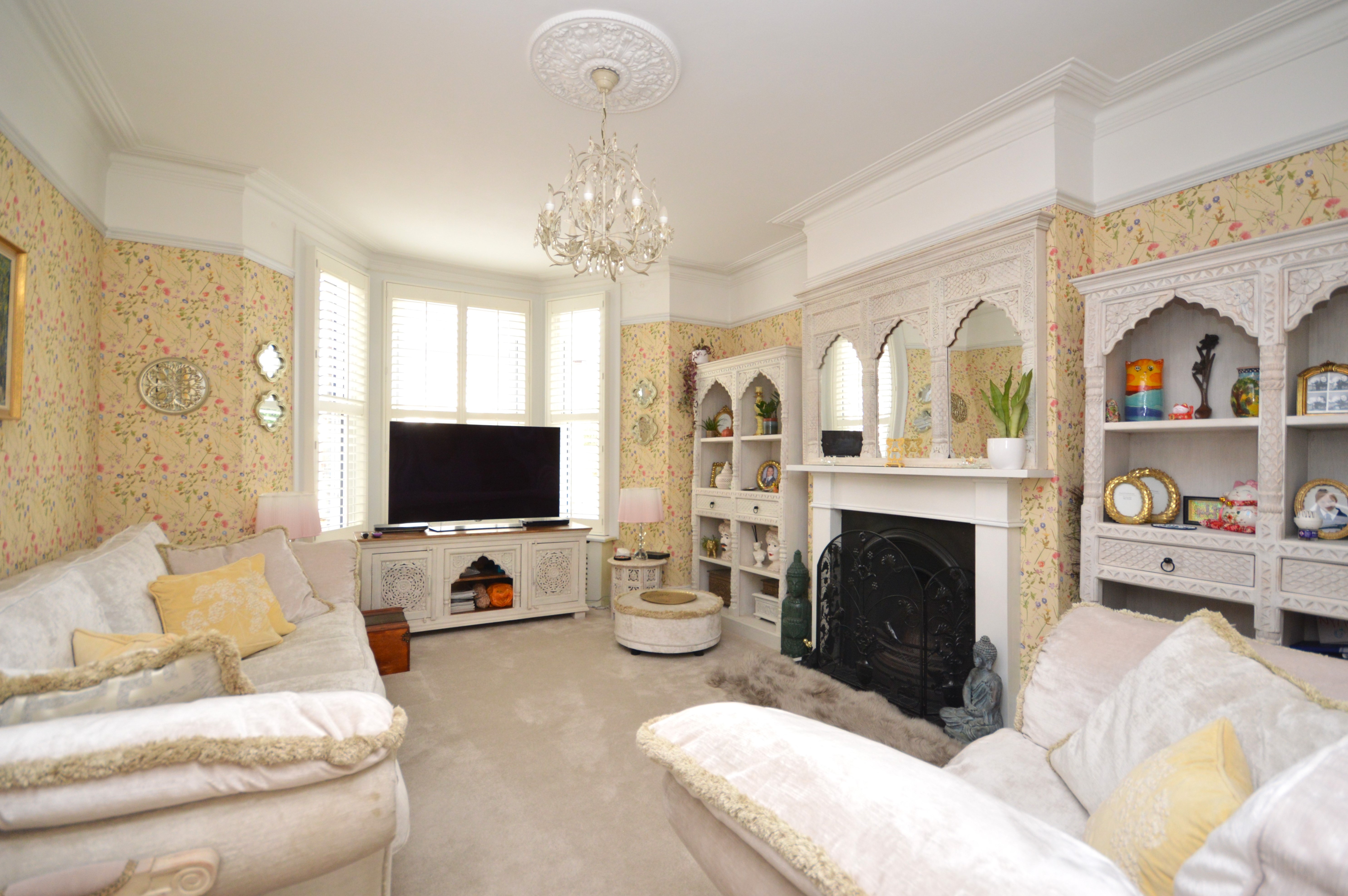 UPVC double glazed French doors out to the garden with fitted plantation shutters. Newly laid carpeted floor coverings, coving, picture rail and original fireplace. High skirting boards and radiator.