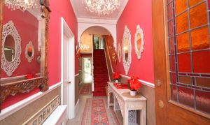 LVT flooring, stairs to first floor landing, decorative art original features and coving. High skirting boards and radiator, door to cellar and doors To :-