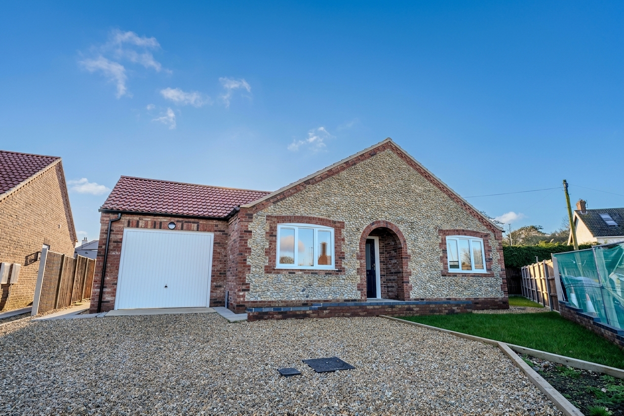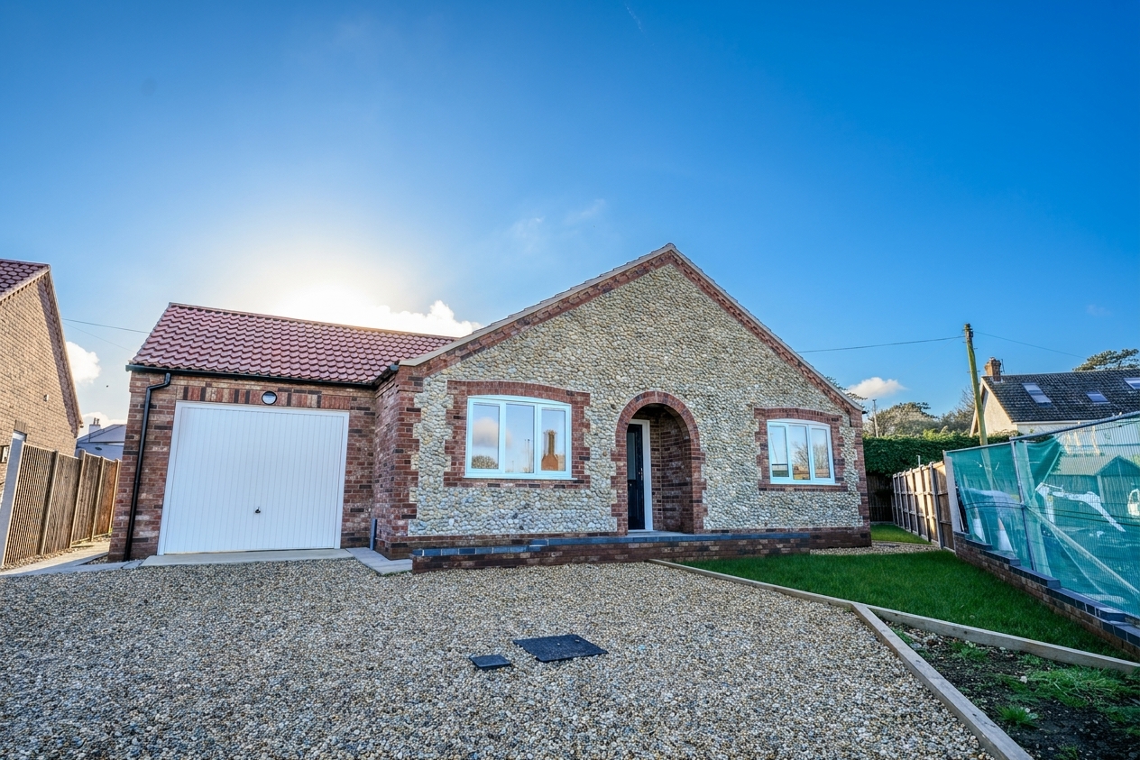 This stunning three-bedroom bespoke new build detached bungalow, crafted by renowned local developers AG Brown, enjoys an enviable position within the highly sought-after seaside town of Cromer, just a short stroll from the vibrant town centre and picturesque beach. Thoughtfully designed and impeccably finished, the property offers spacious, light-filled accommodation throughout. At the heart of the home lies a striking kitchen/diner, complete with high-end built-in appliances and a stylish, modern finish, ideal for both everyday living and entertaining. The adjoining utility room adds practicality, while the generously proportioned lounge features elegant French doors that open onto the rear garden, seamlessly blending indoor and outdoor living. The beautifully appointed family bathroom includes a separate shower, and the main bedroom is further enhanced by a luxurious en-suite shower room.