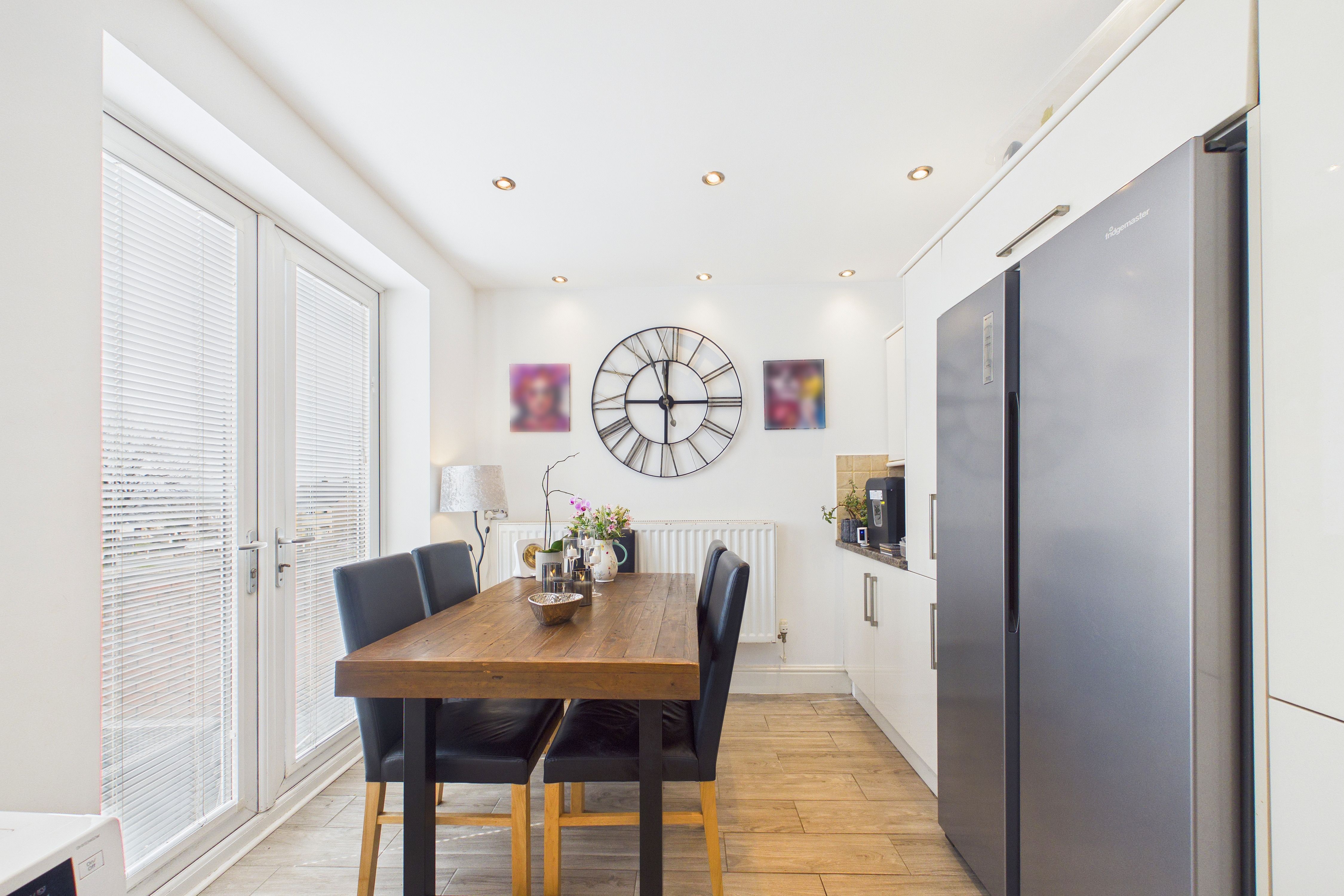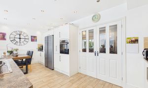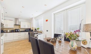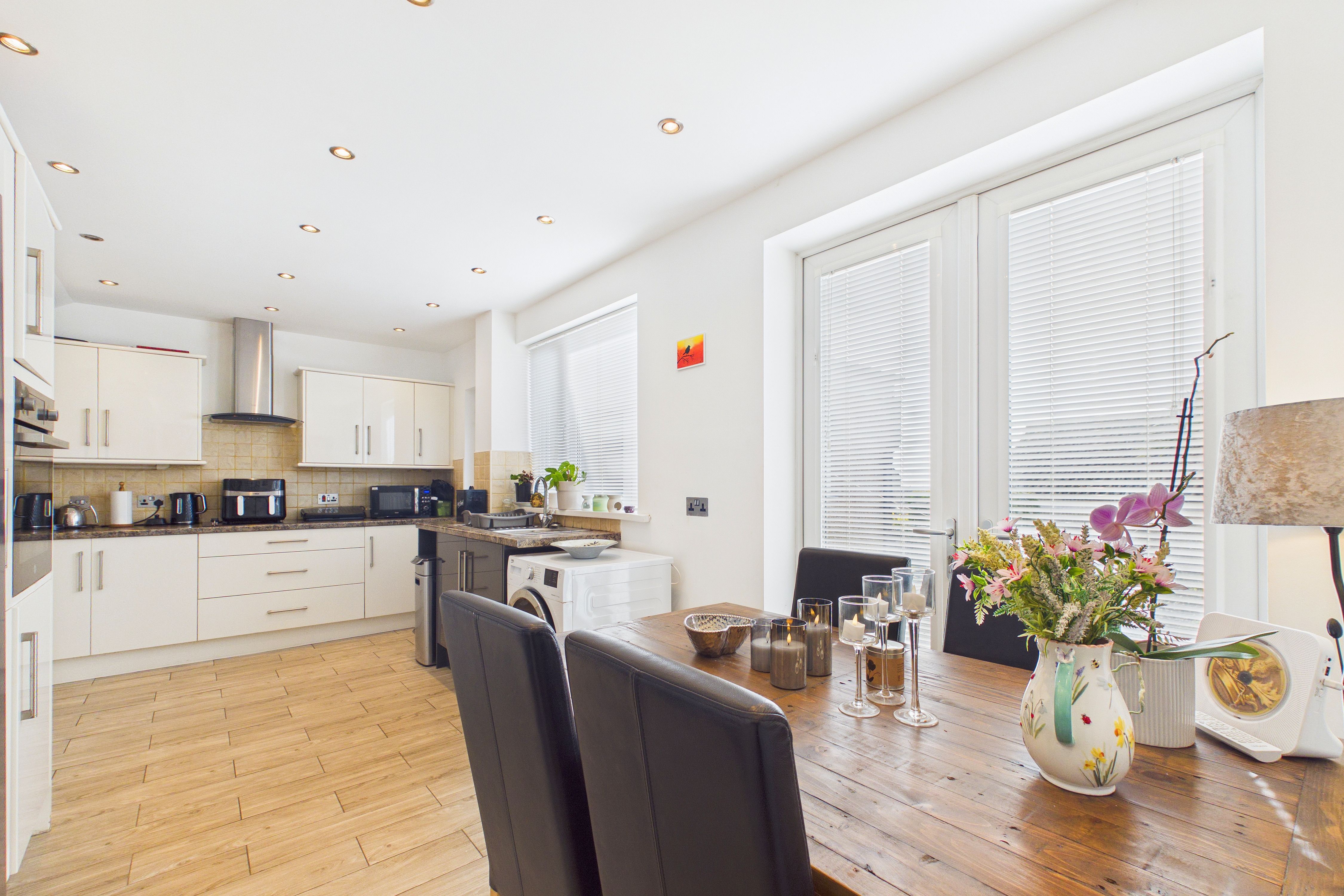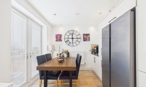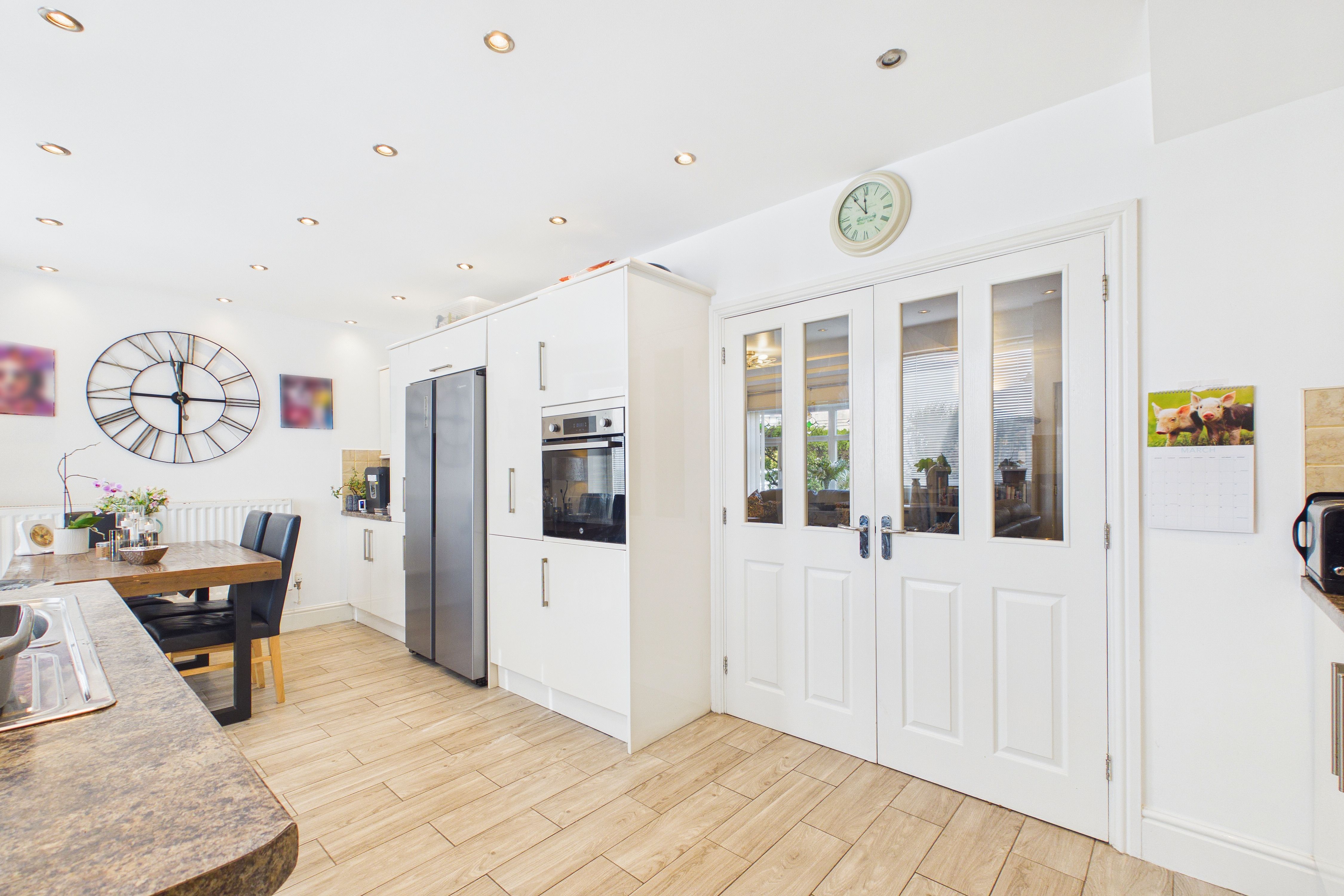 - Modern kitchen diner with high gloss wall and base units, integrated appliances and French doors to the rear garden