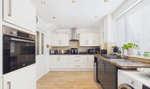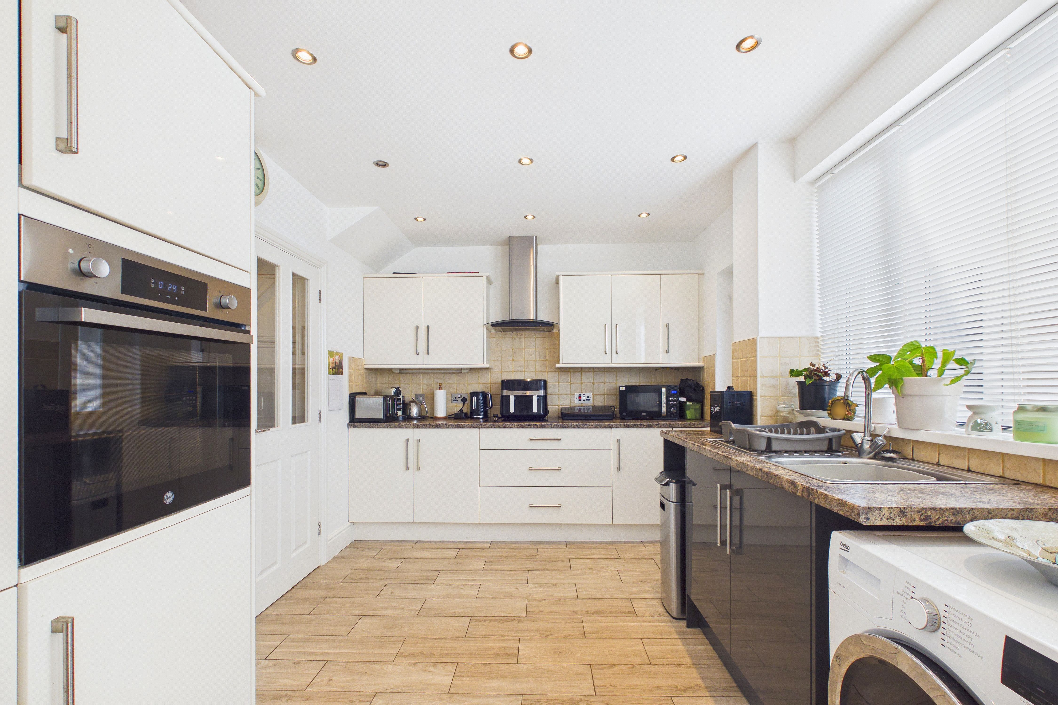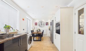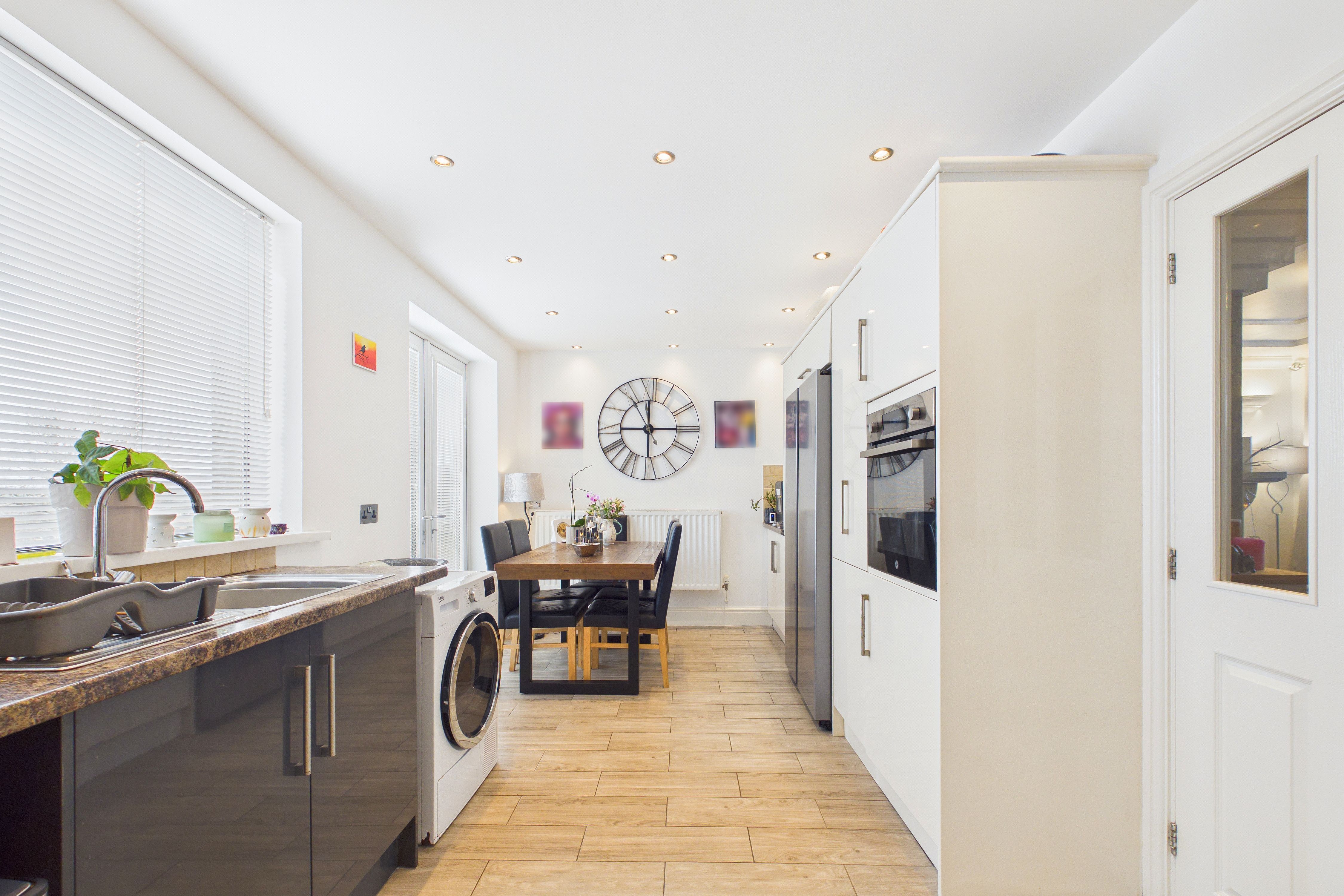 Double doors lead effortlessly into a contemporary kitchen diner, complete with high gloss wall and base units, integrated appliances and elegant wood effect tile flooring. French doors open out to the rear garden, seamlessly blending indoor and outdoor living. The kitchen connects to a rear hall, with a convenient alcove ideal for a tumble dryer, and provides access to a stylish ground floor bathroom, which boasts a large vanity unit and matching tall cabinet.