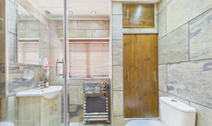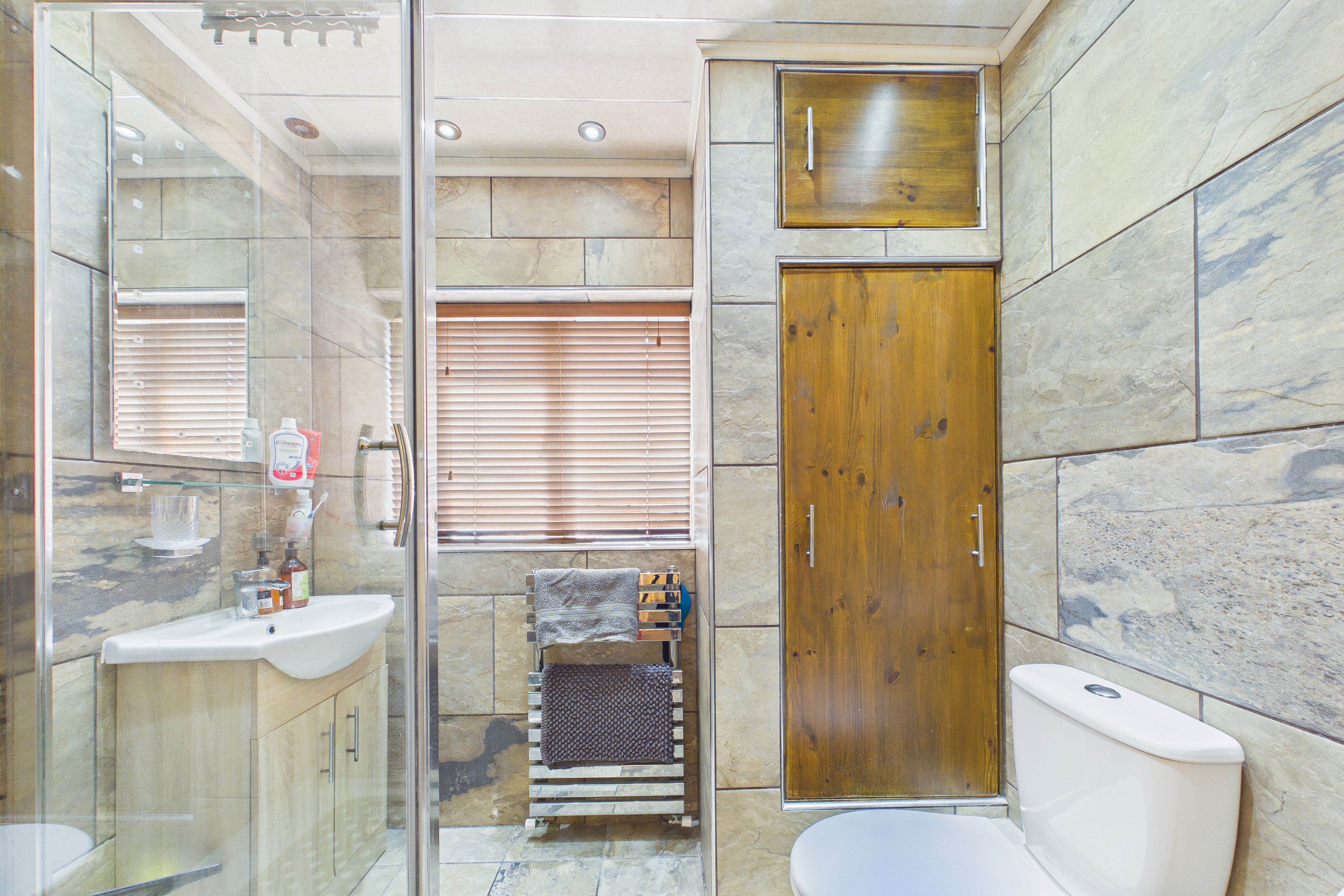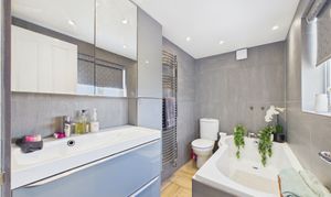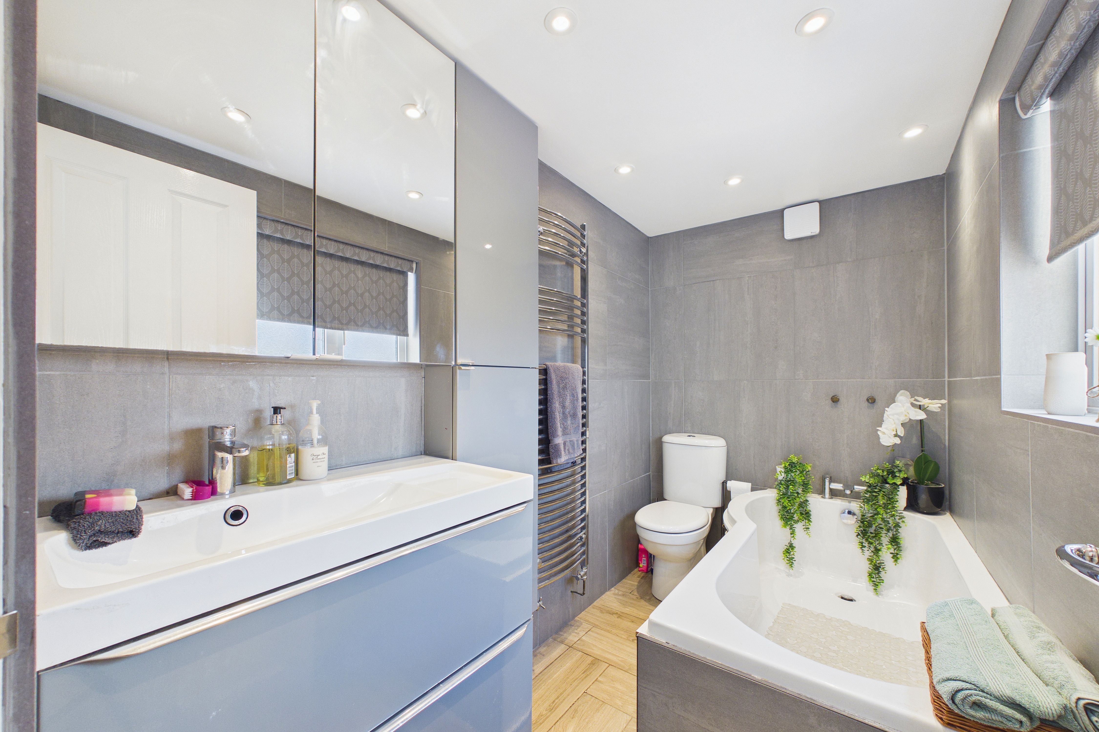 - Stylish ground floor bathroom with large vaunt unit housing the sink and a matching wall mounted tall cabinet