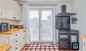 To the rear of the property with direct access from the kitchen french doors, there is a rear garden with a paved patio and lawned area. This private space is fenced to the boundary.