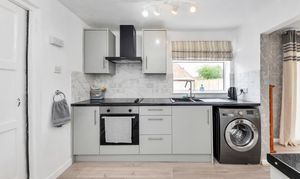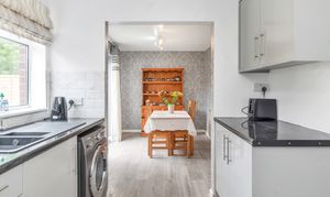The kitchen is a good size and enjoys an open-plan atmosphere with the dining room, a window to a garden aspect, a range of modern base and wall units, laminate worktops, tiled flooring and splashbacks, spot lighting, an integrated oven, hob and extractor hood, and space for a fridge/freezer, washing machine and smaller kitchen appliances. The utility room provides further storage, access to the garden and to a cloakroom WC, and space for large appliances.