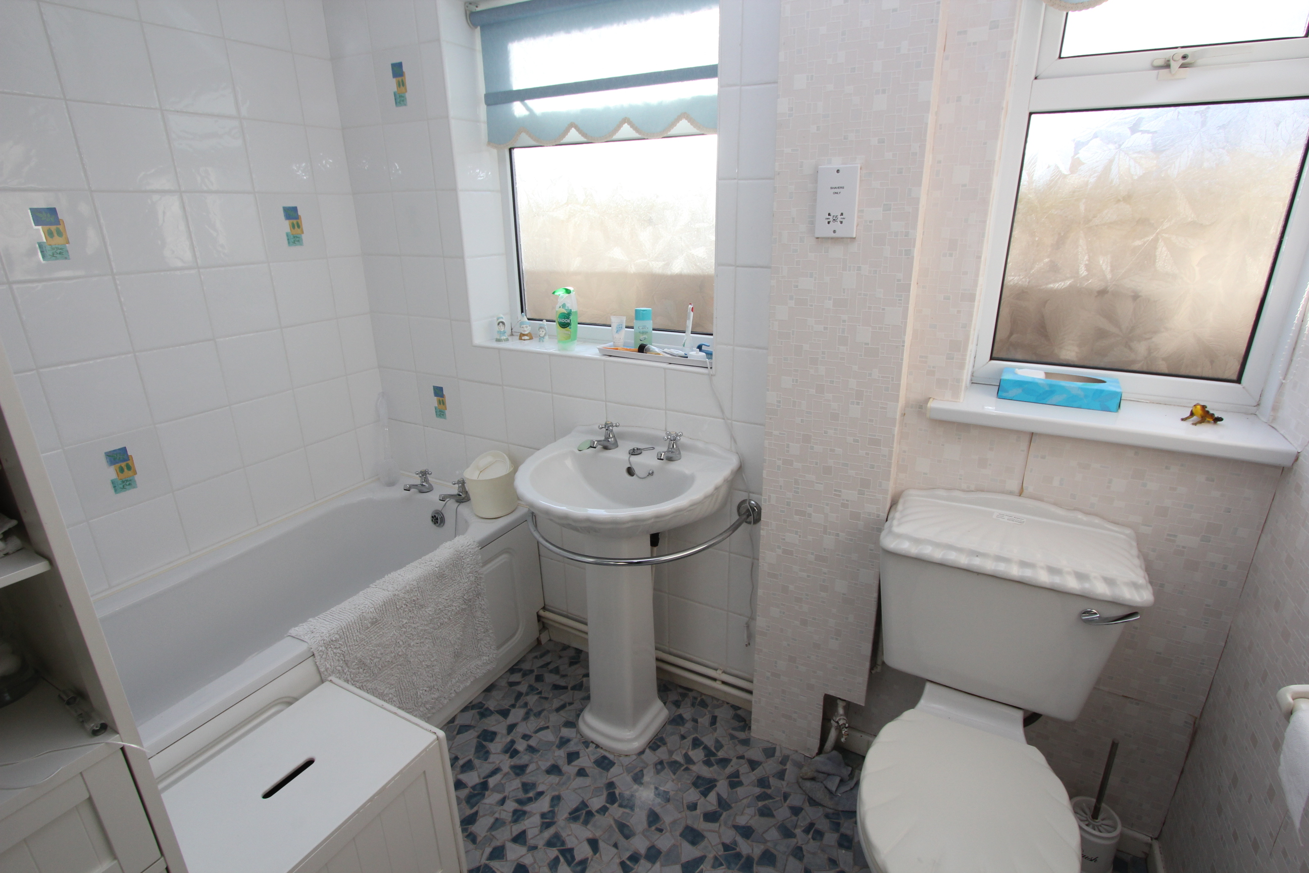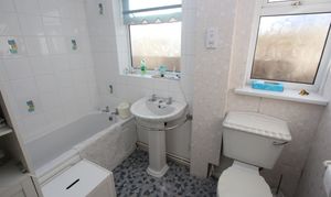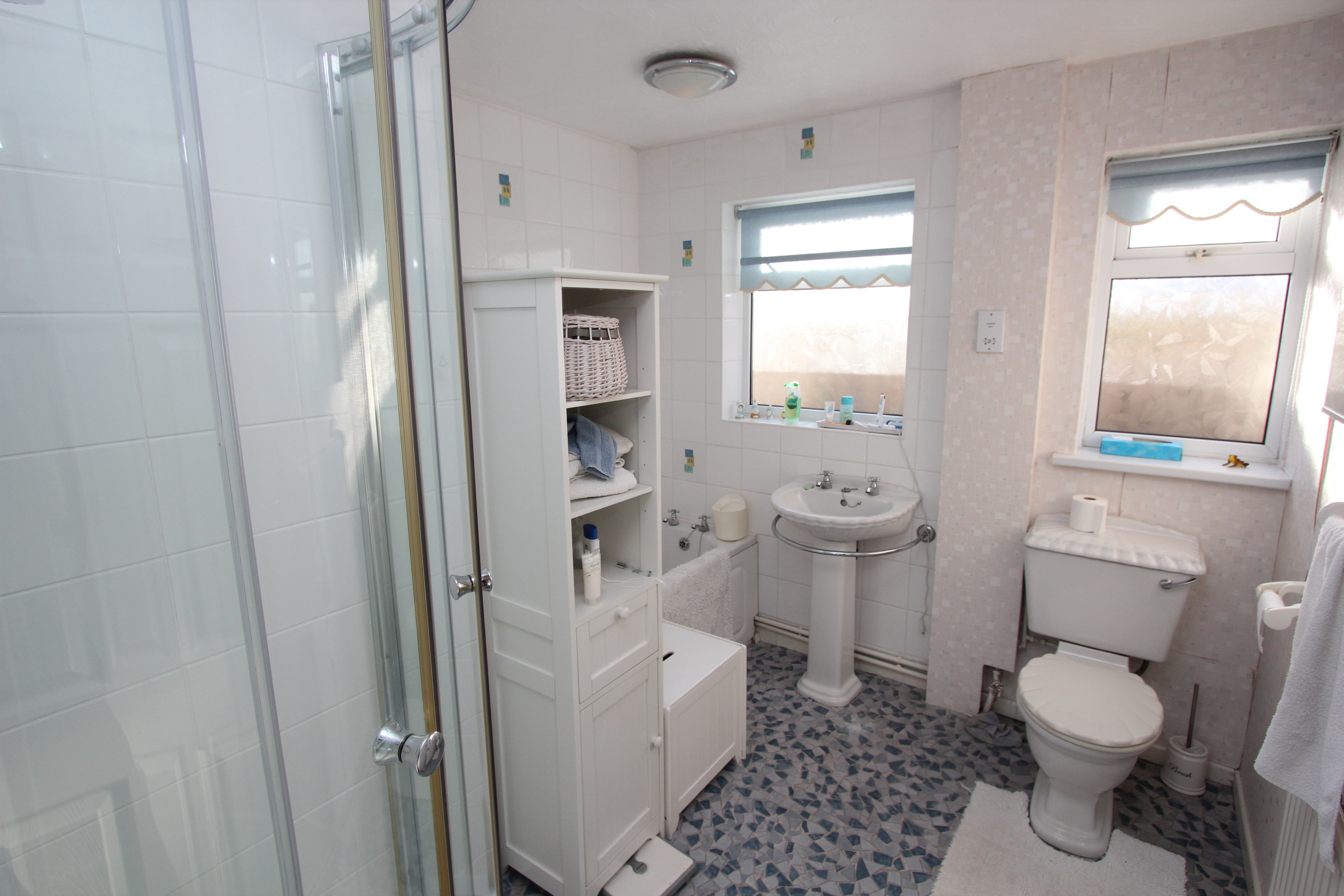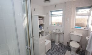 Shower enclosure with electric mixer shower. Panelled bath. pedestal wash hand basin. Low level WC. Radiator. UPVC opaque windows.