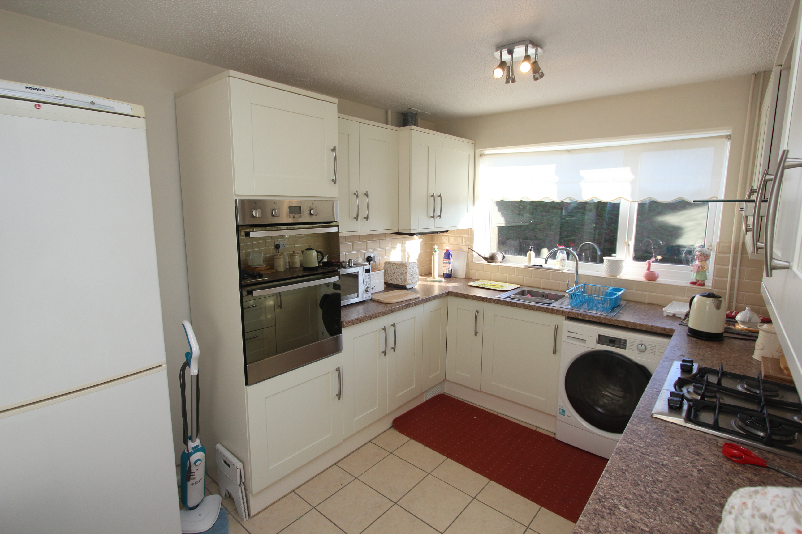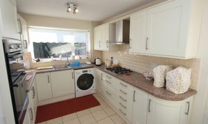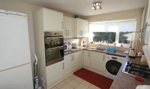 UPVC window and opaque glazed door. Fully fitted kitchen comprising eye level units base units with drawers and work surfaces over. Stainless steel sink. Eye level oven and grill. Gas hob with hood. Space for white goods.