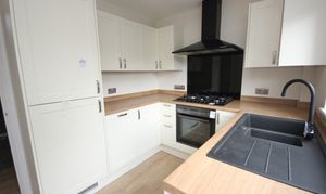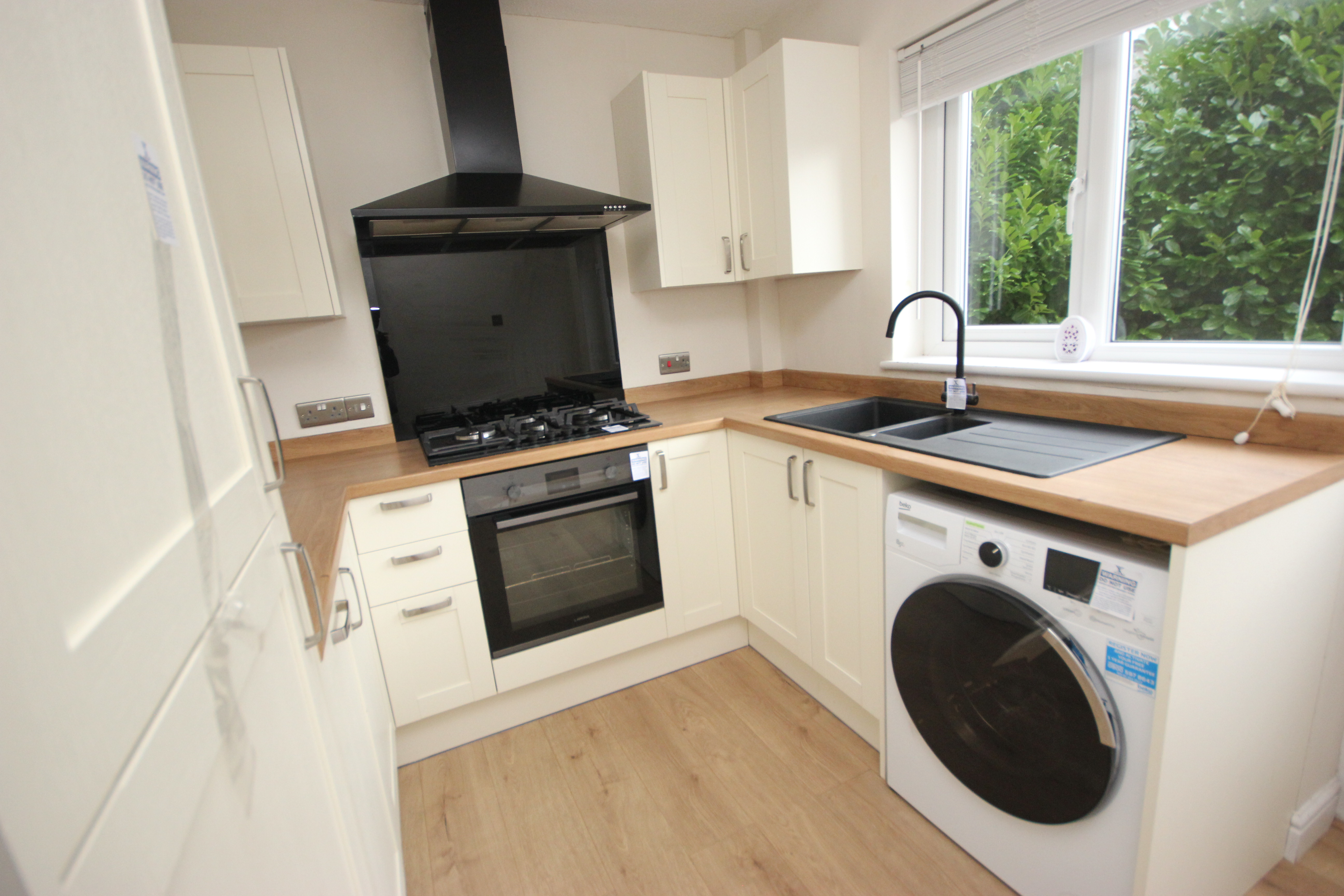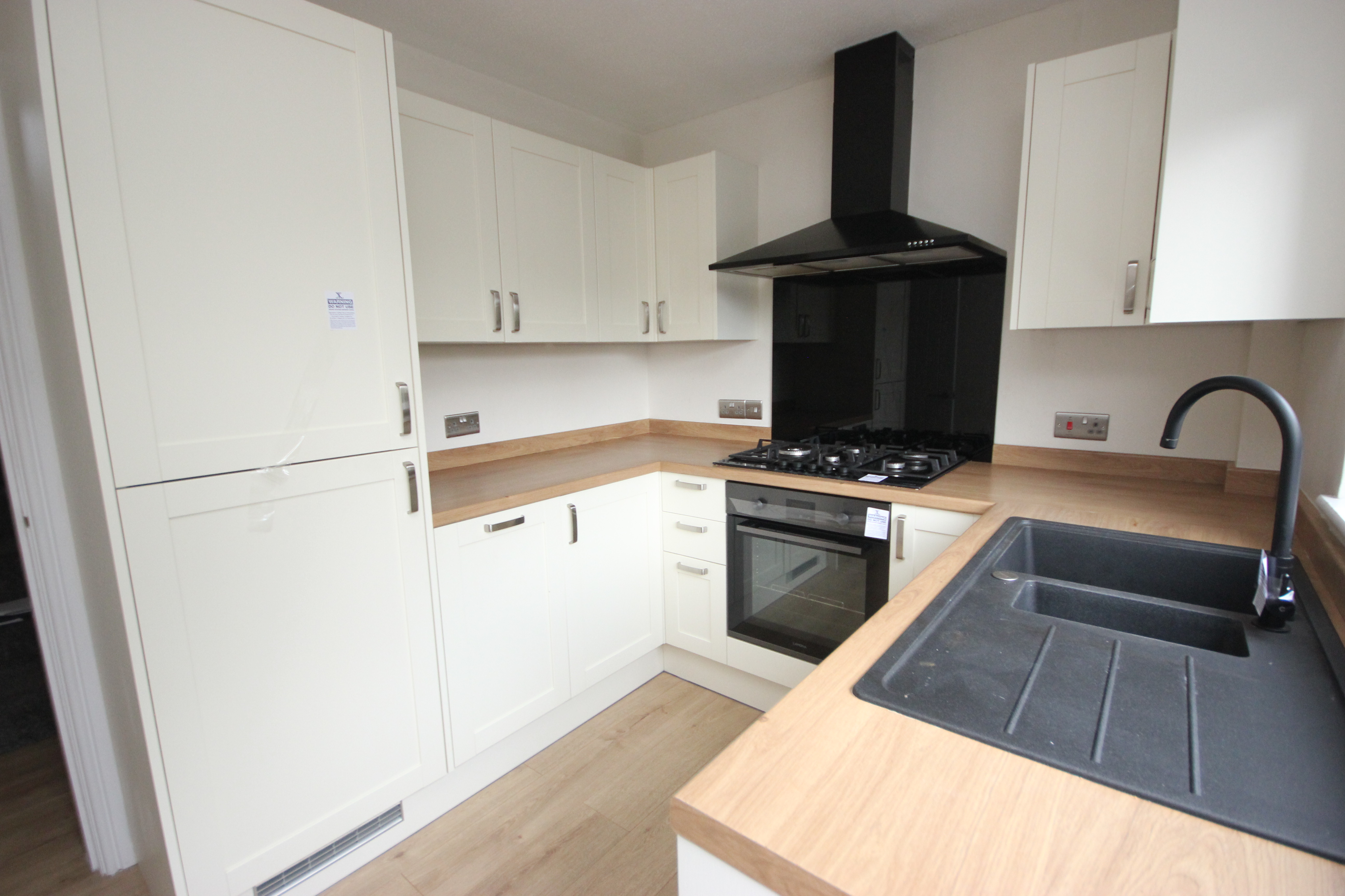 UPVC Double Glazed Window and UPVC Double Glazed Door to the rear elevation. Lovely shaker style kitchen with a range of wall and base units. Integrated five ring gas hob, integrated electric oven, integrated fridge/freezer and integrated Dishwasher. Ceiling point, part tiled walls, laminate flooring and central heating radiator.