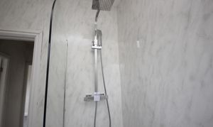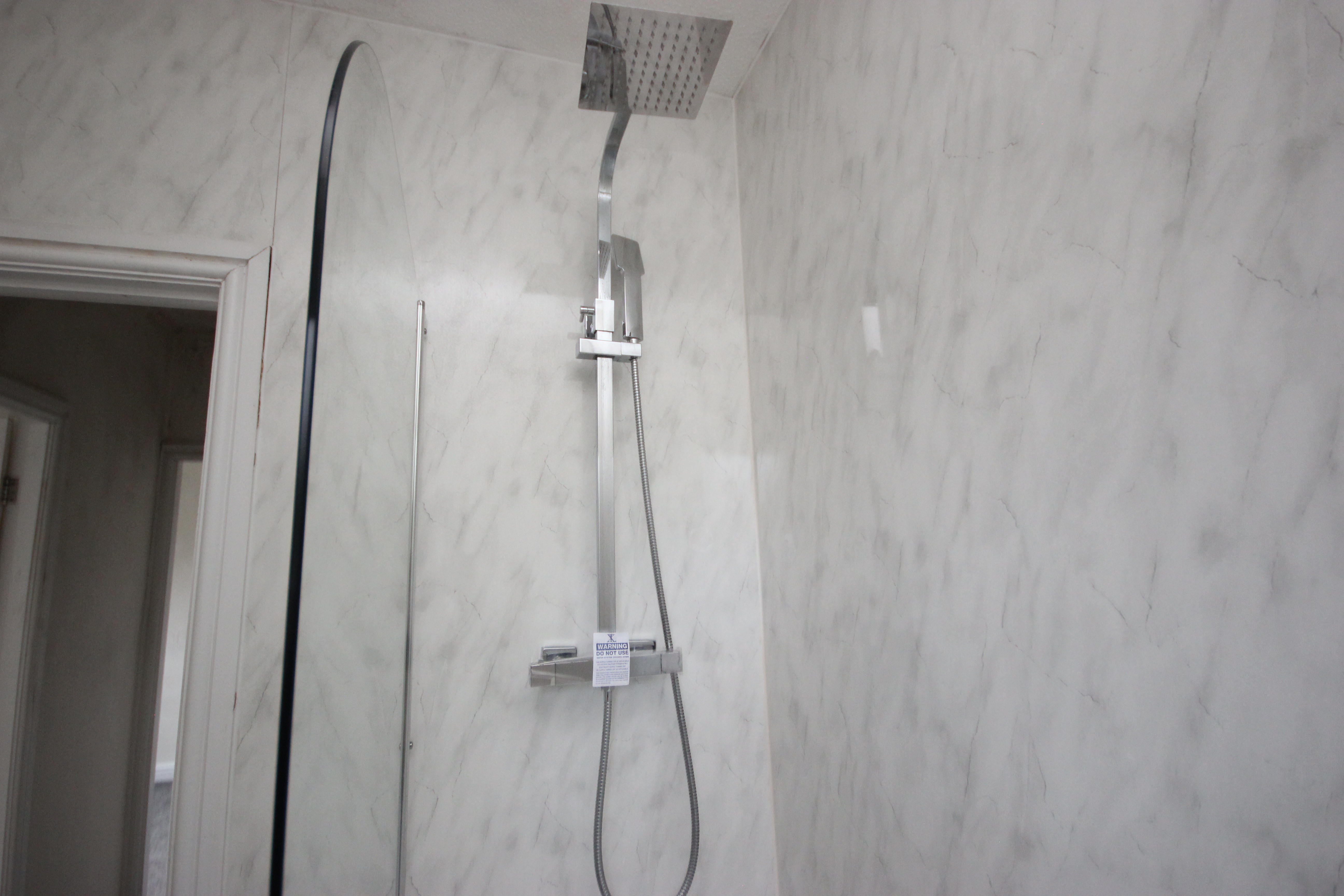 Modern three piece bathroom suite comprising of low level w.c, hand wash basin inset into vanity unit and panel bath with glass shower screen and mains fed shower over.