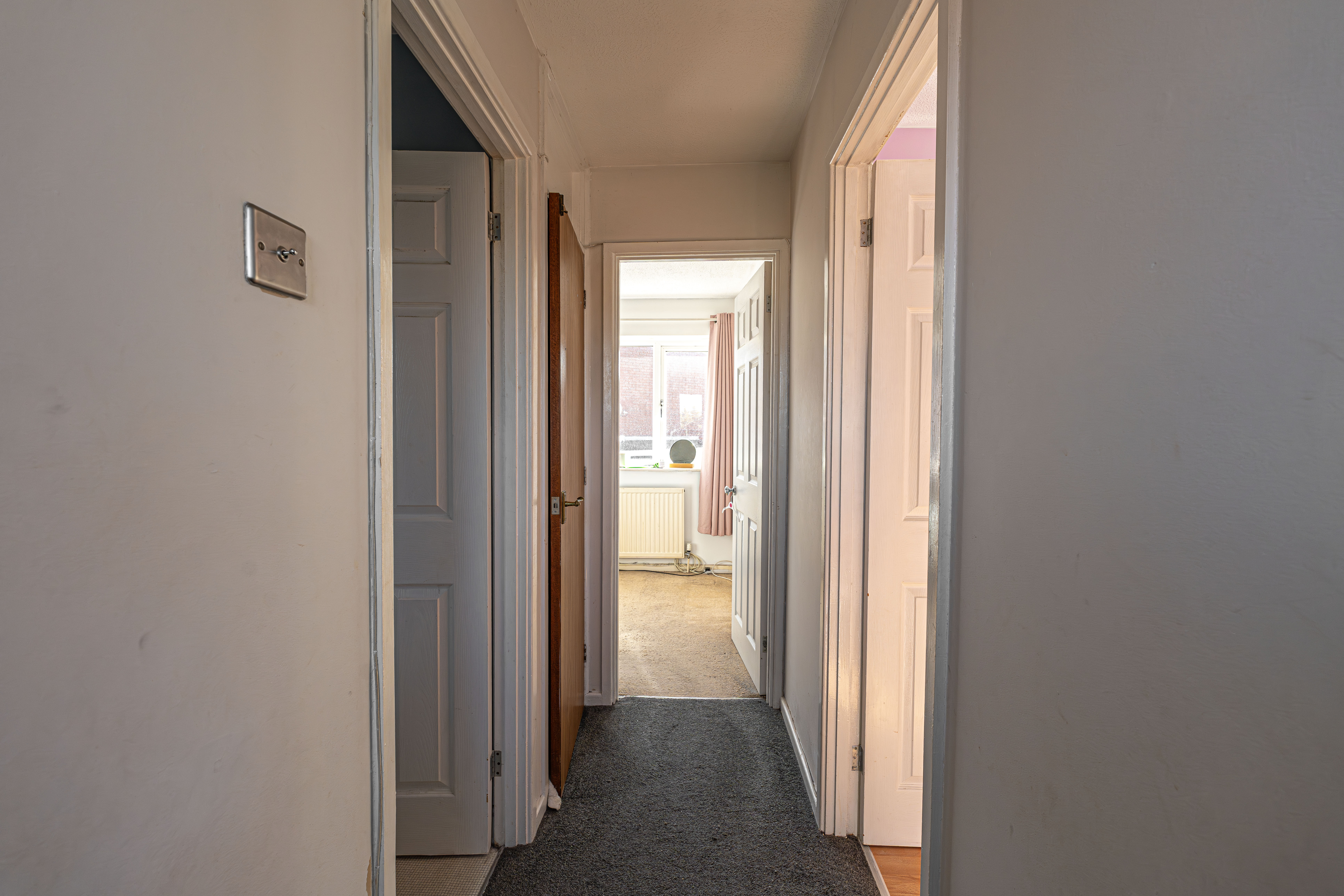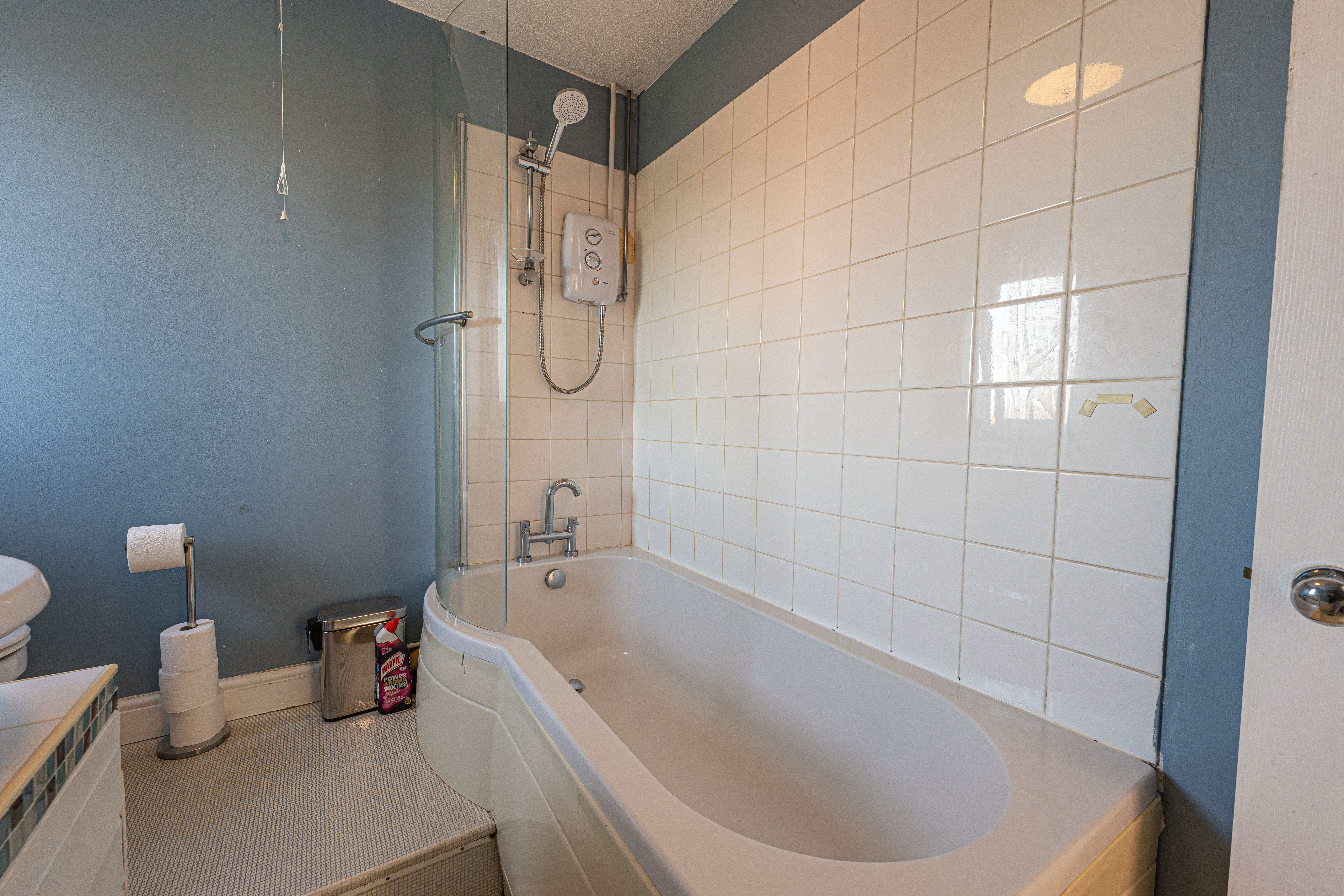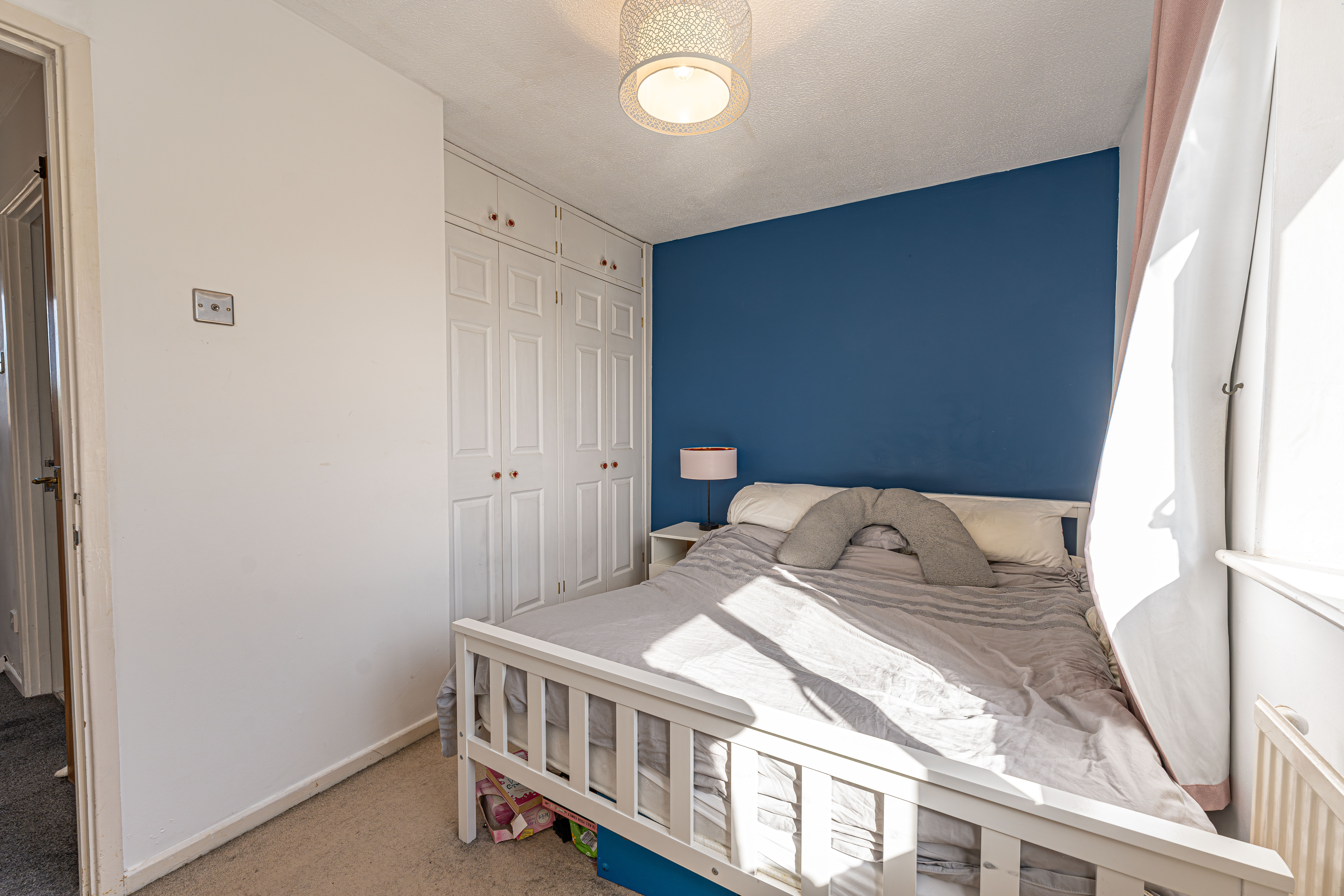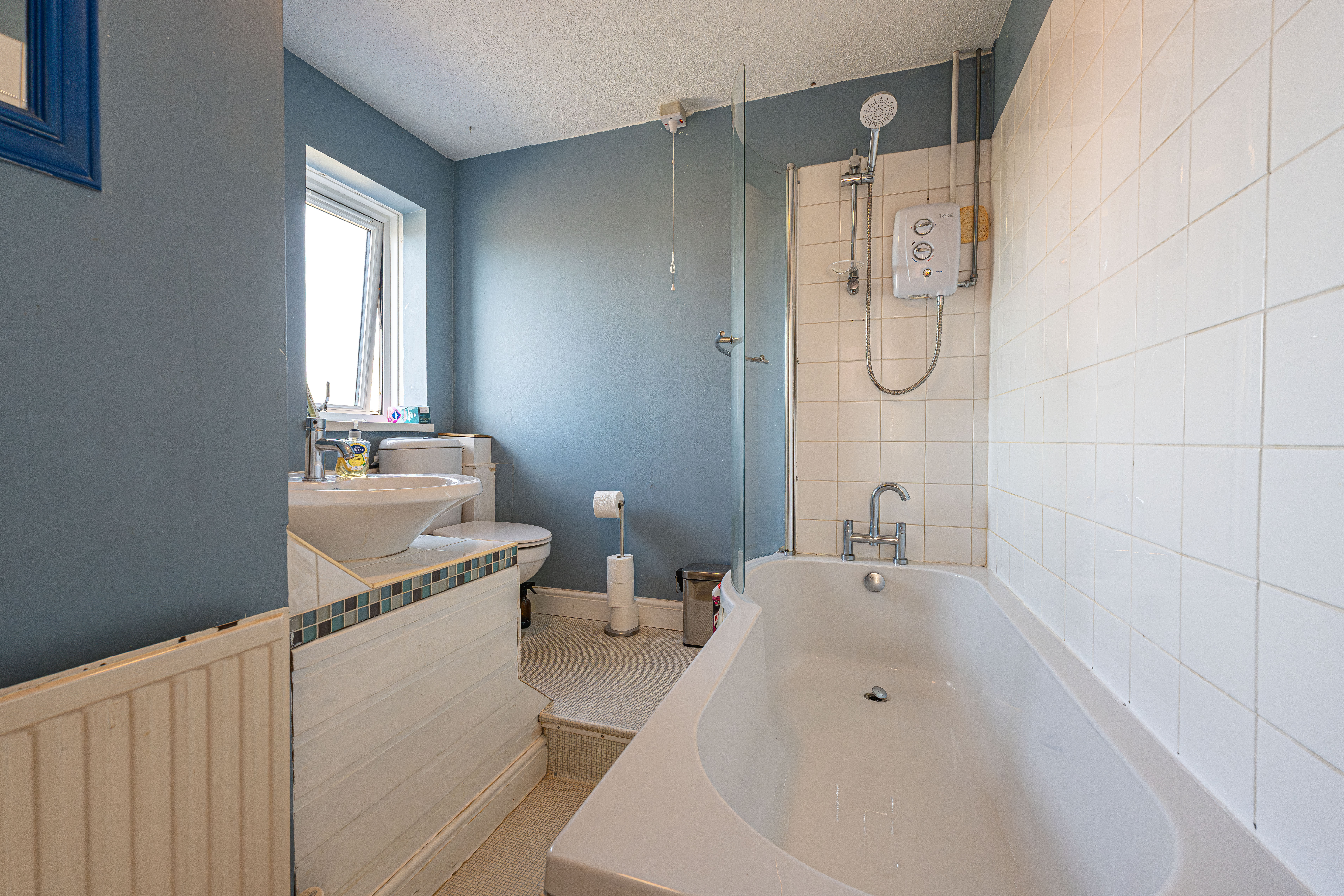 To the first floor we have two double bedrooms, with the primary room enjoying fitted wardrobes for added convenience, whilst from the hallway we can find a communal airing cupboard and the family bathroom, equipped with a bath suite and overhead shower.