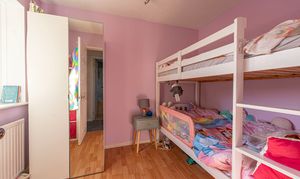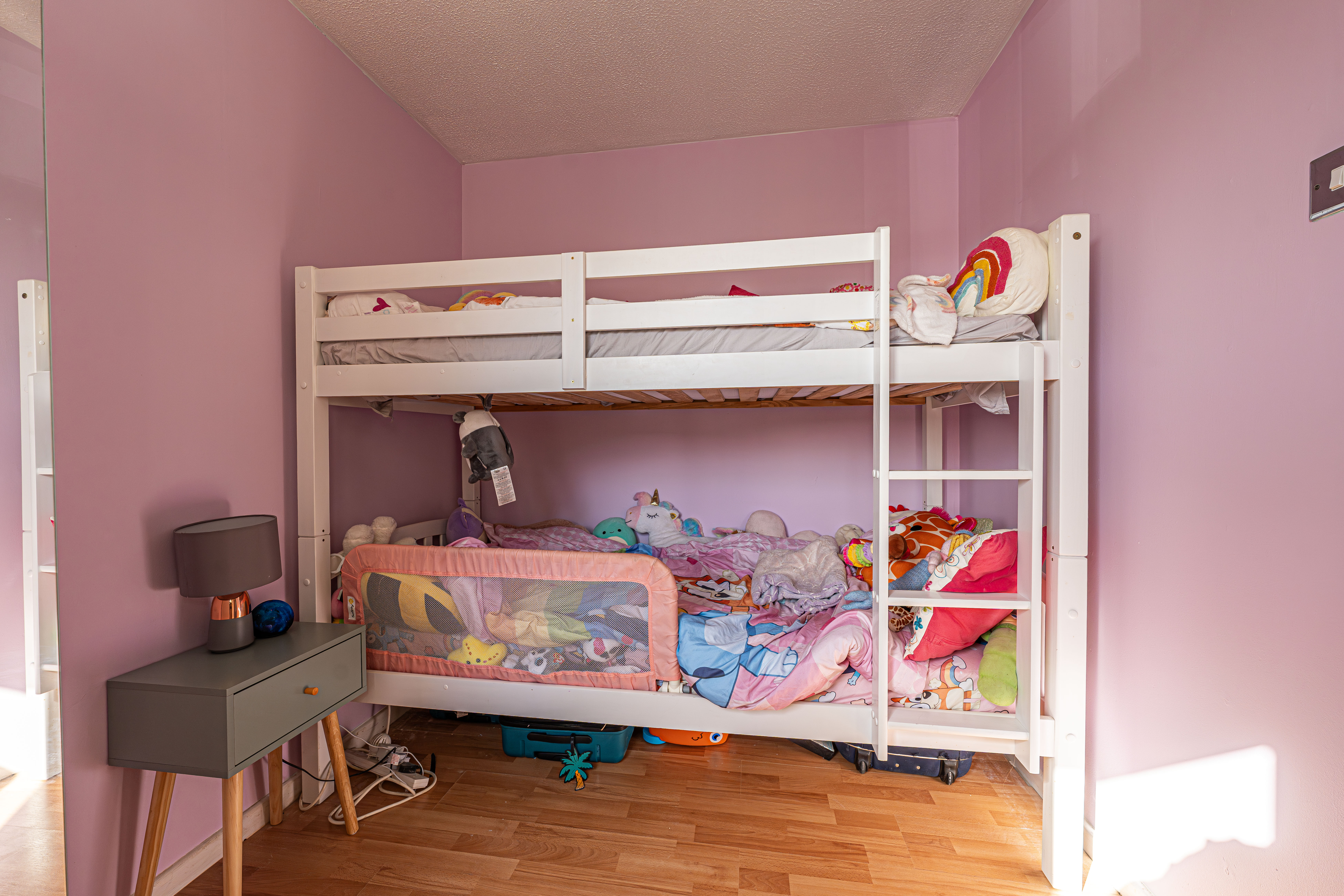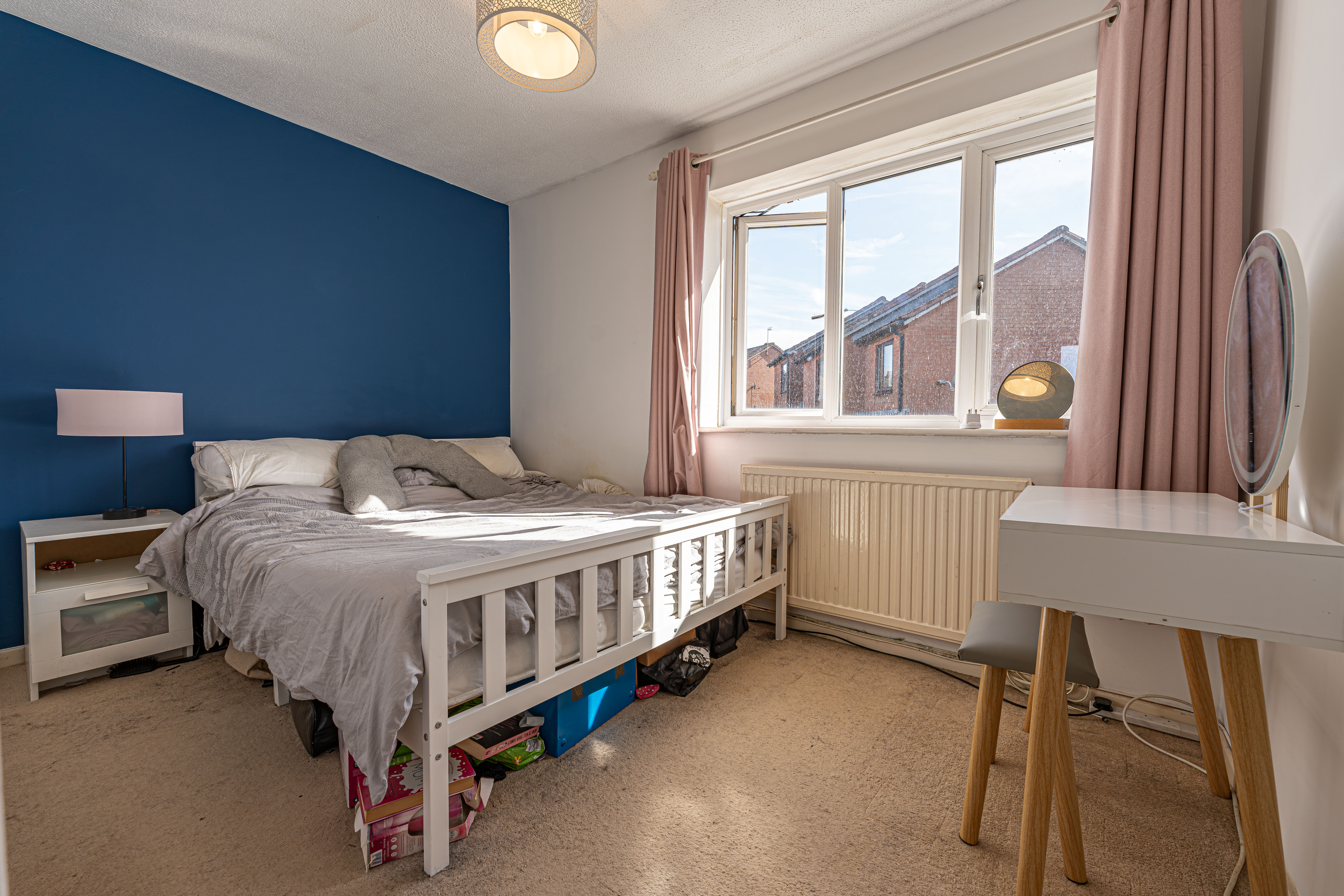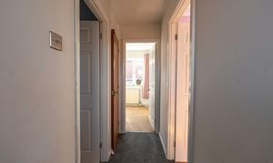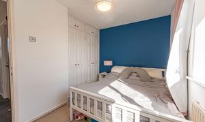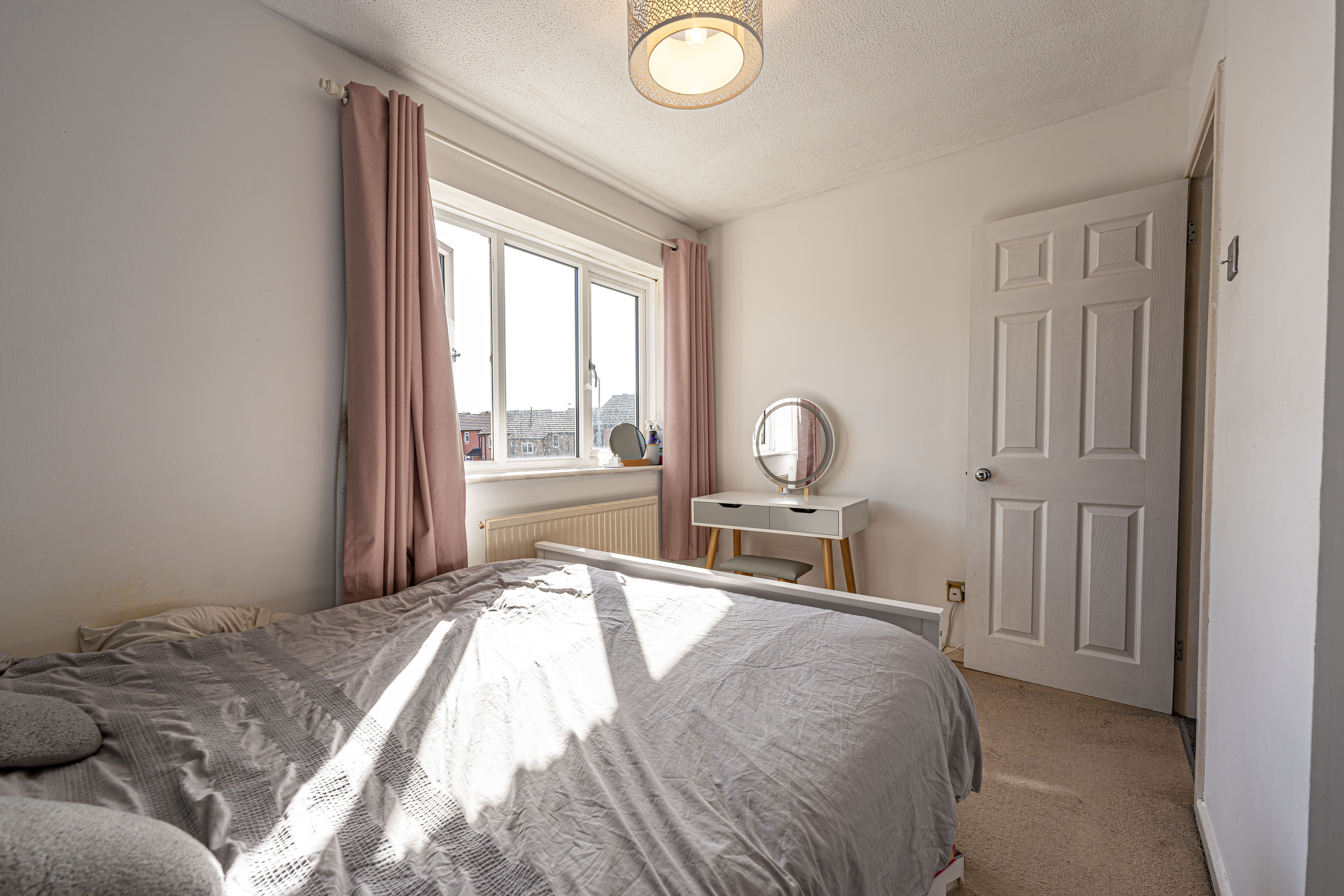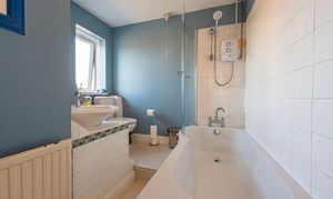 To the first floor we have two double bedrooms, with the primary room enjoying fitted wardrobes for added convenience, whilst from the hallway we can find a communal airing cupboard and the family bathroom, equipped with a bath suite and overhead shower.