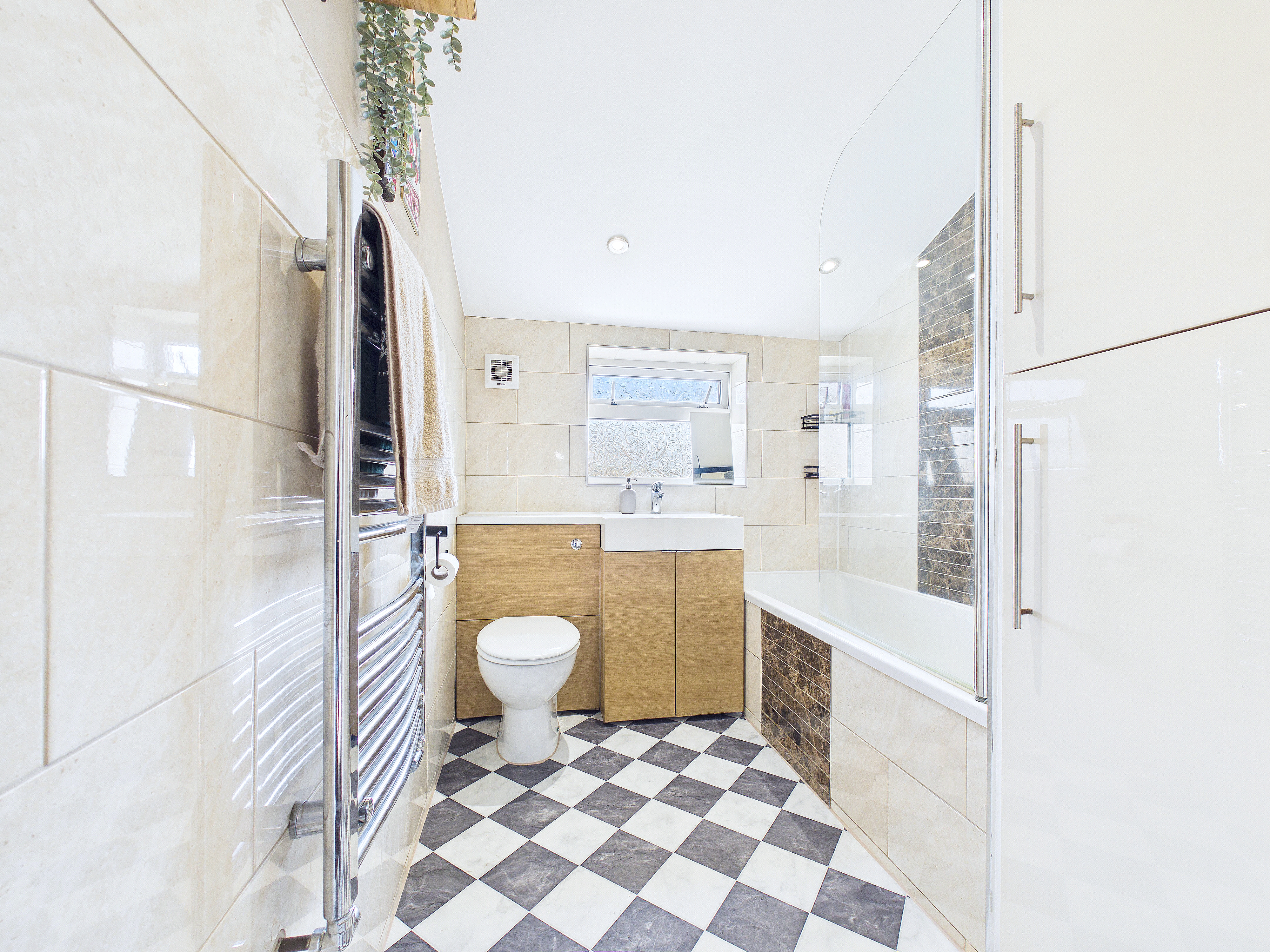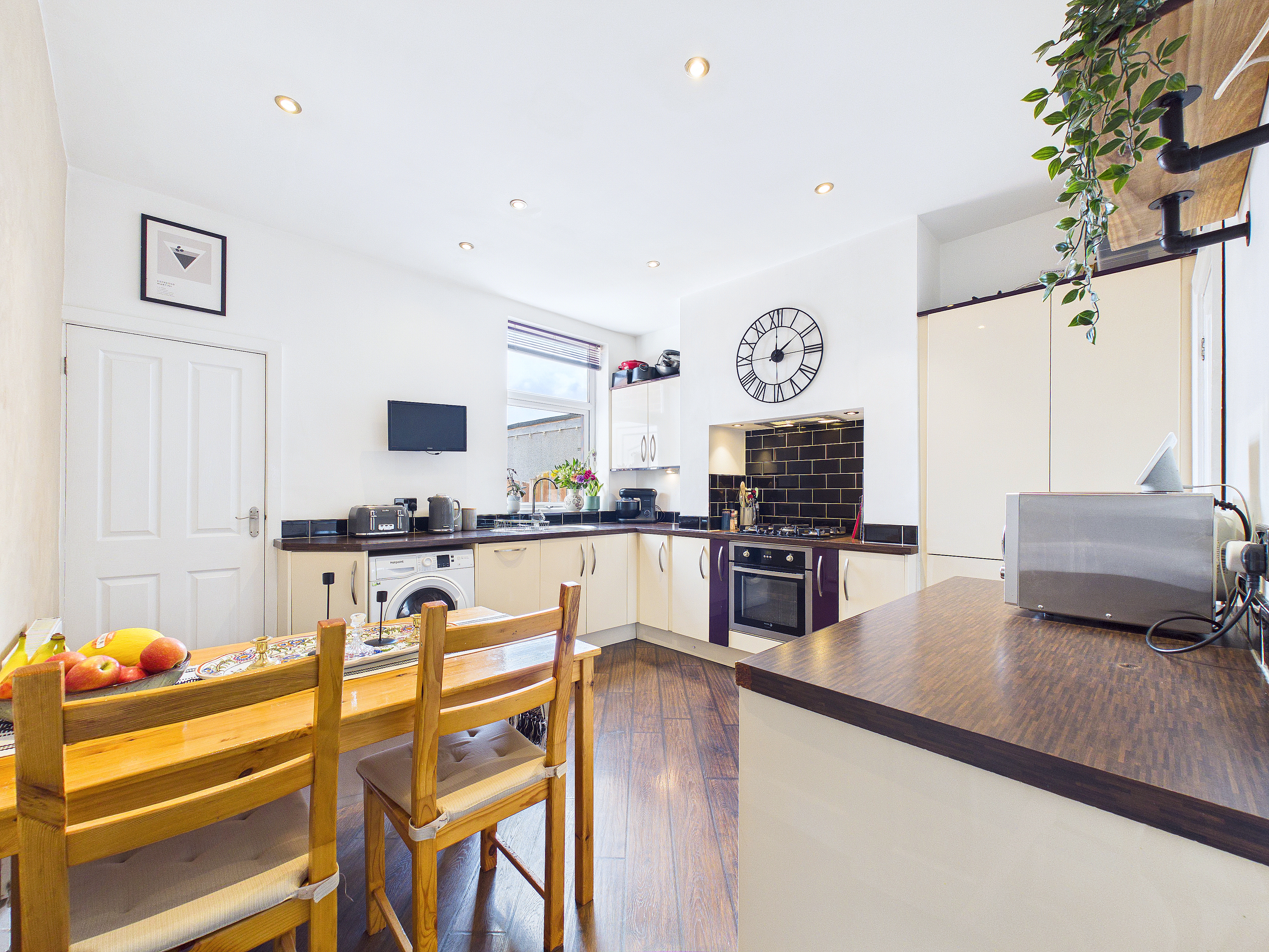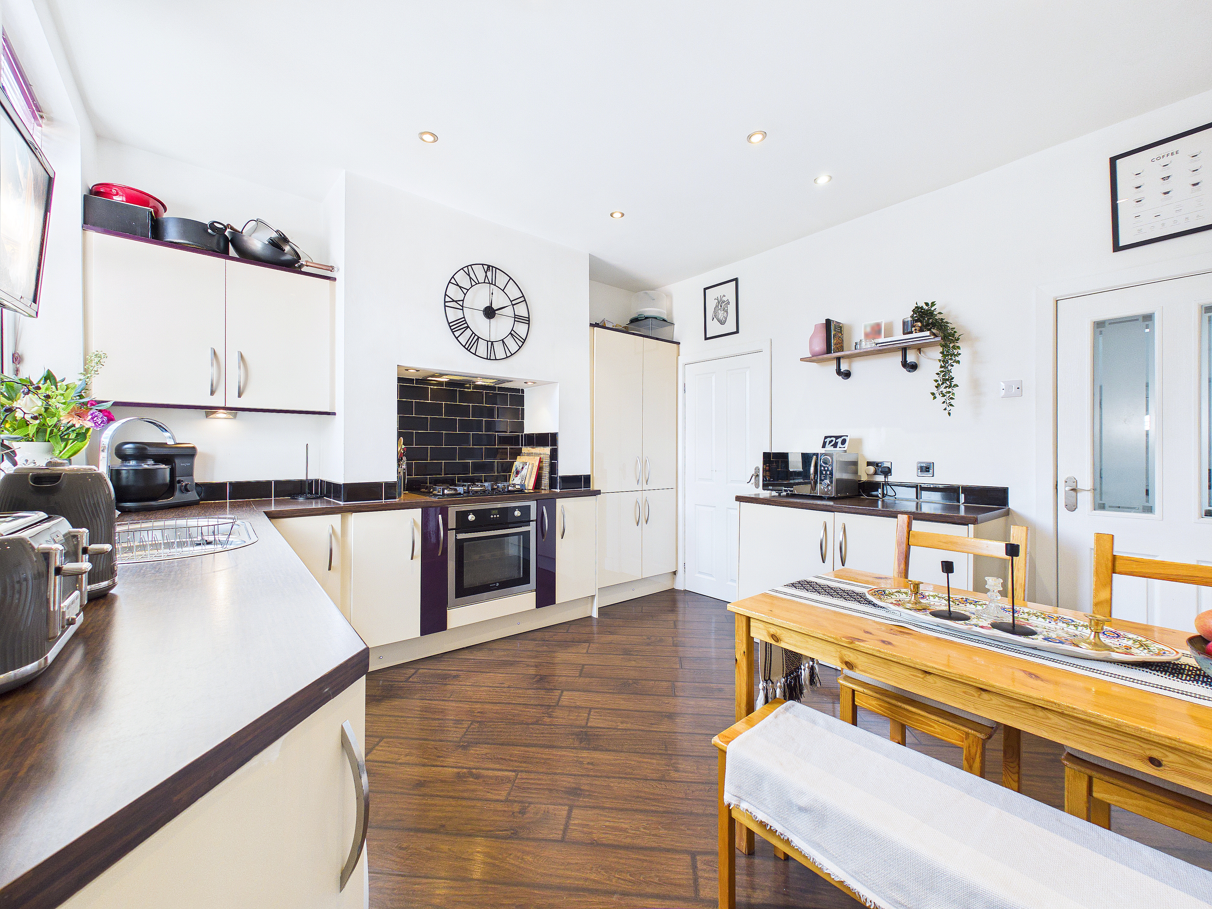 The ground floor features a welcoming living room leading through to a stylish, modern fitted kitchen/diner, complete with integrated dishwasher, hob, and oven, along with designated space for a washing machine. The kitchen also benefits from useful under-stairs storage, ideal for keeping household essentials neatly tucked away. To the rear, the contemporary bathroom boasts a three-piece suite, new flooring, and built-in storage.