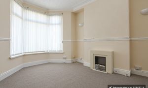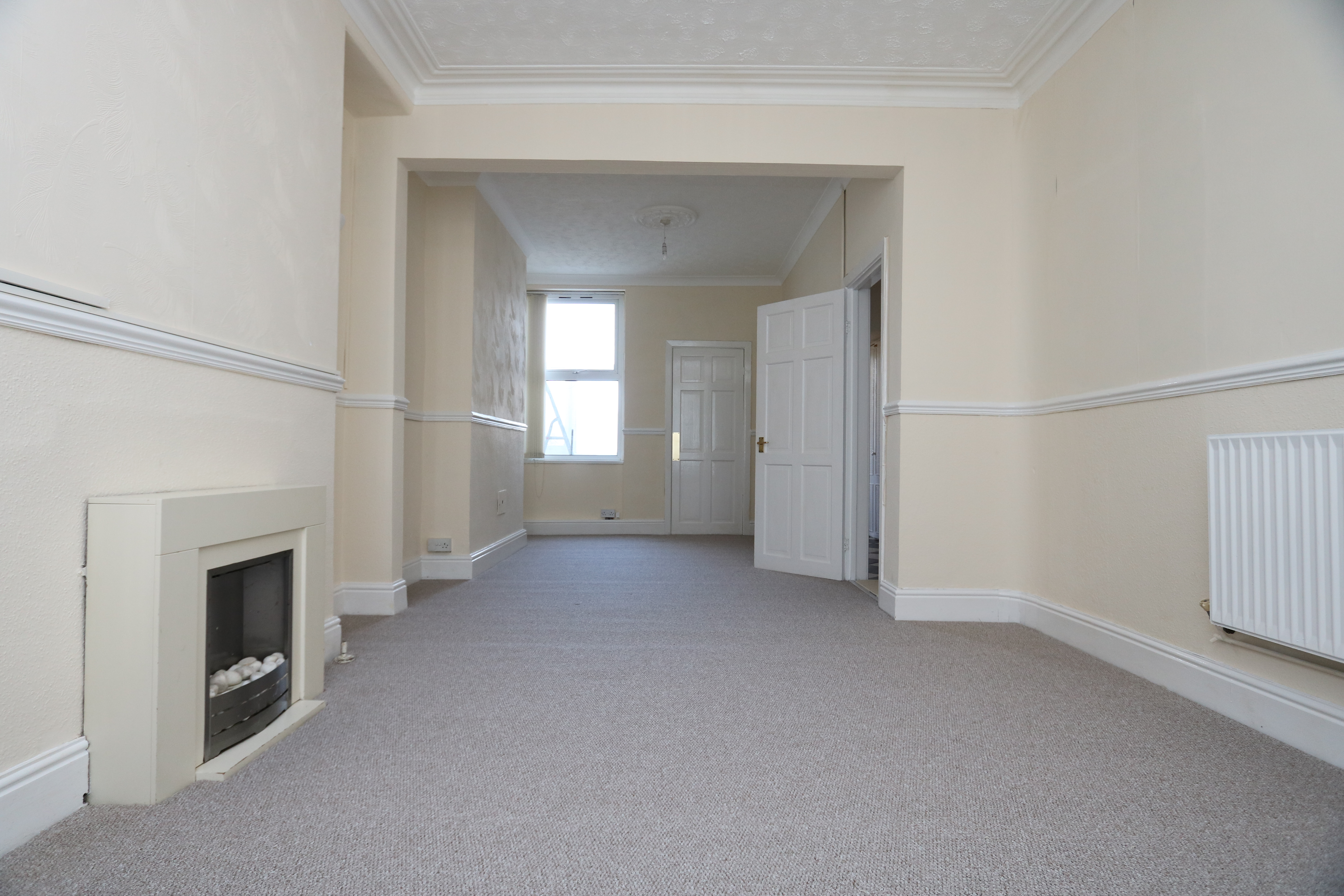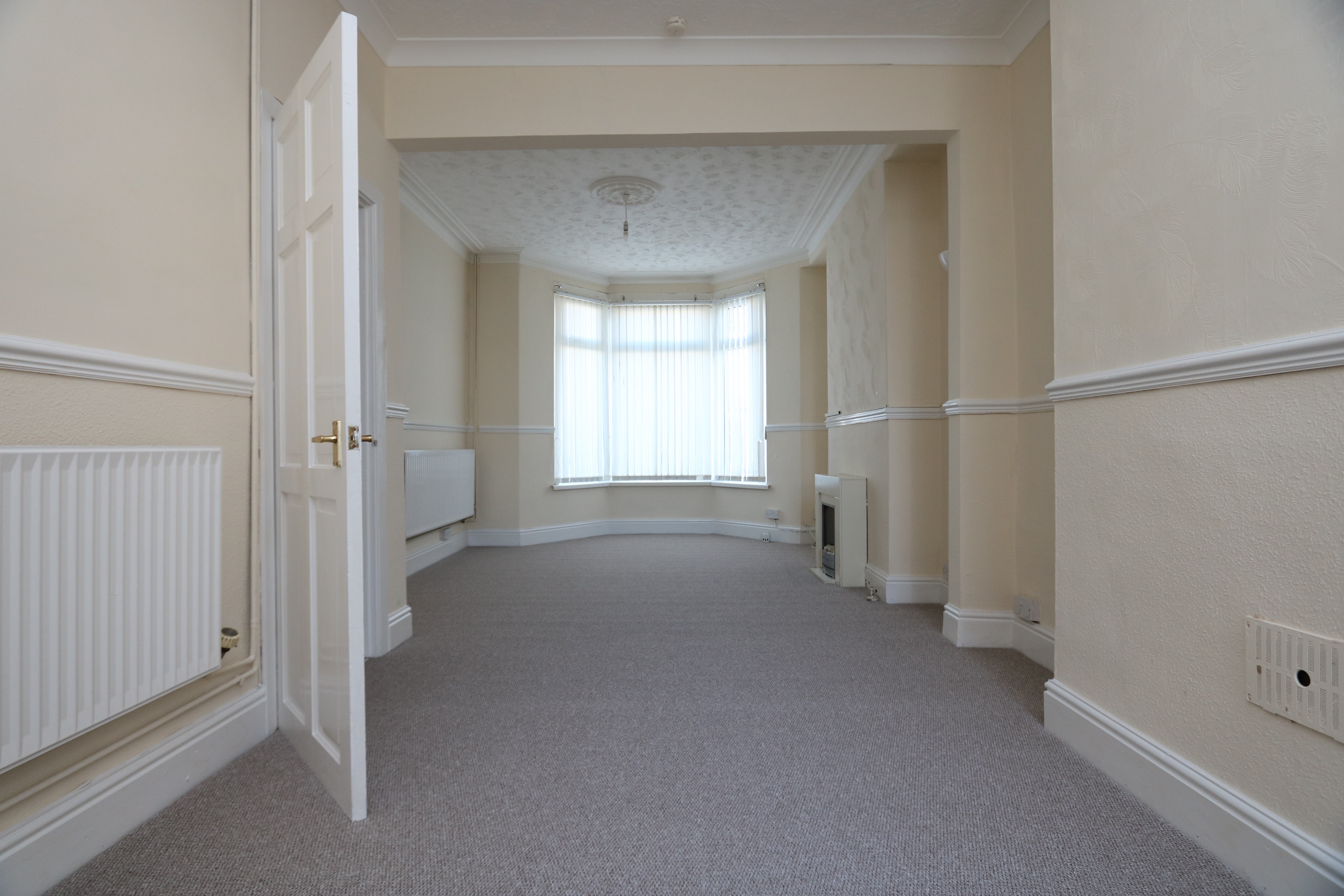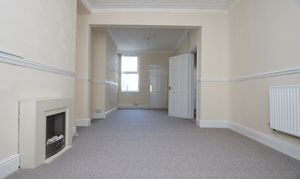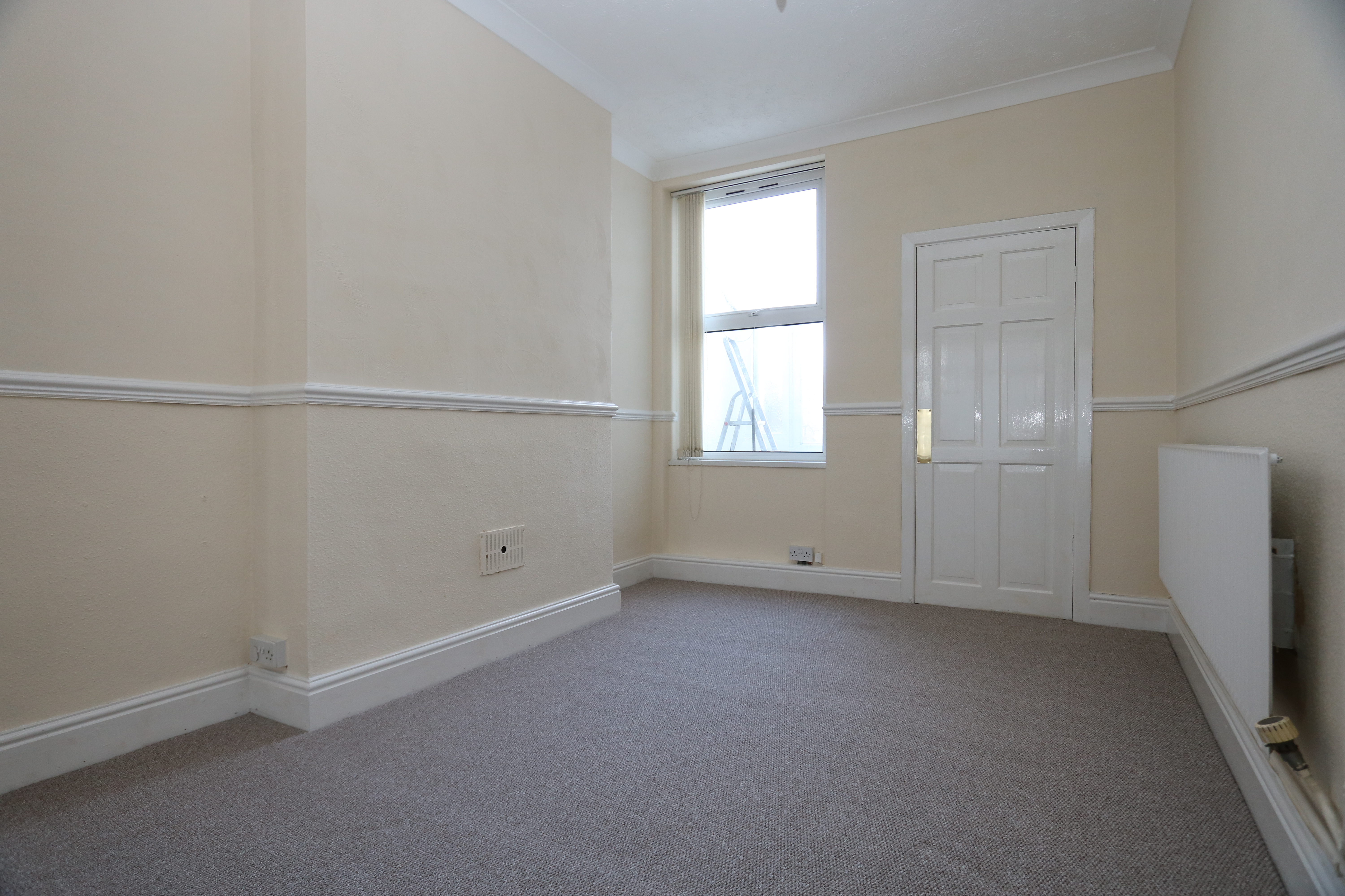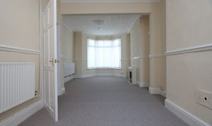 Carpeted, wallpapered walls with dado rails and a textured coved ceiling with period ceiling roses. Two radiators, a front aspect bay window and a rear aspect window. There is a door leading through into the kitchen, but this has now been sealed off. The dining area narrows to 2.86m. Measurements have been taken into the bay and into the recesses either side of the chimney breasts.