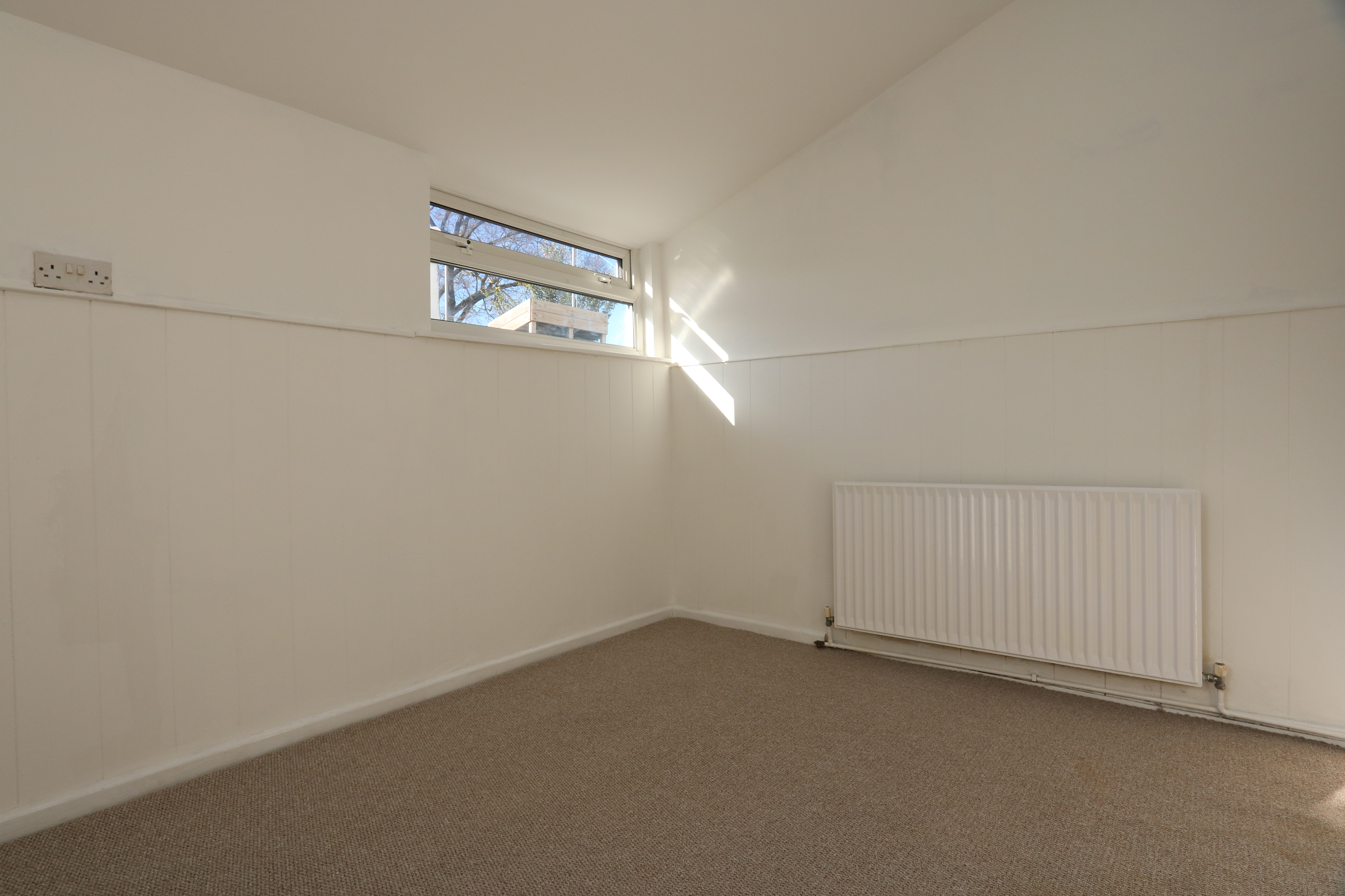 Carpeted with papered walls and a smooth ceiling. A rear aspect window and a radiator.