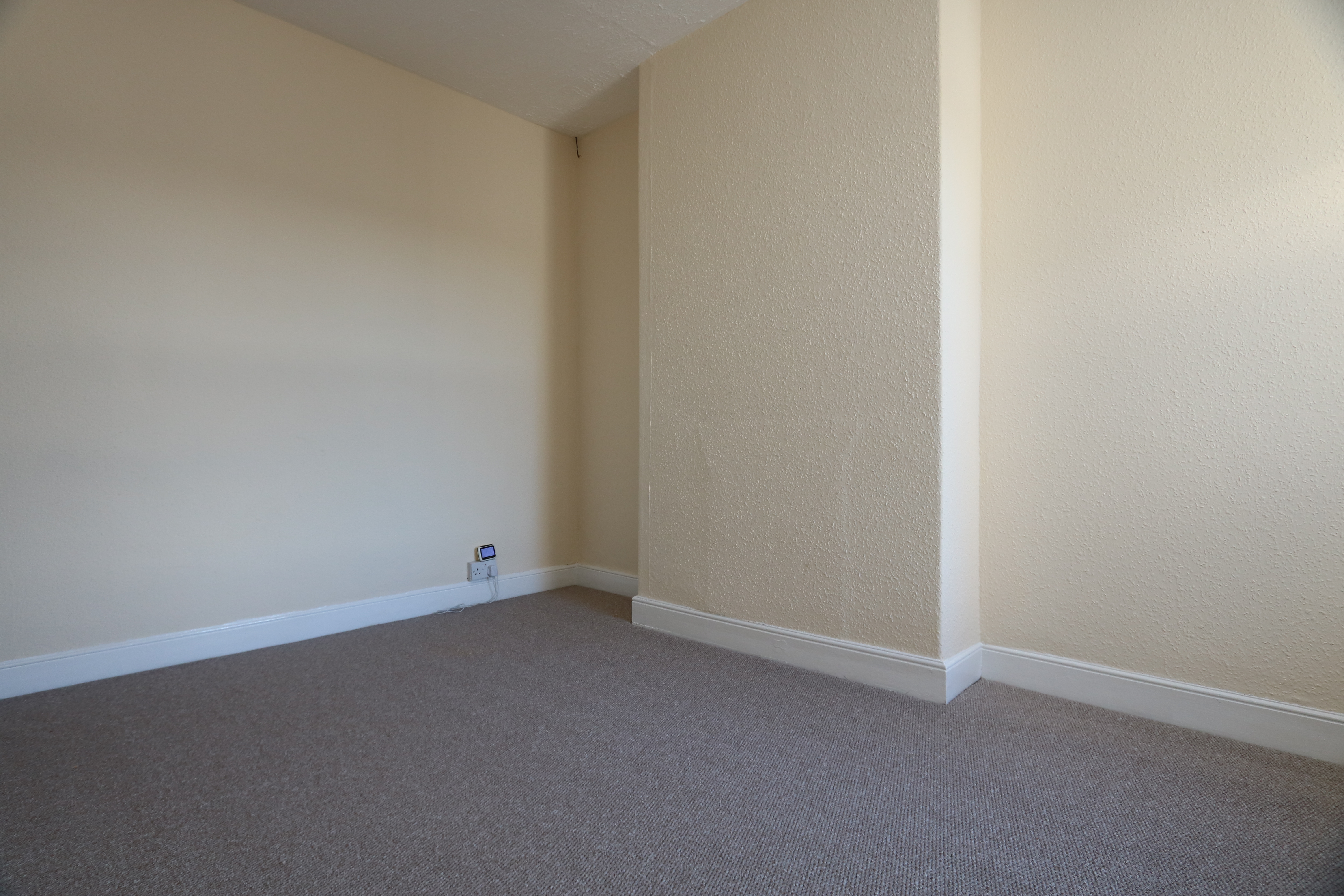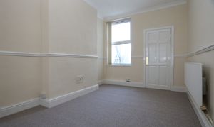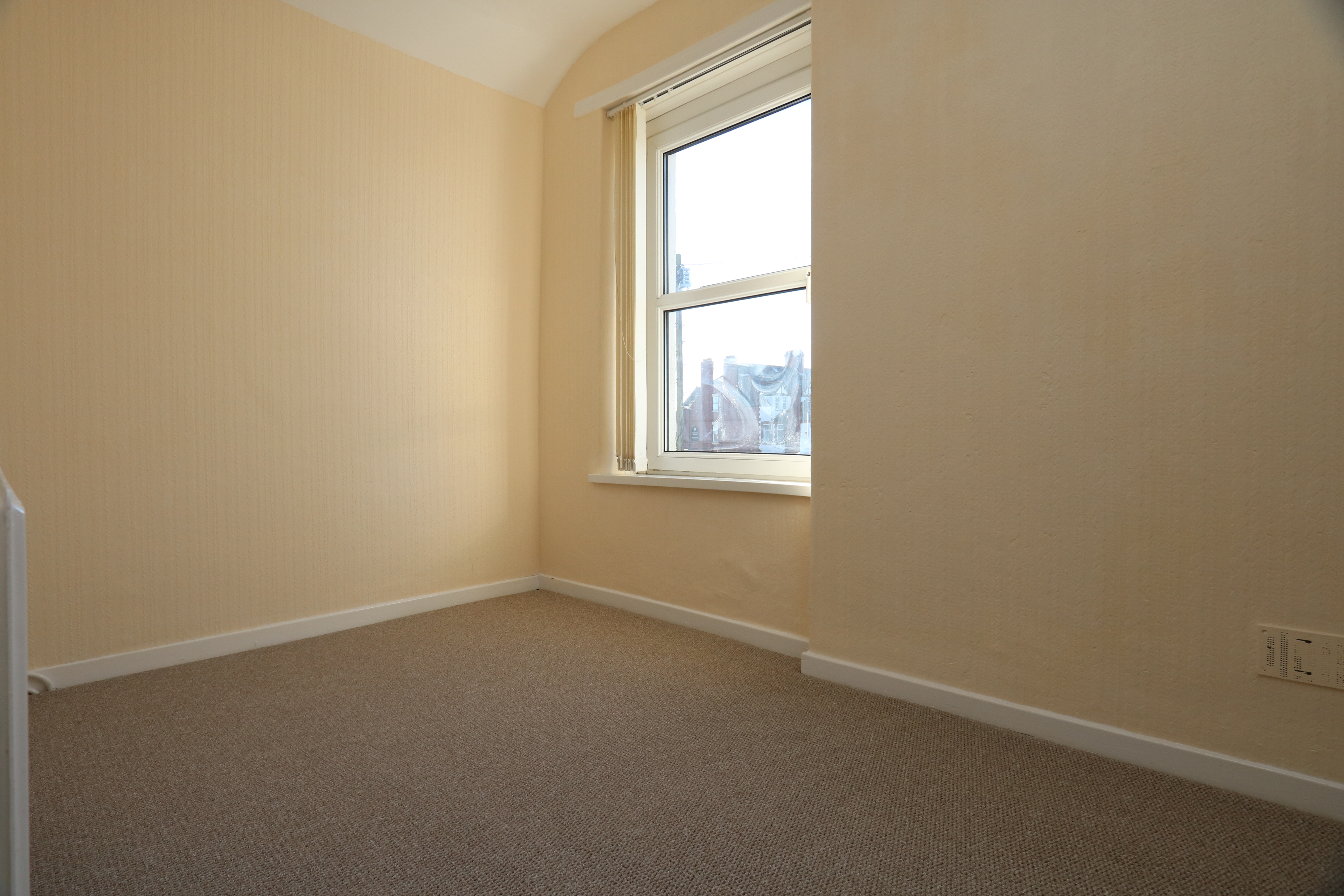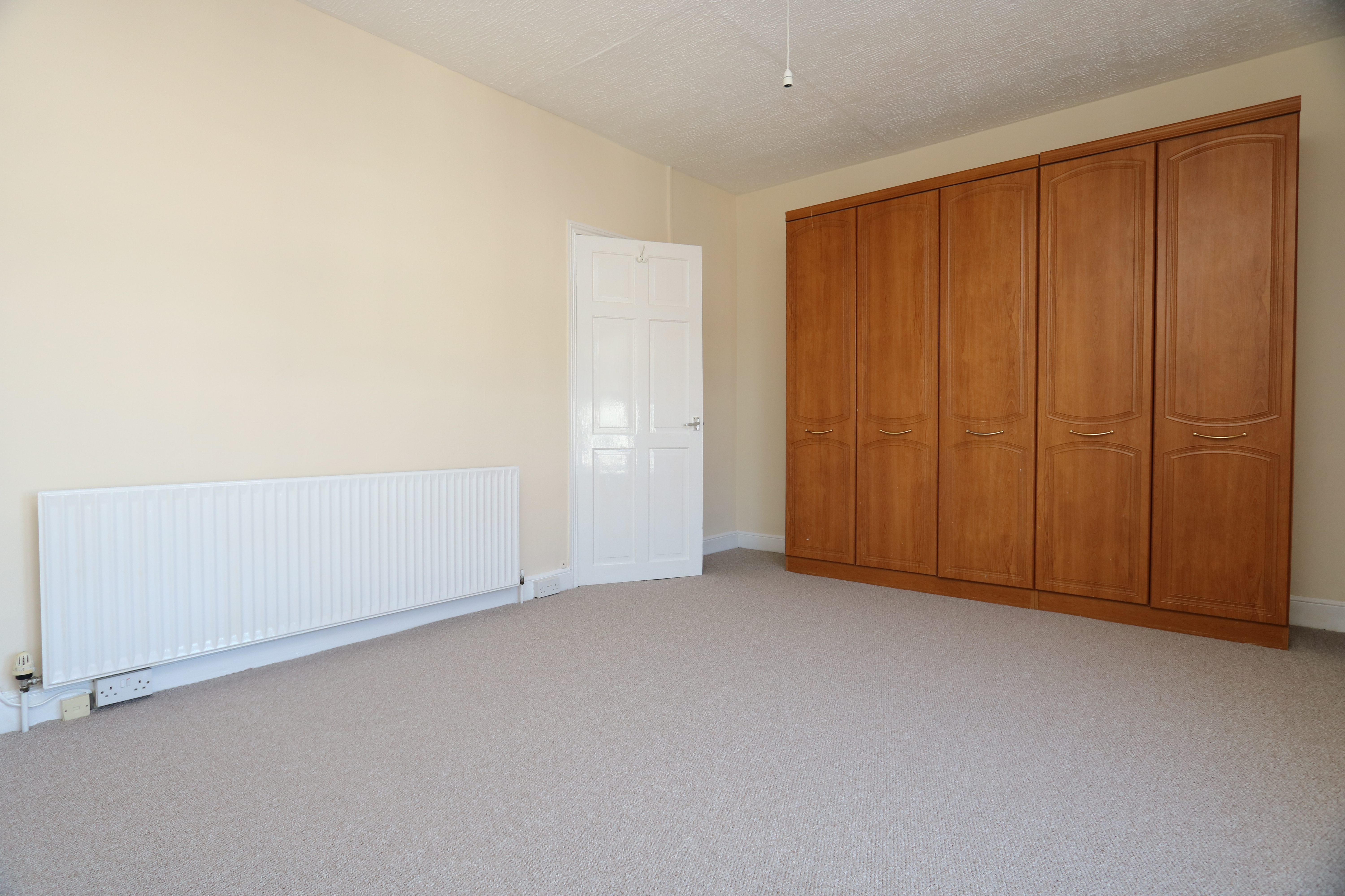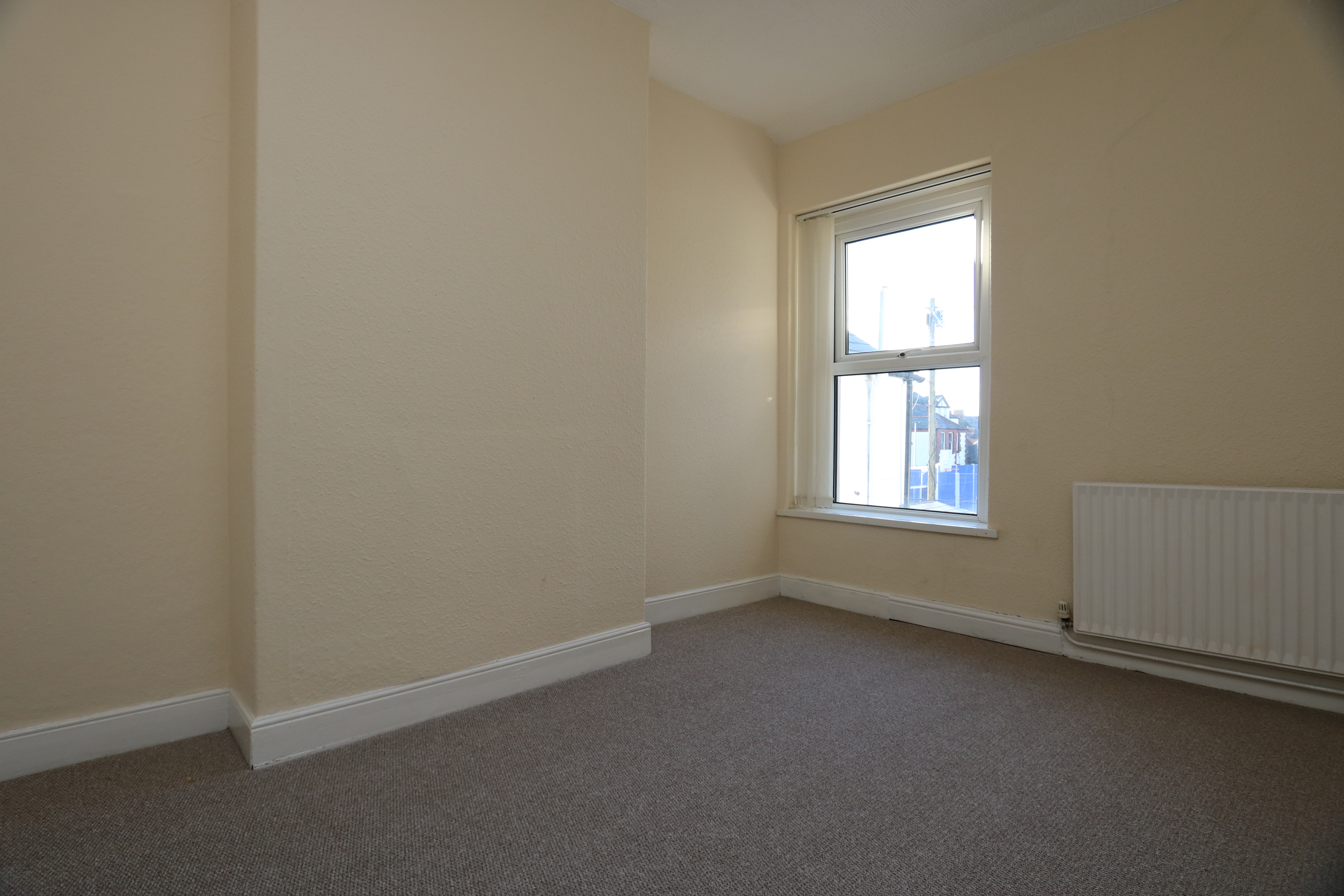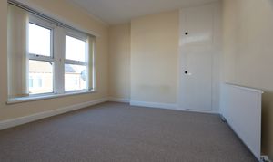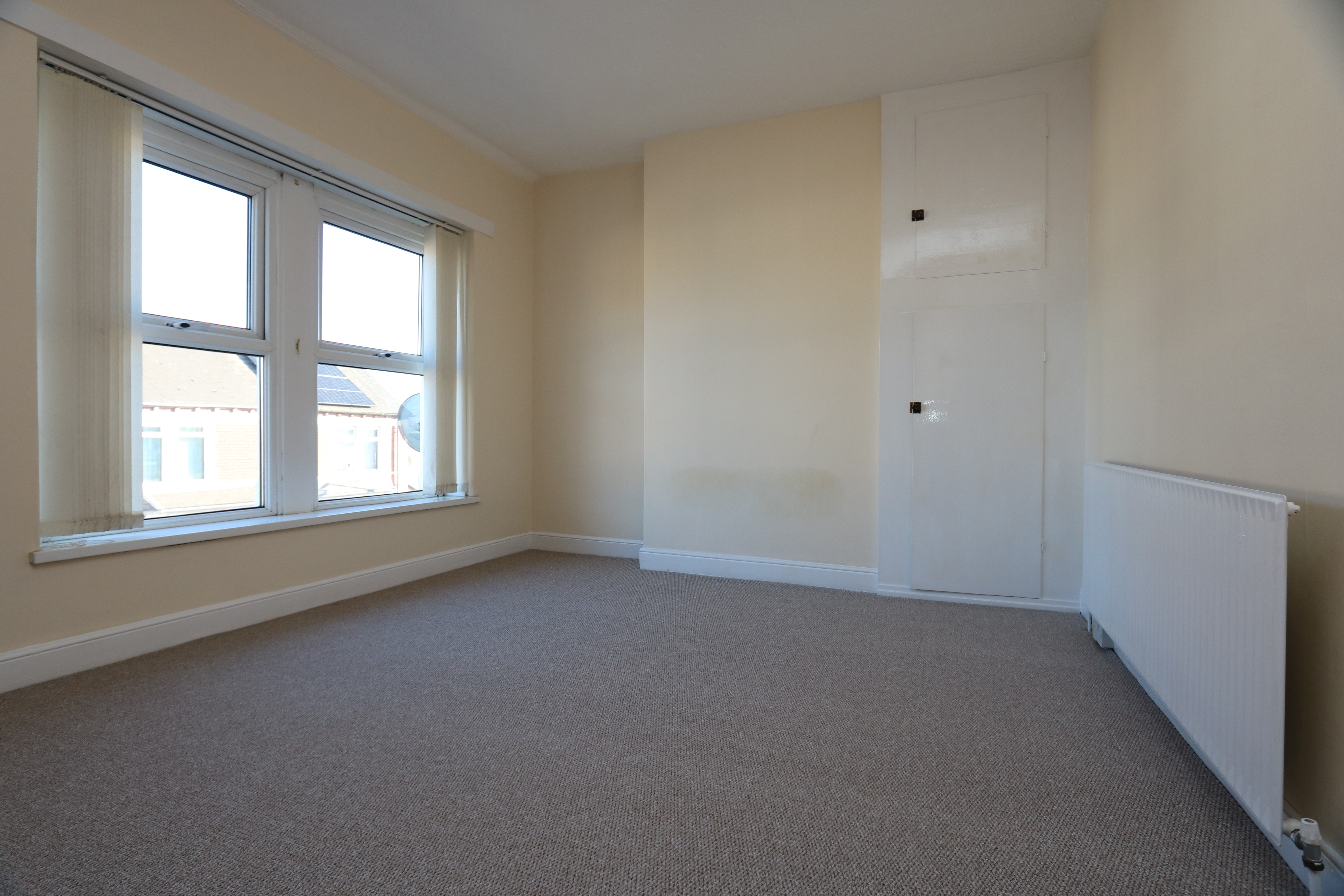 Carpeted with smooth walls and a textured ceiling. A radiator and two front aspect windows with distant sea views. A storage cupboard to the recess to the right of the chimney breast.