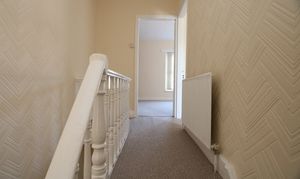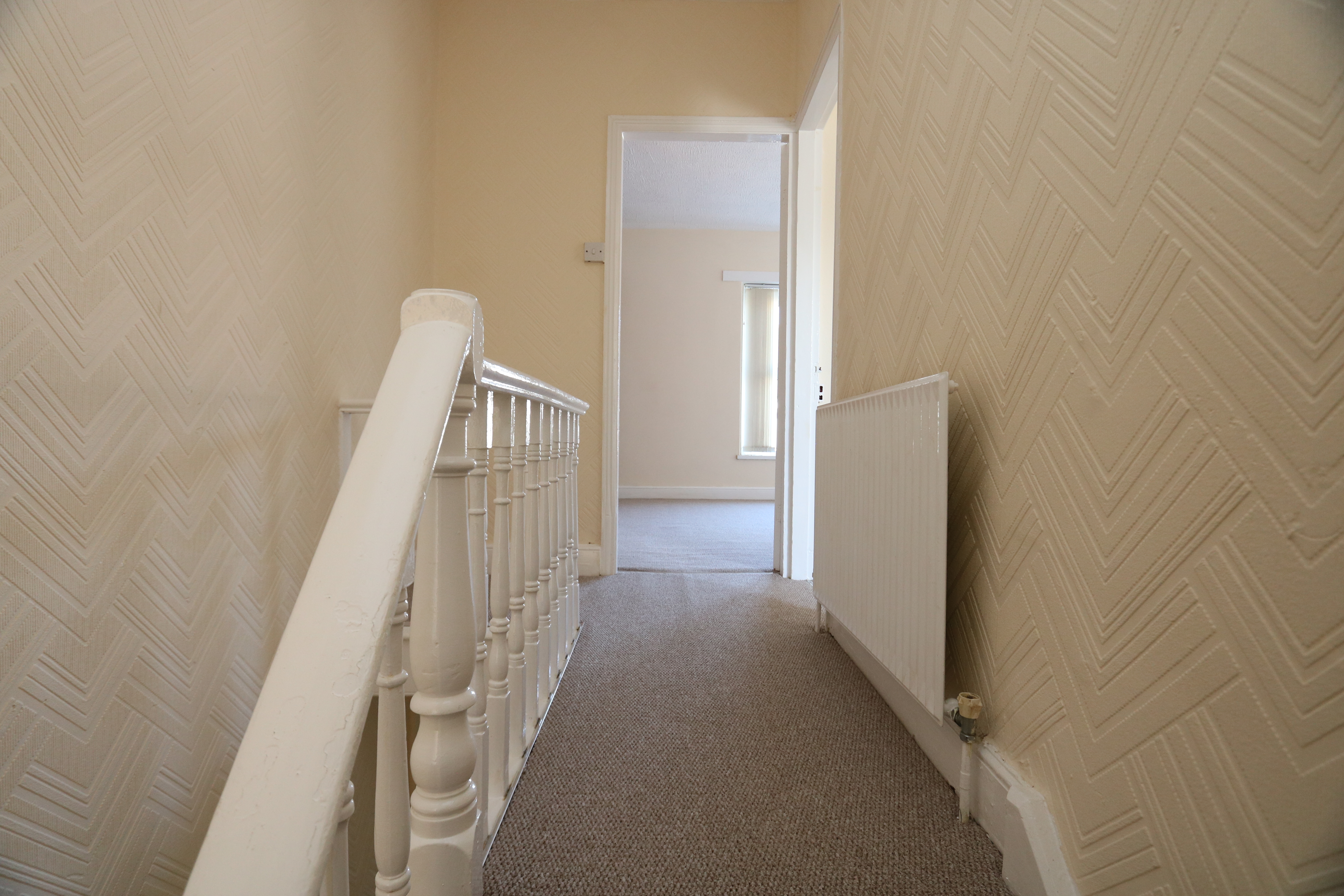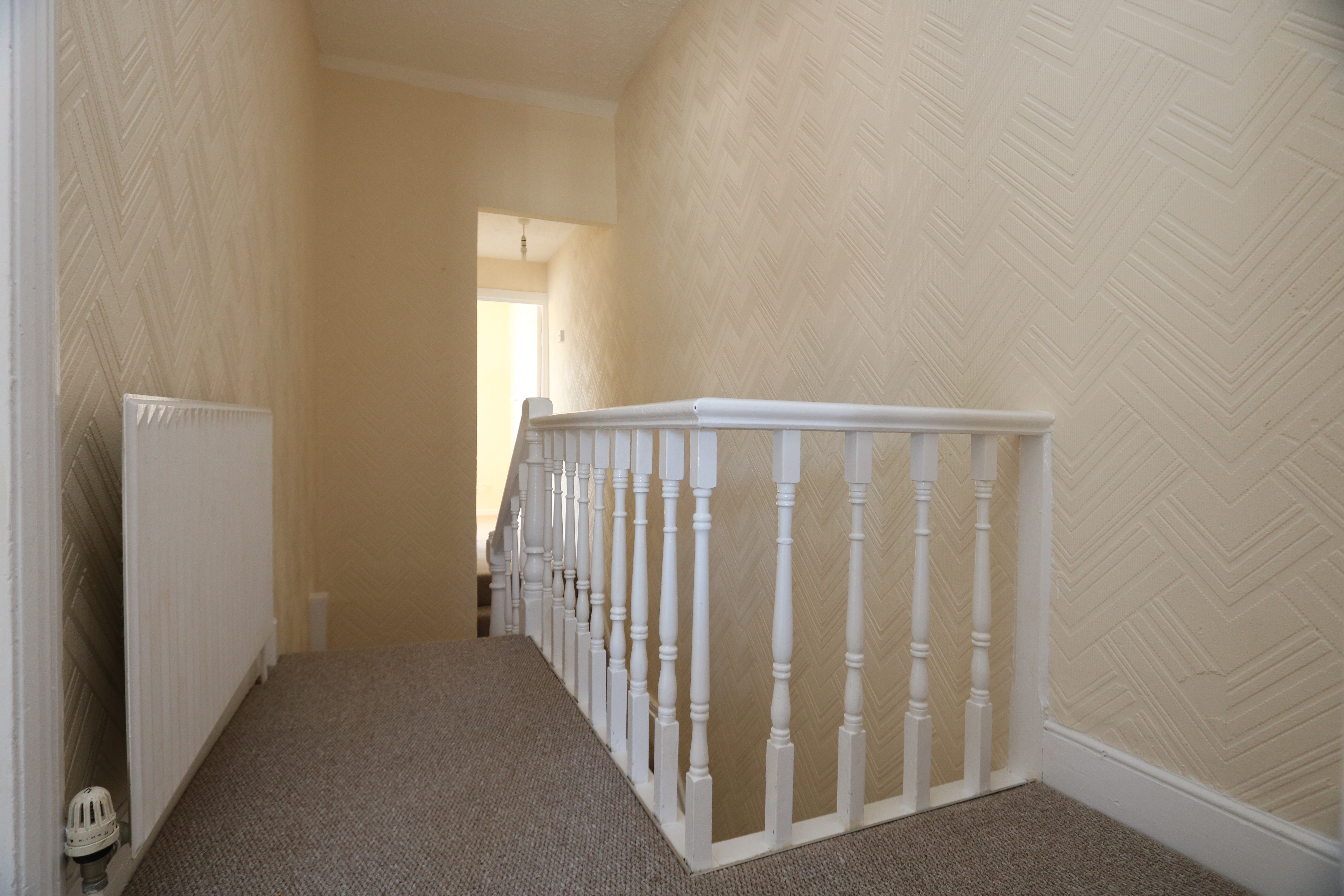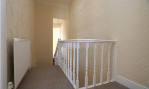 A carpeted staircase leads to a carpeted landing with papered walls and a textured ceiling. A radiator, a wooden balustrade and doors giving access to three bedrooms and a family bathroom. Loft access.