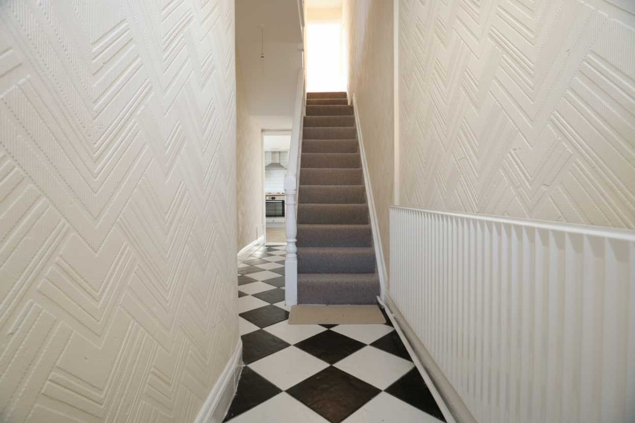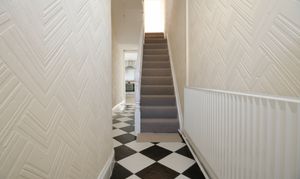 Access into the property via a wooden front door with opaque glazing into an entrance hallway. The hallway has an initial matwell, tiled flooring, wallpapered walls and a textured coved ceiling. There is also a period ceiling arch, a radiator and a carpeted staircase giving access to the first floor. Doors lead off to the lounge/diner and the kitchen. Double doors give access to understairs storage.