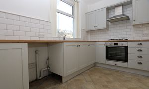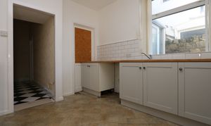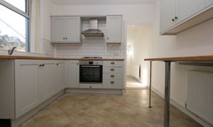 Vinyl tile effect flooring, smooth walls and a textured ceiling. A modern kitchen comprising a good selection of matching eye and base level units with a complementing wood effect worktops. There is a stainless steel one and a half bowled sink inset. Integrated appliances include a single electric oven, a four ring stainless steel gas hob and a stainless steel extractor hood. Space and plumbing for a washing machine. A side aspect window and a radiator. Open to the sun room.