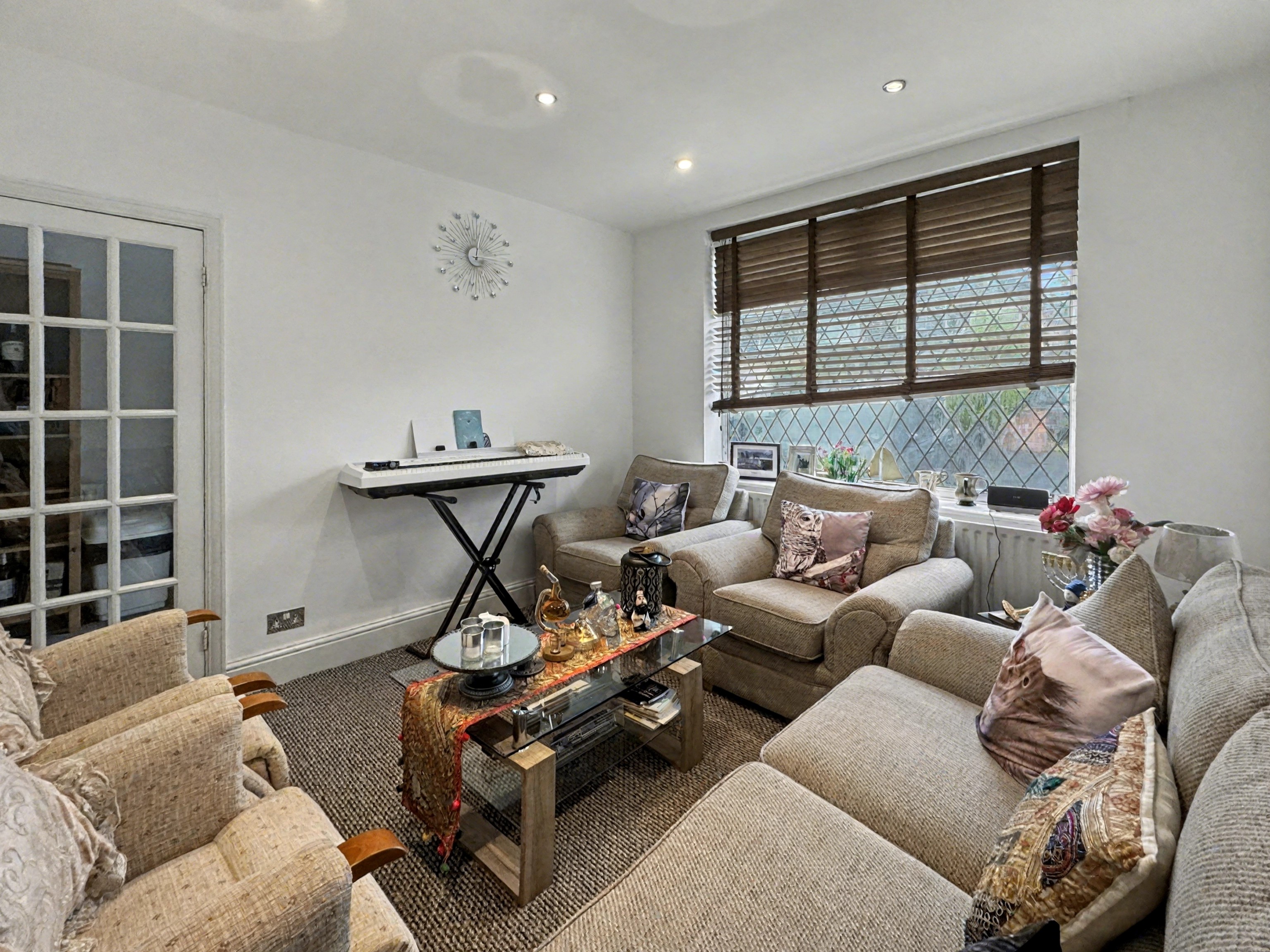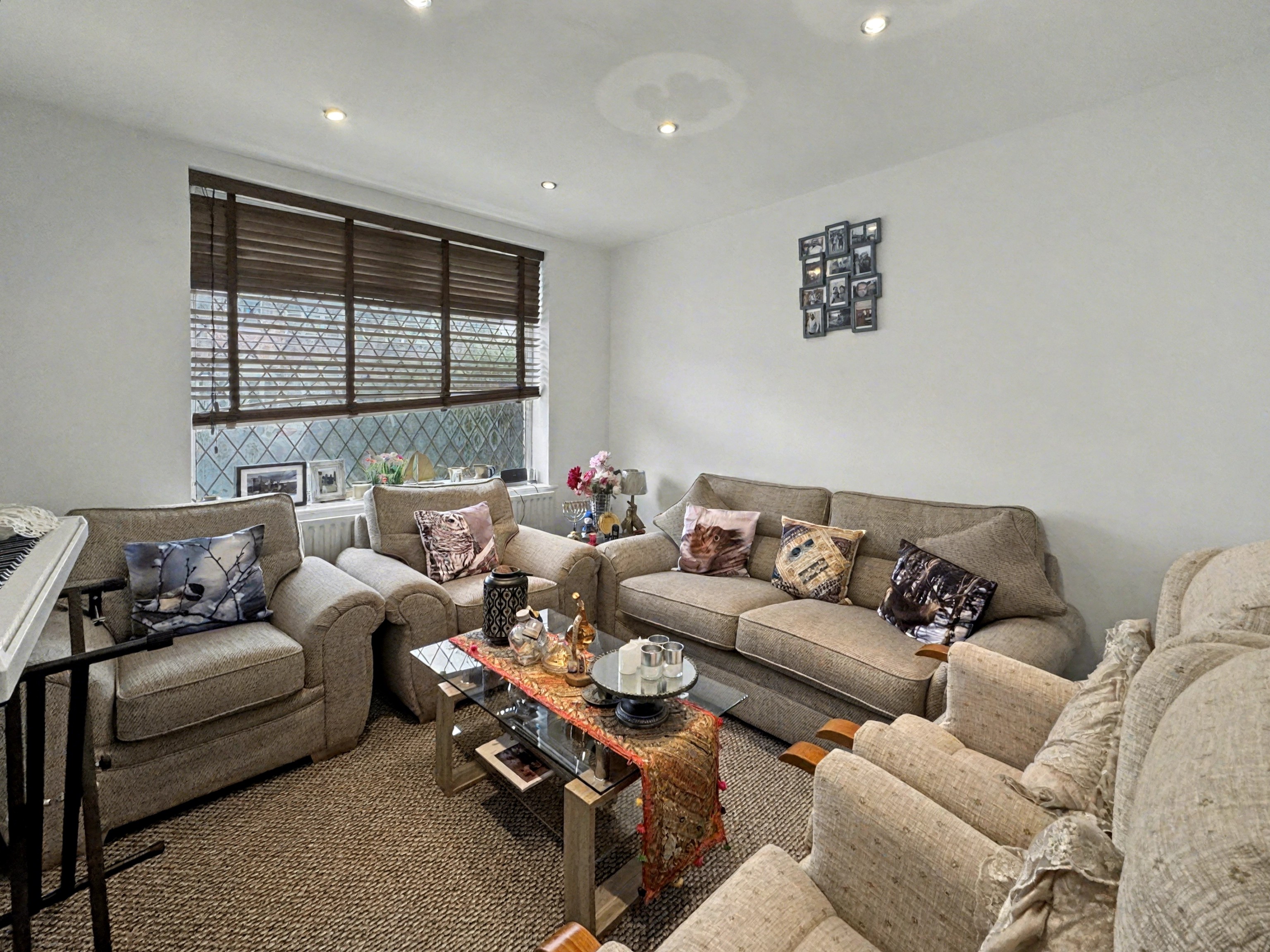 Stepping inside, you are greeted by a generously proportioned reception room, featuring a spacious seating area complemented by comfortable sofas, armchairs, and modern recessed lighting. Large windows with stylish blinds fill the living spaces with natural light, while the neutral decor creates a warm and inviting atmosphere perfect for relaxation or entertaining guests.