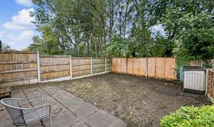 Externally, the private garden is enclosed by wooden fencing for privacy and is thoughtfully designed with a paved patio area, perfect for outdoor seating or entertaining. Mature trees provide a tranquil, green backdrop, making this outdoor space a true extension of the home.