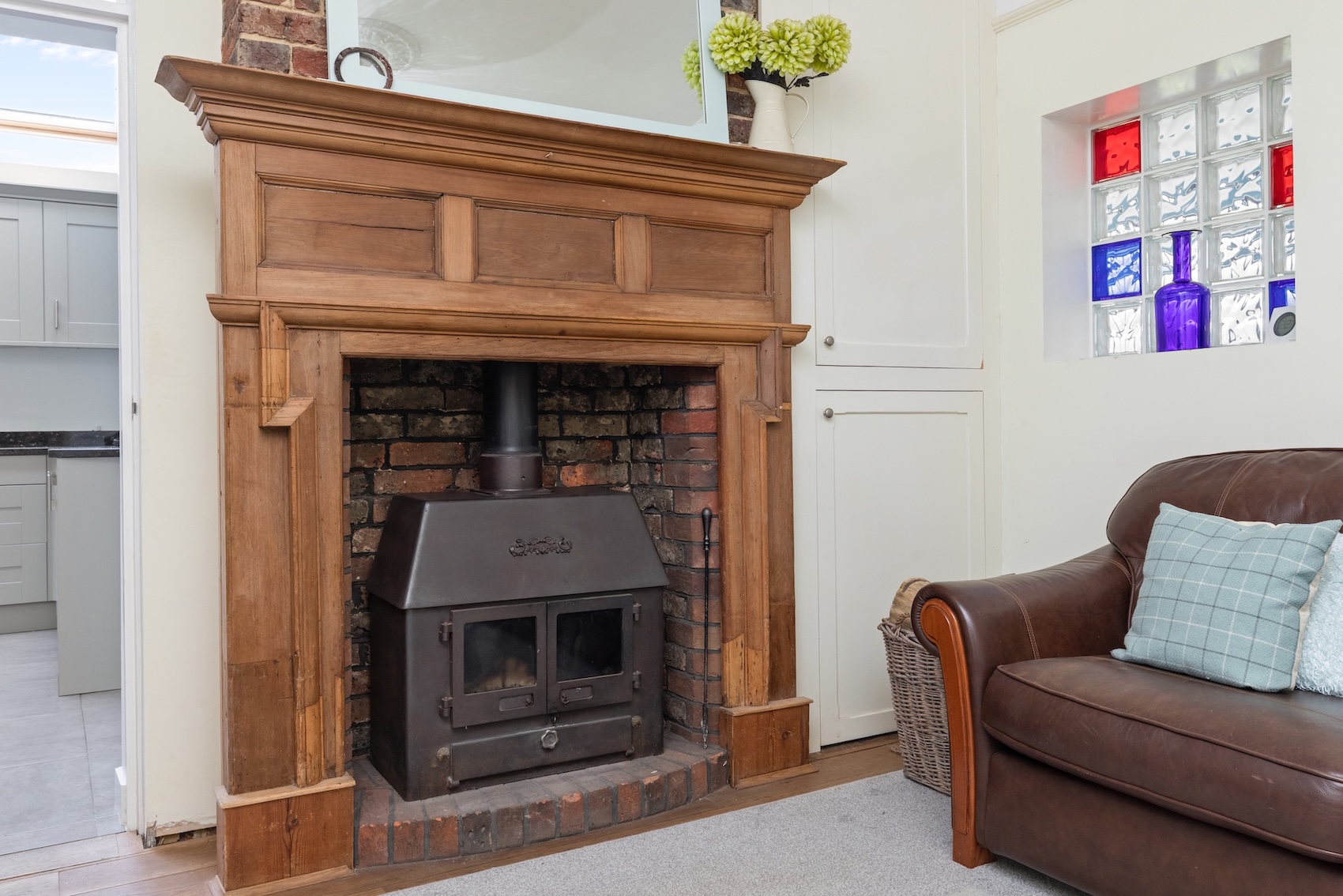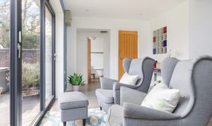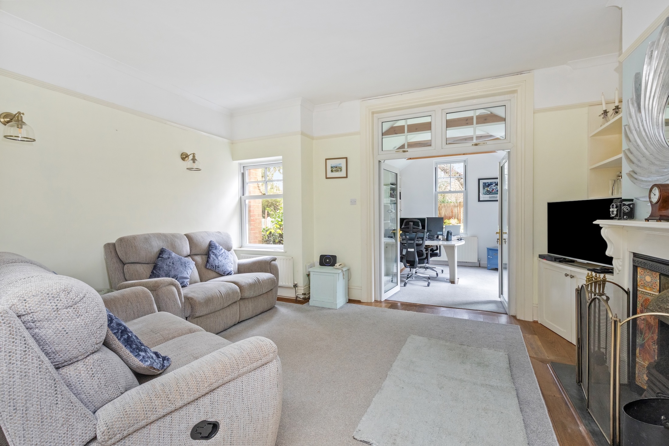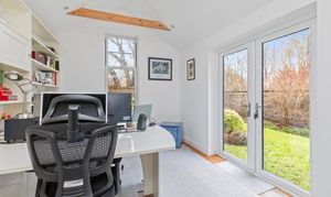 A door leads into the snug with under-stairs storage and wood burner, sitting room with open fireplace and the vaulted study/office with French doors onto the lawned garden.