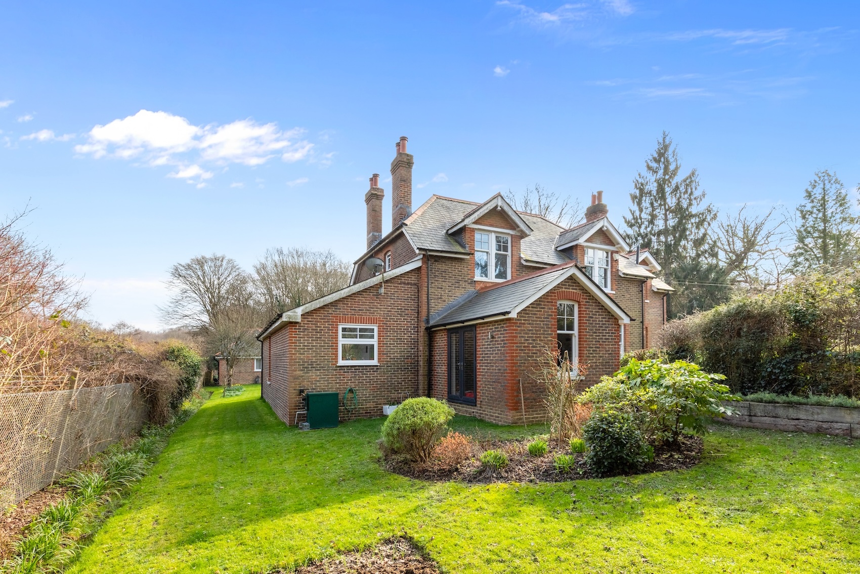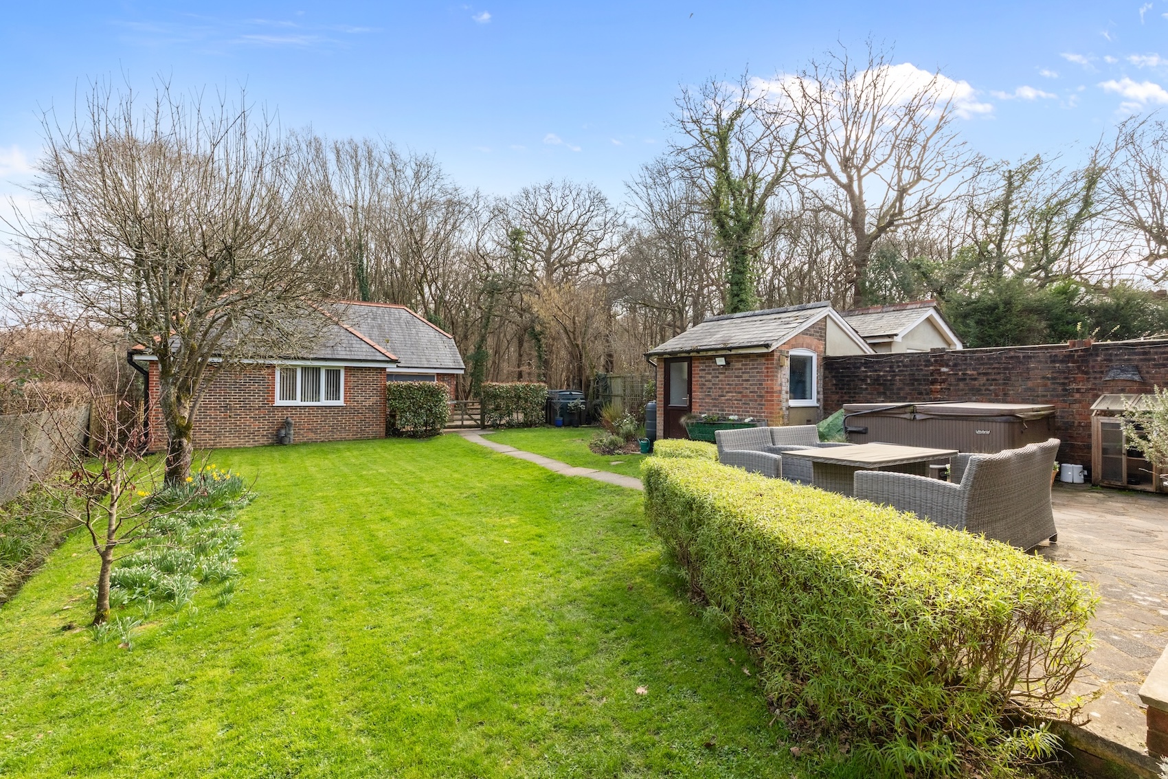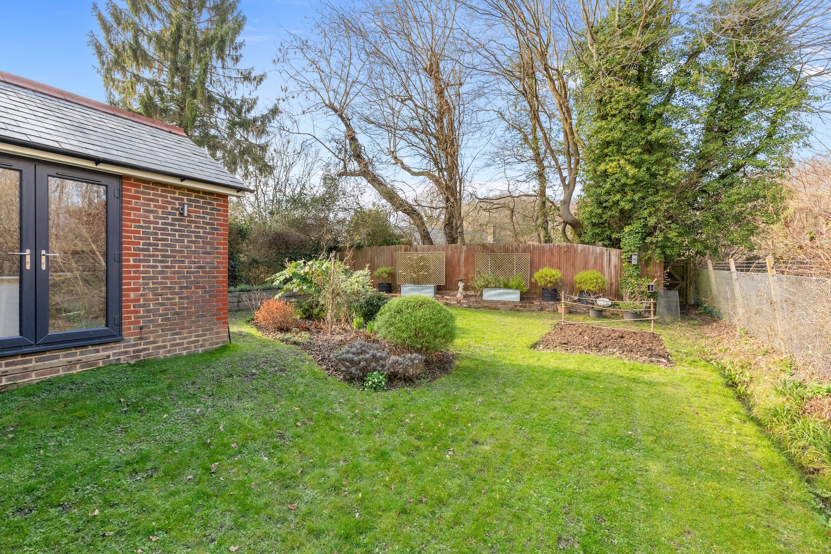 The 0.21 acre plot offers an excellent degree of privacy and the land adjacent to the railway track is protected and there is a very slim chance of any development being possible. The 233’ wide x 56’ deep (maximum measurement) garden is predominantly lawned with established borders and the path and paved seating area lead off the kitchen.