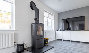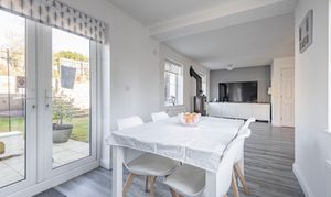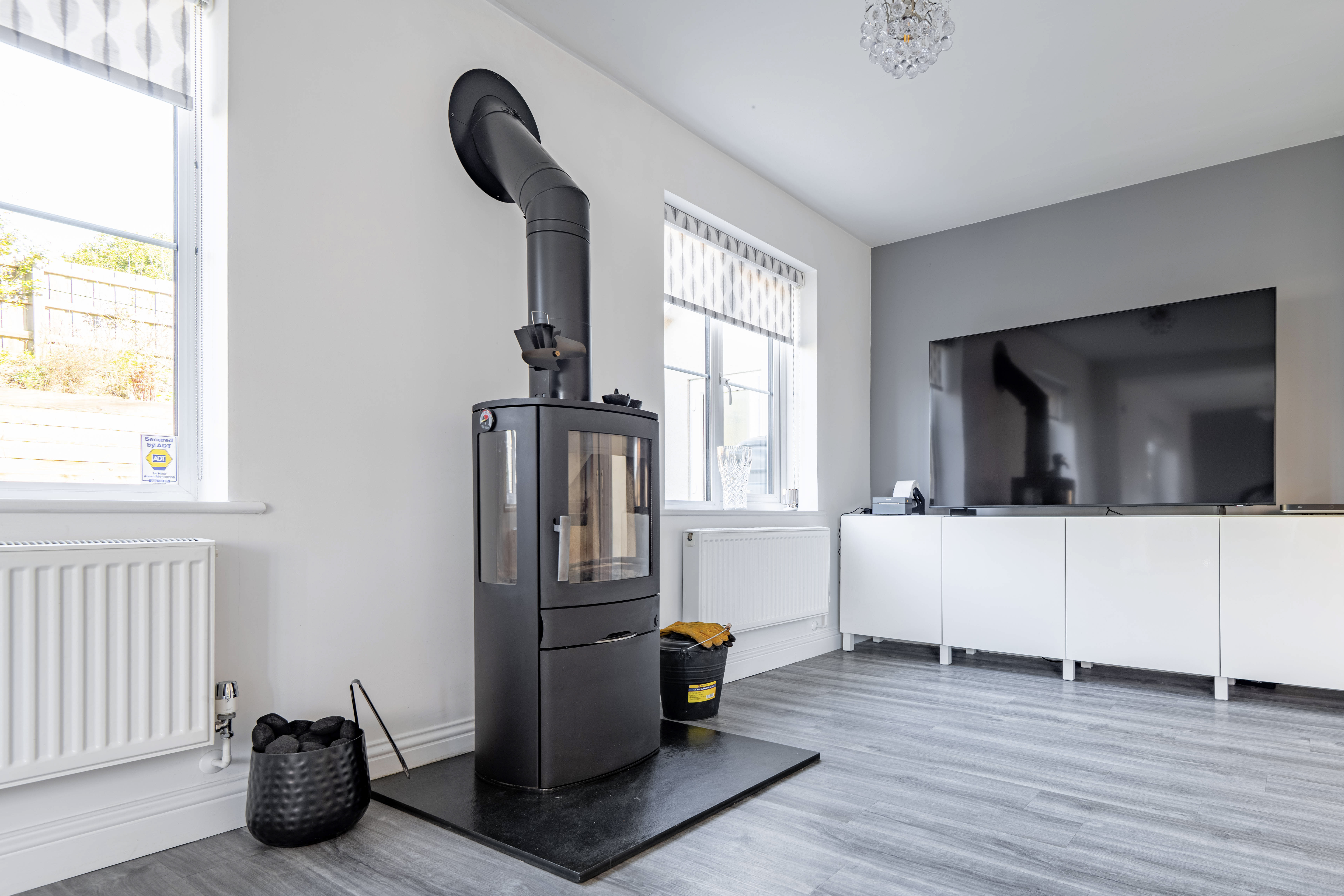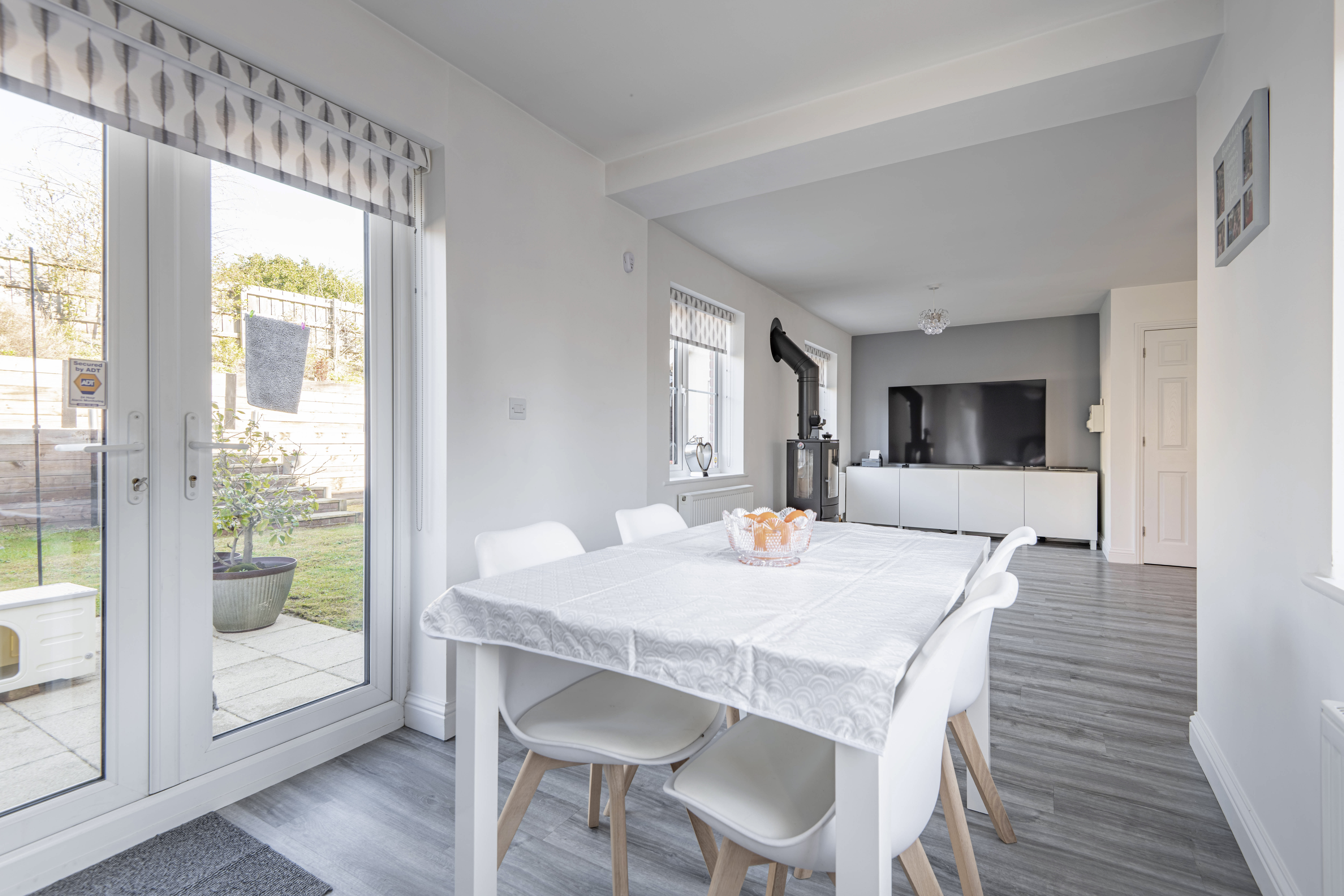 To the rear of the property, a spacious sitting and dining room creates a bright and inviting environment. The layout is open plan, yet thoughtfully arranged to clearly define two distinct areas. The dining space sits adjacent to patio doors, offering direct access to the garden and making it ideal for entertaining, while the sitting area centres around a distinctive teardrop-style multi-fuel burner, providing a cosy focal point.