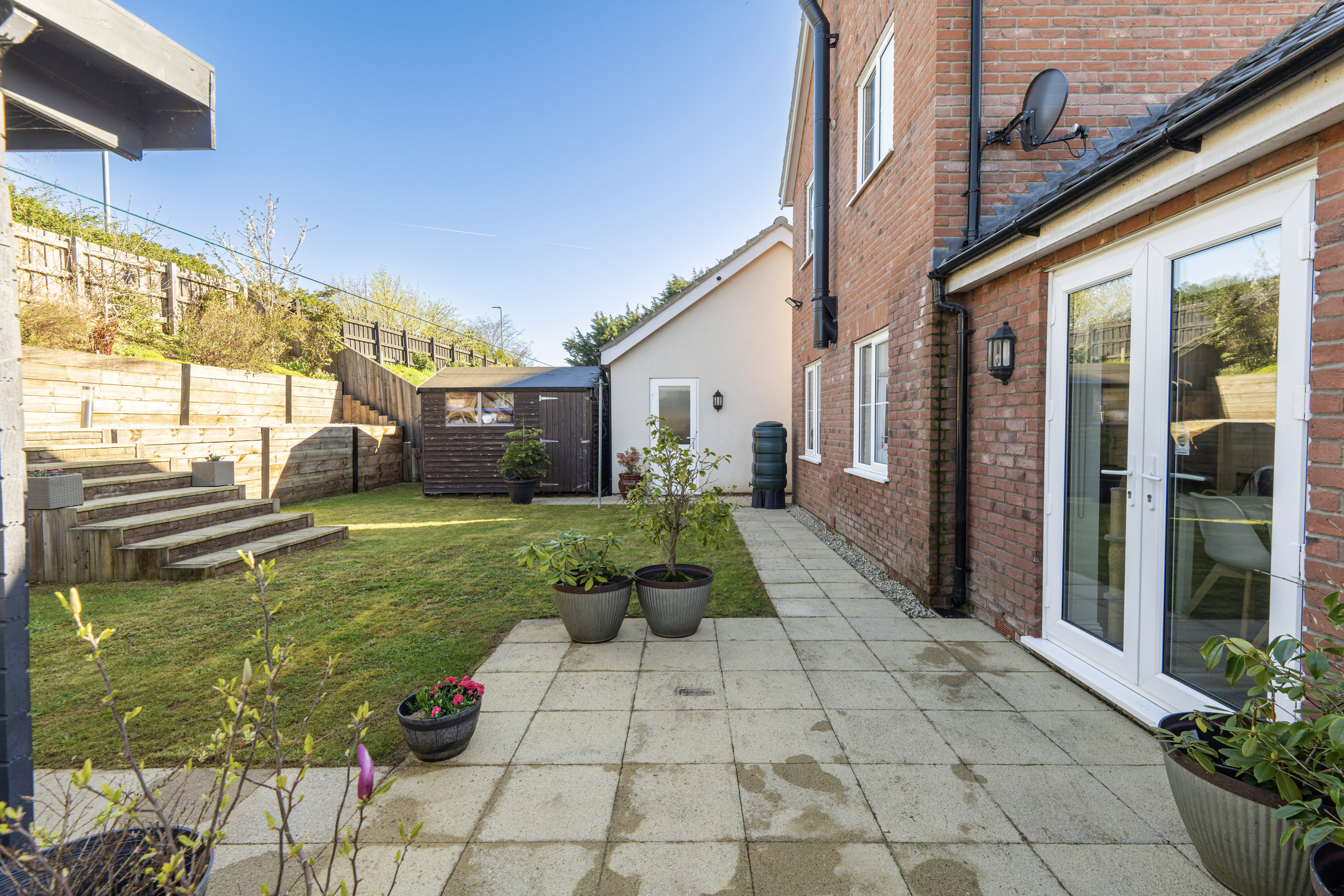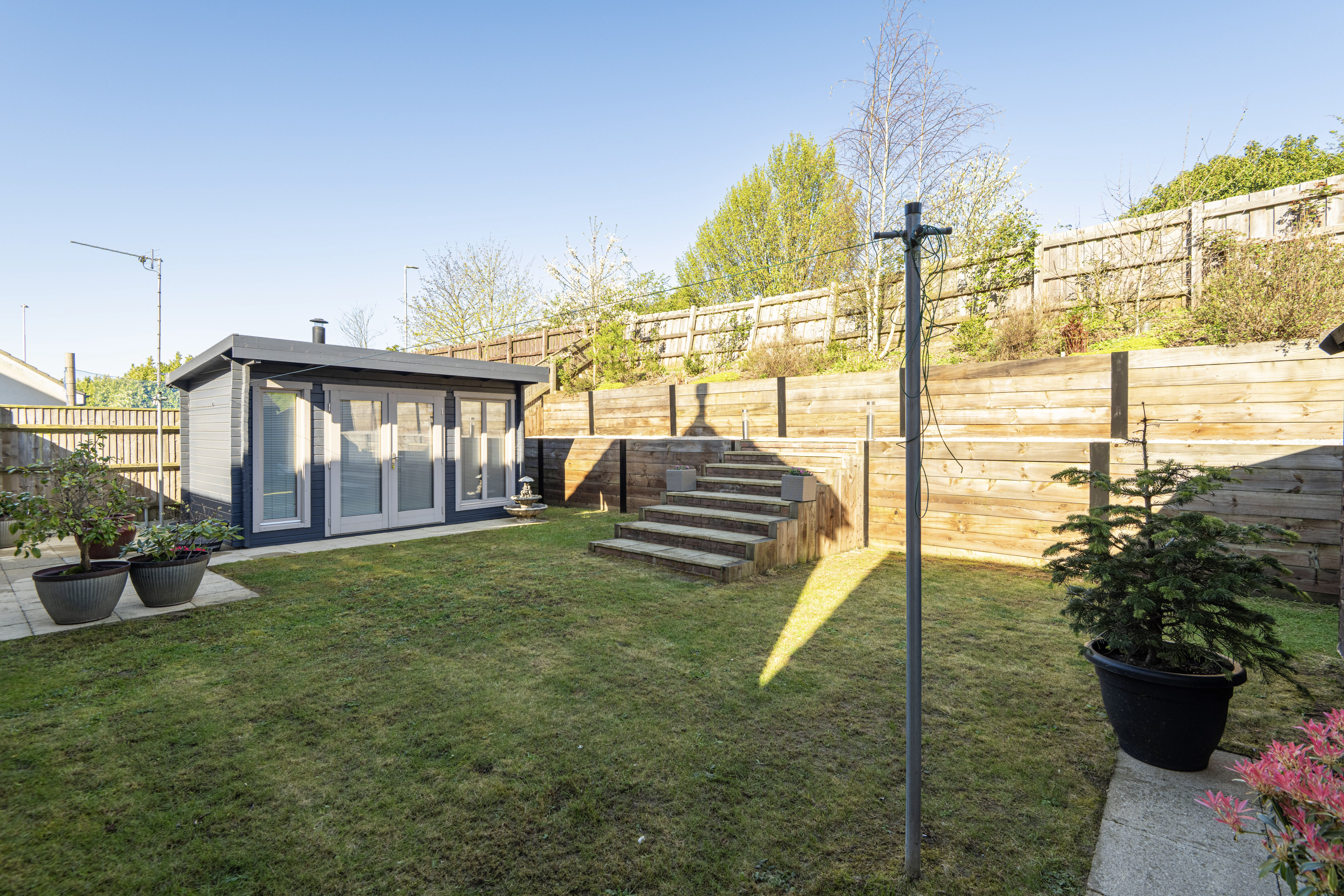Externally, the garden is a particularly attractive feature of the home. Fully landscaped across tiers, it offers a pleasing balance of lawn and patio areas, with steps leading up through the different levels. The layout creates a sense of space and privacy, making it ideal for both relaxation and entertaining. A garden shed is included and will remain with the property.
