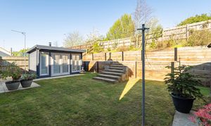 The garden also includes a versatile double-glazed outdoor cabin, suitable for a range of uses such as a home office or hobby space. It is fitted with electric, WiFi, and a multi-fuel burner.