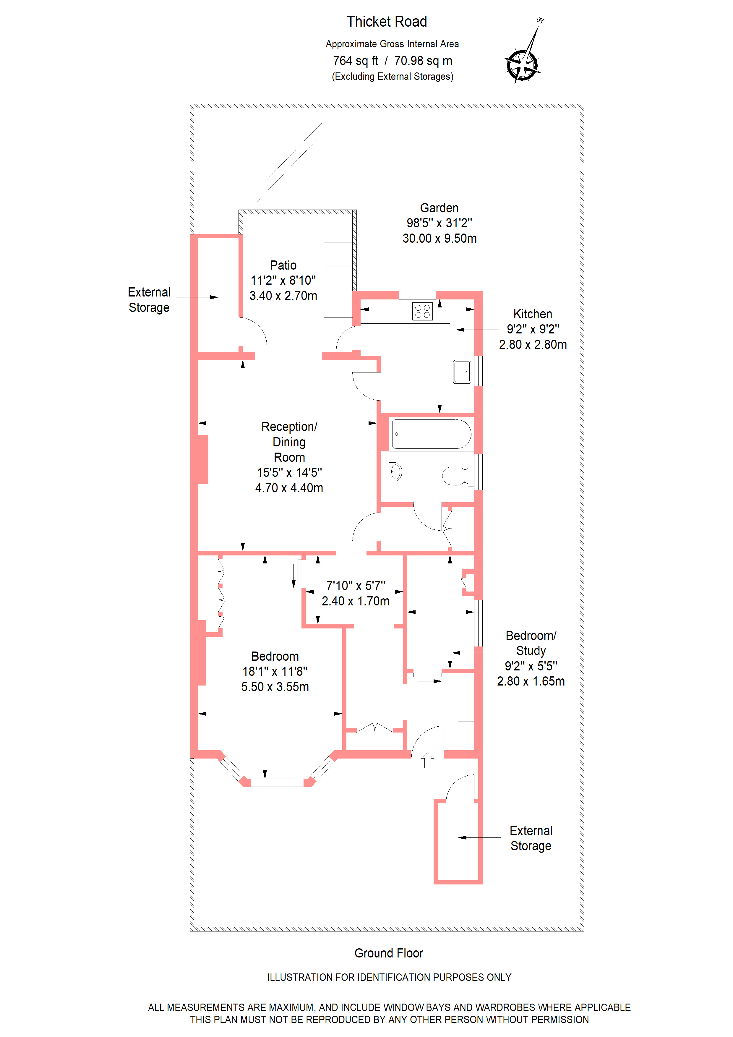 Two external storage units — one to the front, one to the rear — deal with the practical overflow that flats of this type often lack. Bikes, buggies, garden equipment — it's covered.