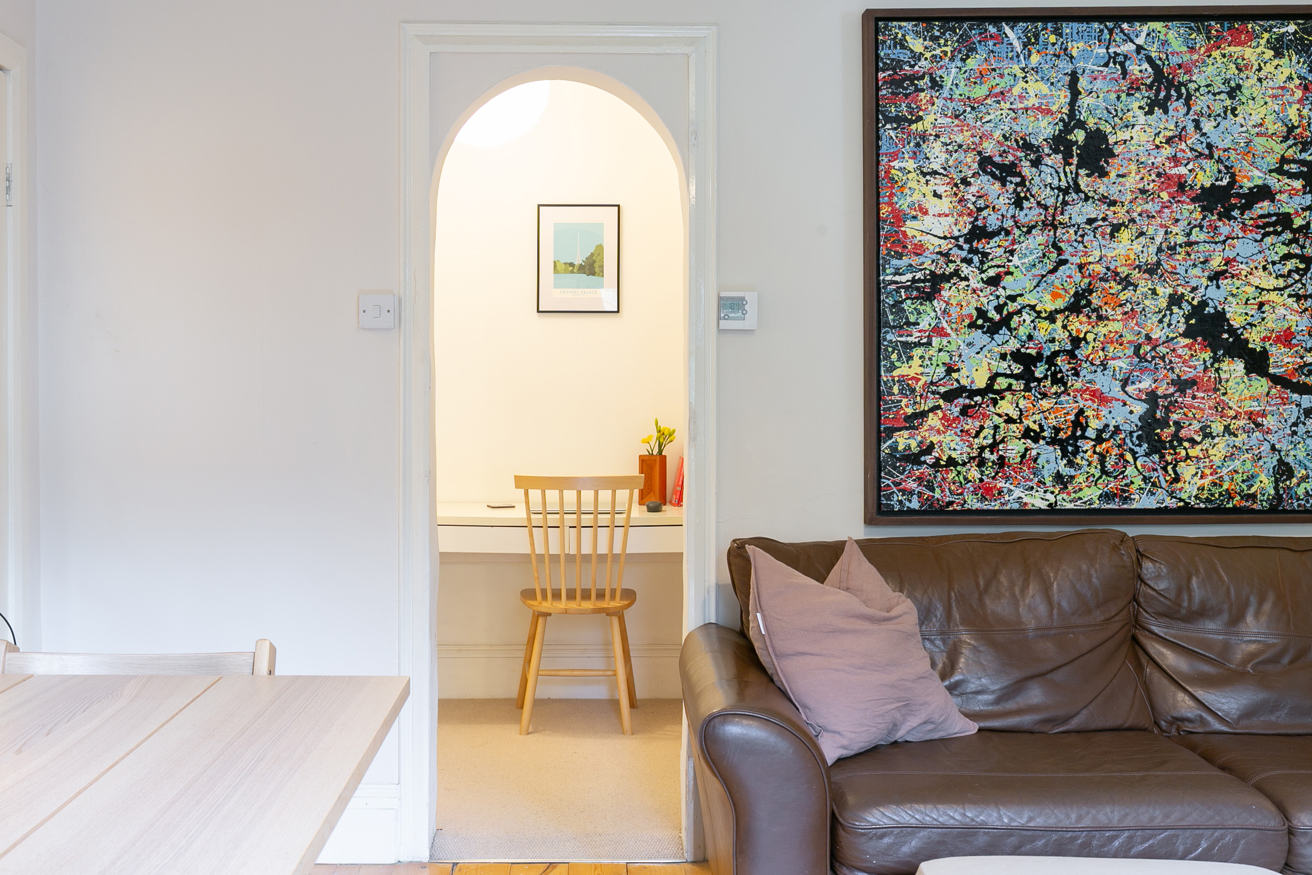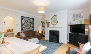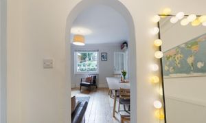 The flat has a very considered interior; the space and layout have been used brilliantly. The reception is the focal point, at 15 by 14 feet, it’s a genuinely useful footprint that gives you real options. There's room for a proper dining table and a sofa arrangement without compromise, and the arched doorway through to the hallway adds a period note that suits the building. Period cornicing runs throughout, the floors are stripped pine boards, and the cast iron fireplace is the focal point the room deserves. It's a space that functions as well for a dinner party as it does for a quiet evening in, and it’s semi-open plan to the kitchen, which works well when entertaining.