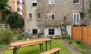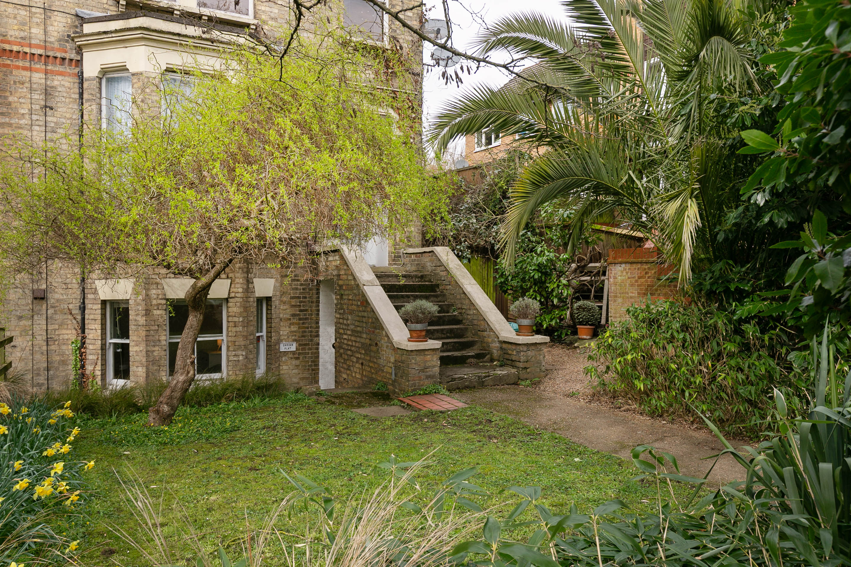 That outdoor space is worth dwelling on. The patio is a proper sitting area — there's room for chairs, a table, providing a private space to dine al fresco, sip a gin, or just catch up on a book. Steps lead up to the main run of the garden, which is vast, we estimate it to be over 90ft, which is wild for a flat in this part of London. Aspect-wise it gets great light throughout the day, especially in the afternoon and into the evening from the west, and during the day in the summer it will get the southern sun at the end of the garden.