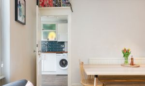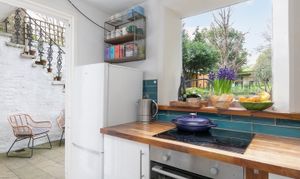 The kitchen works well, arranged in an L shape configuration. It has wooden worktops, which provide masses of space for meal prep. White cabinetry keeps it looking crisp, and the teal metro tiles give the room a distinct identity without trying too hard. The electric hob, integrated oven, and full-height fridge freezer are all present, and the washing machine sits neatly at the end of the run. The key feature here is the frameless-feeling window that looks directly onto the garden. There's a wooden sill wide enough to use, the outlook is mature and green, and it makes a kitchen this size feel considerably less like a kitchen. A door leads from here straight out to the patio and garden.