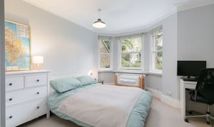 Moving back inside, the main bedroom is large — 18 by nearly 12 feet — with a bay window looking onto the front. It's a room that comfortably takes a king-size bed, two chests of drawers, and a desk without feeling crowded, there are built in wardrobes already fitted, saving floor space to use as you wish. The ceiling height and cornicing carry through from the reception room. There's space here for a proper wardrobe run if required.