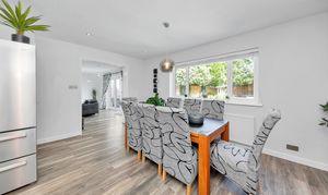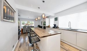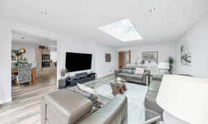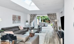 A large archway connects the lounge, making it a fantastic entertaining space with the added bonus of large bi-fold doors which open out onto the garden terrace. There is a large roof lantern, attractive wood effect flooring, inset lighting, and vast amounts of space for a variety of lounge and storage furniture.