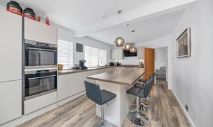 The kitchen/dining room is wonderfully open-plan, benefiting from windows to a dual aspect, a wide range of modern base and wall units, wood worktops, an island/breakfast bar, wood effect flooring, inset and pendant lighting, an integrated dishwasher, 2 ovens, a wine cooler, a hob and extractor hood, and space for an American fridge/freezer, a large dining setting, and other small kitchen appliances.