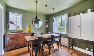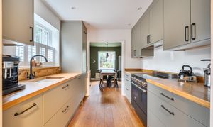 - Dining room opening to kitchen with range of high and low level cupboards, integrated fridge / freezer and dishwasher and range cooker