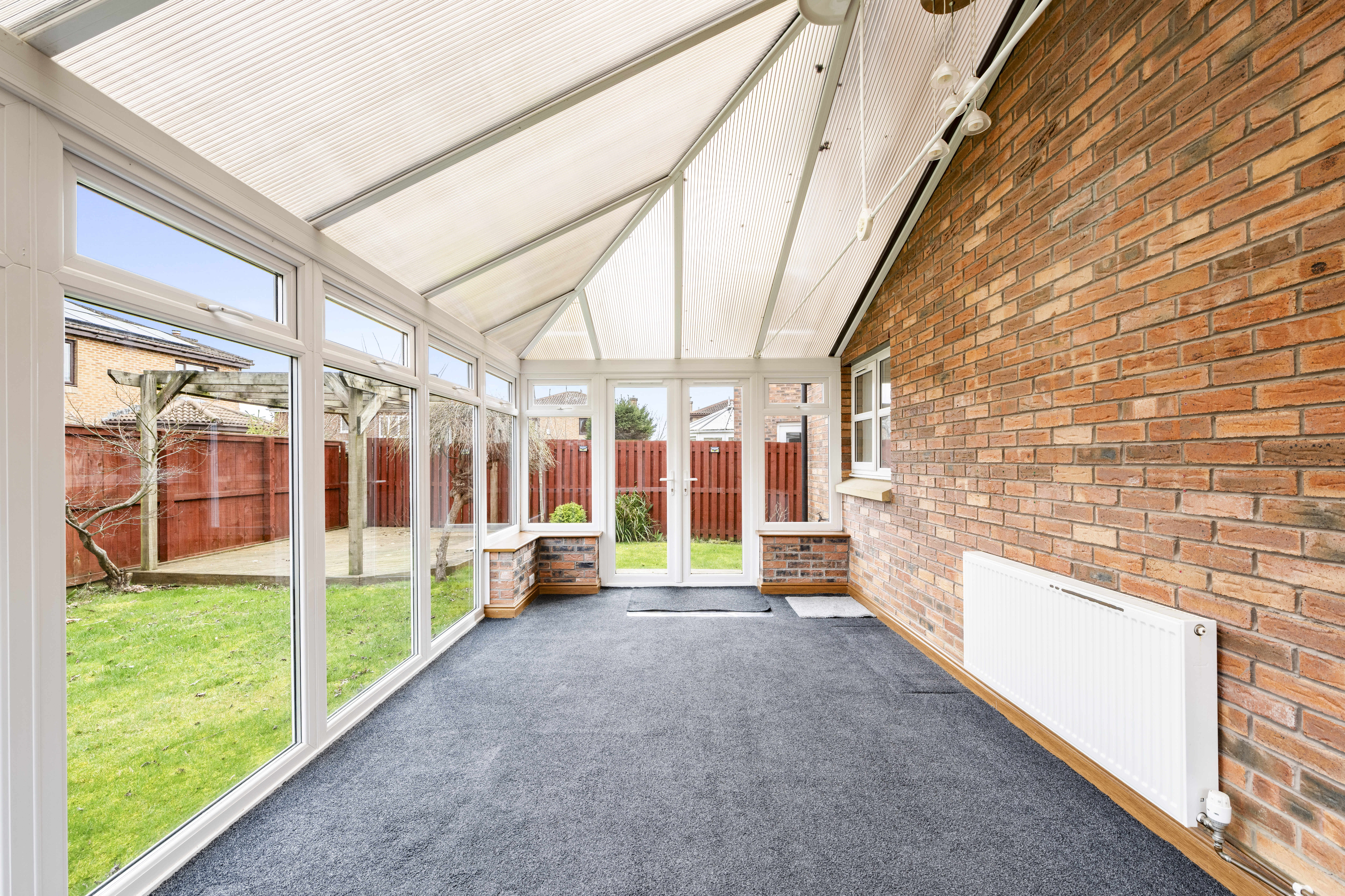 Exceptionally spacious conservatory with French doors to rear garden. Under floor heating. Fitted carpet, radiator, stylish light fitting.