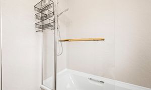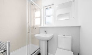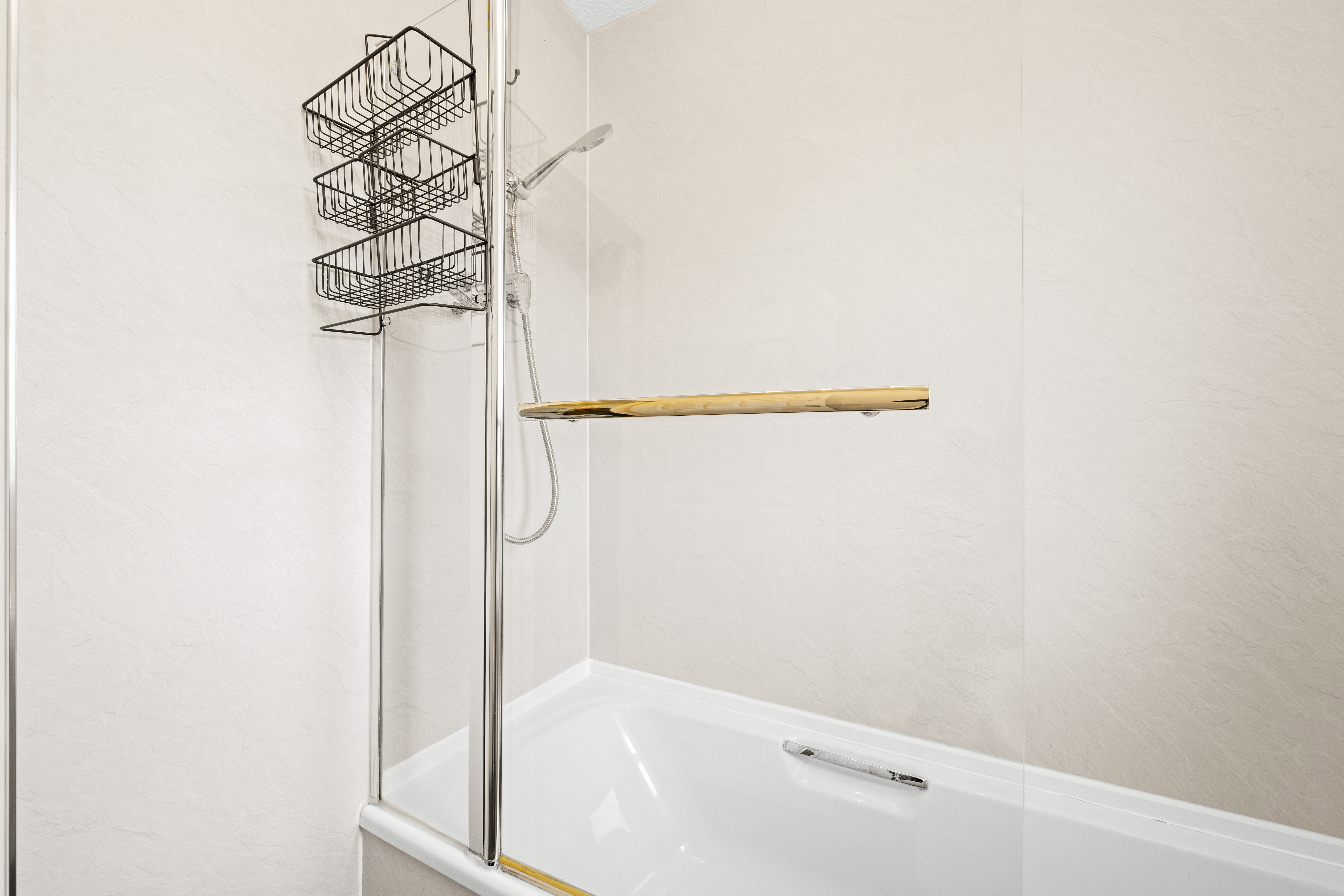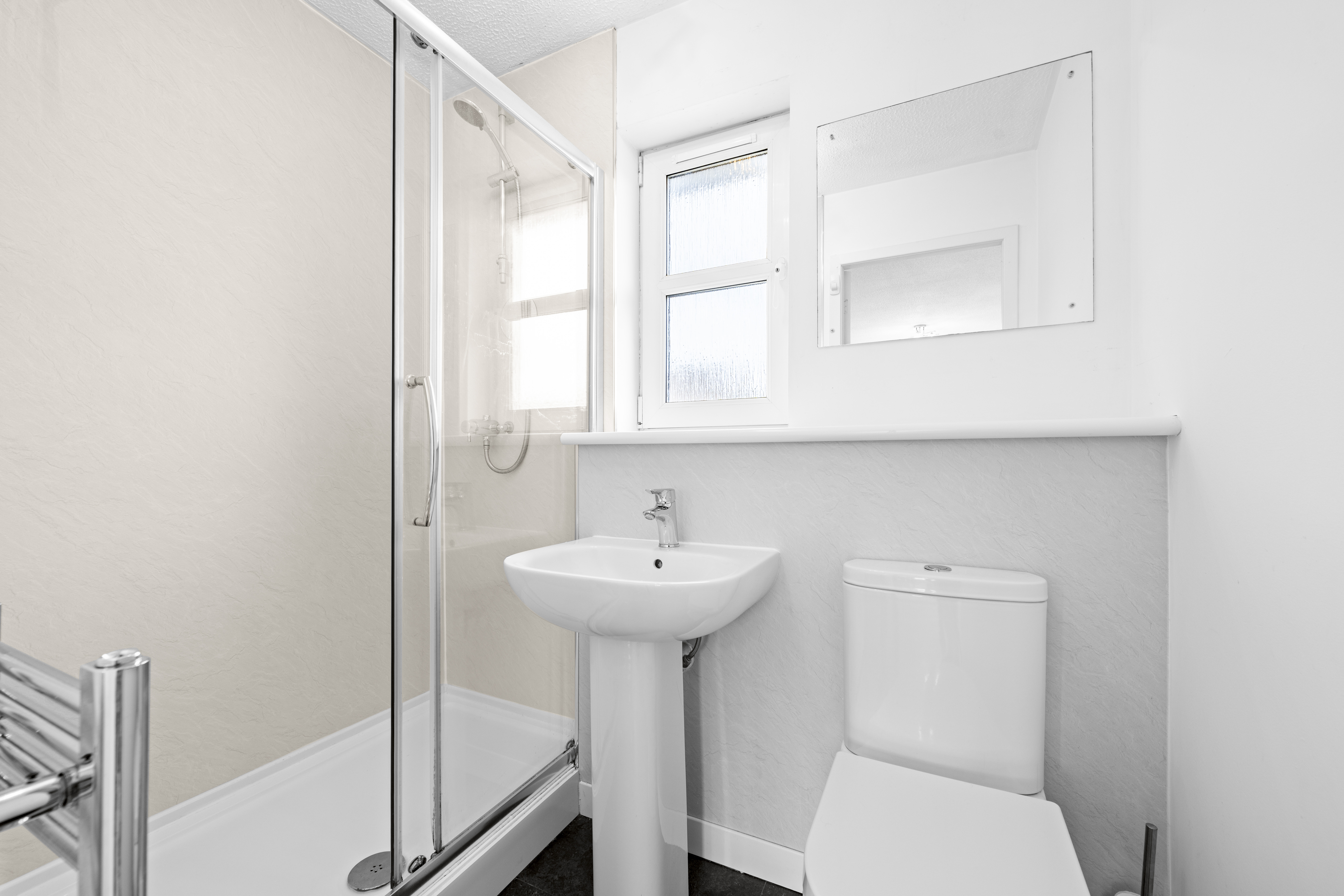 Wall clad and fitted with double shower cubicle and mains shower, pedestal wash hand basin with mixer tap and dual flush WC. Opaque glazed window with large display shelf. Laminate floor tiles, vertical radiator, 4-way spotlights.