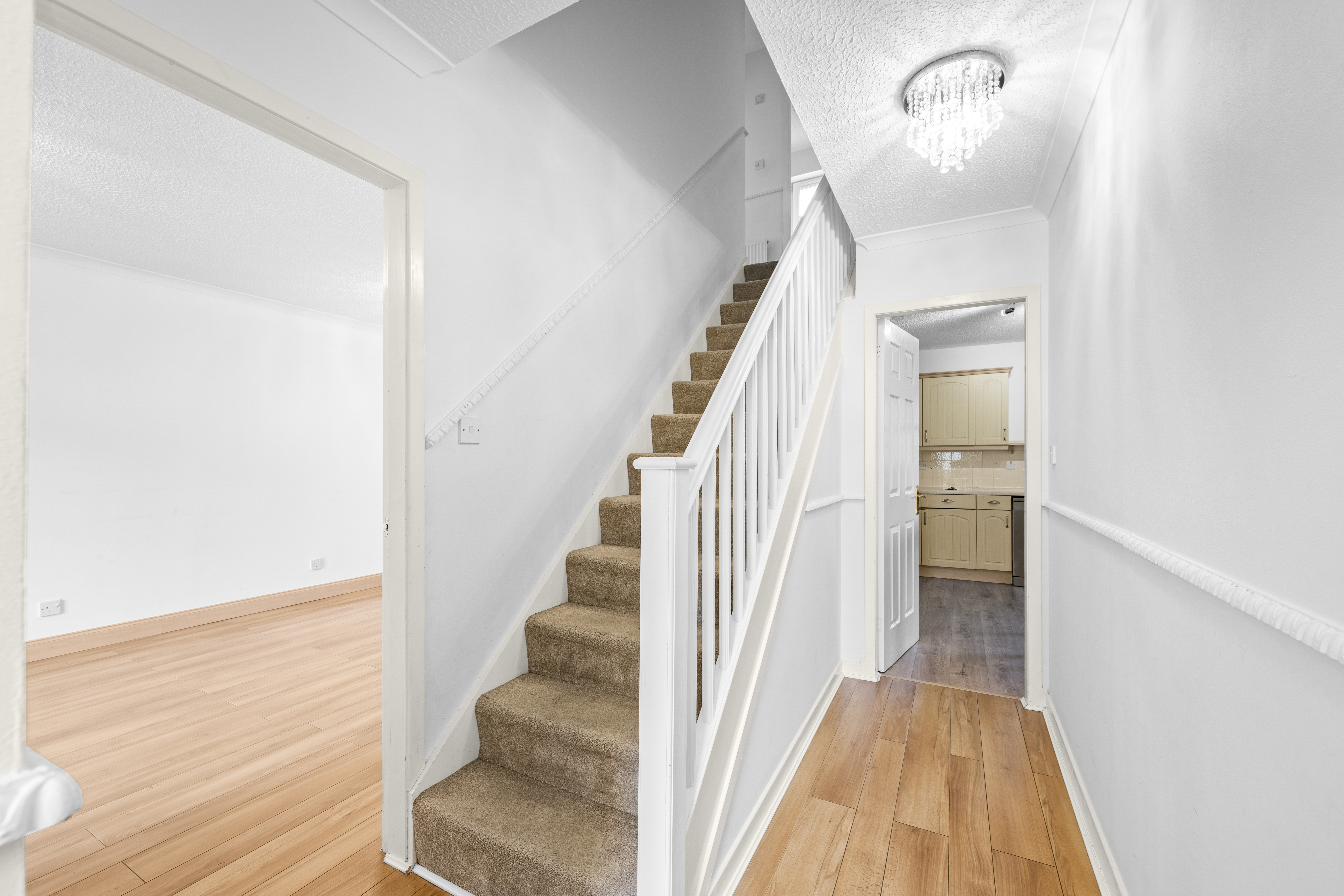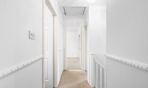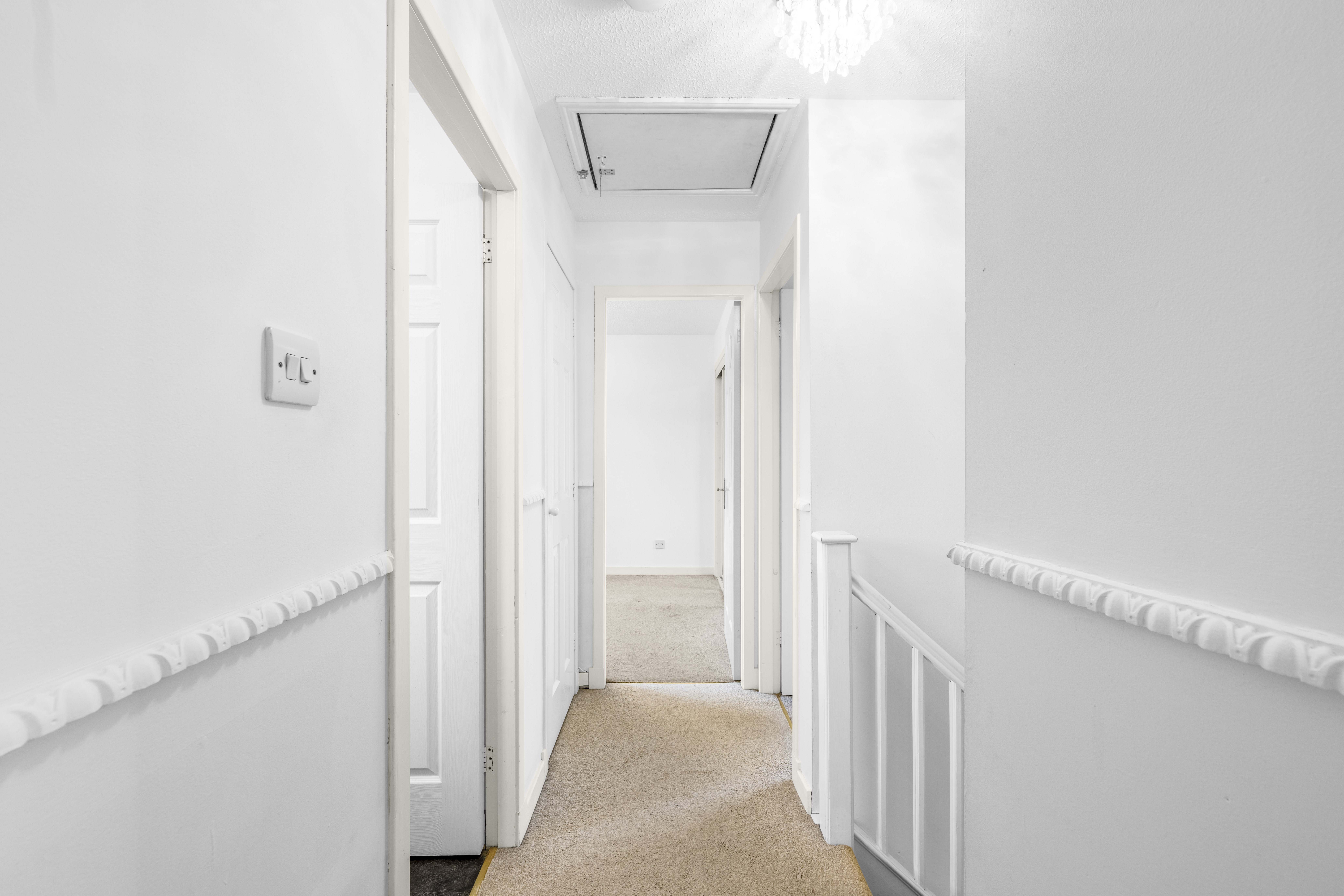Doors to bedrooms, bathroom and walk-in cupboard housing hot water tank and shelves. Hatch to loft.
