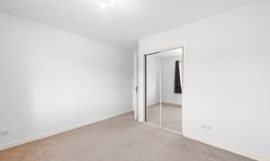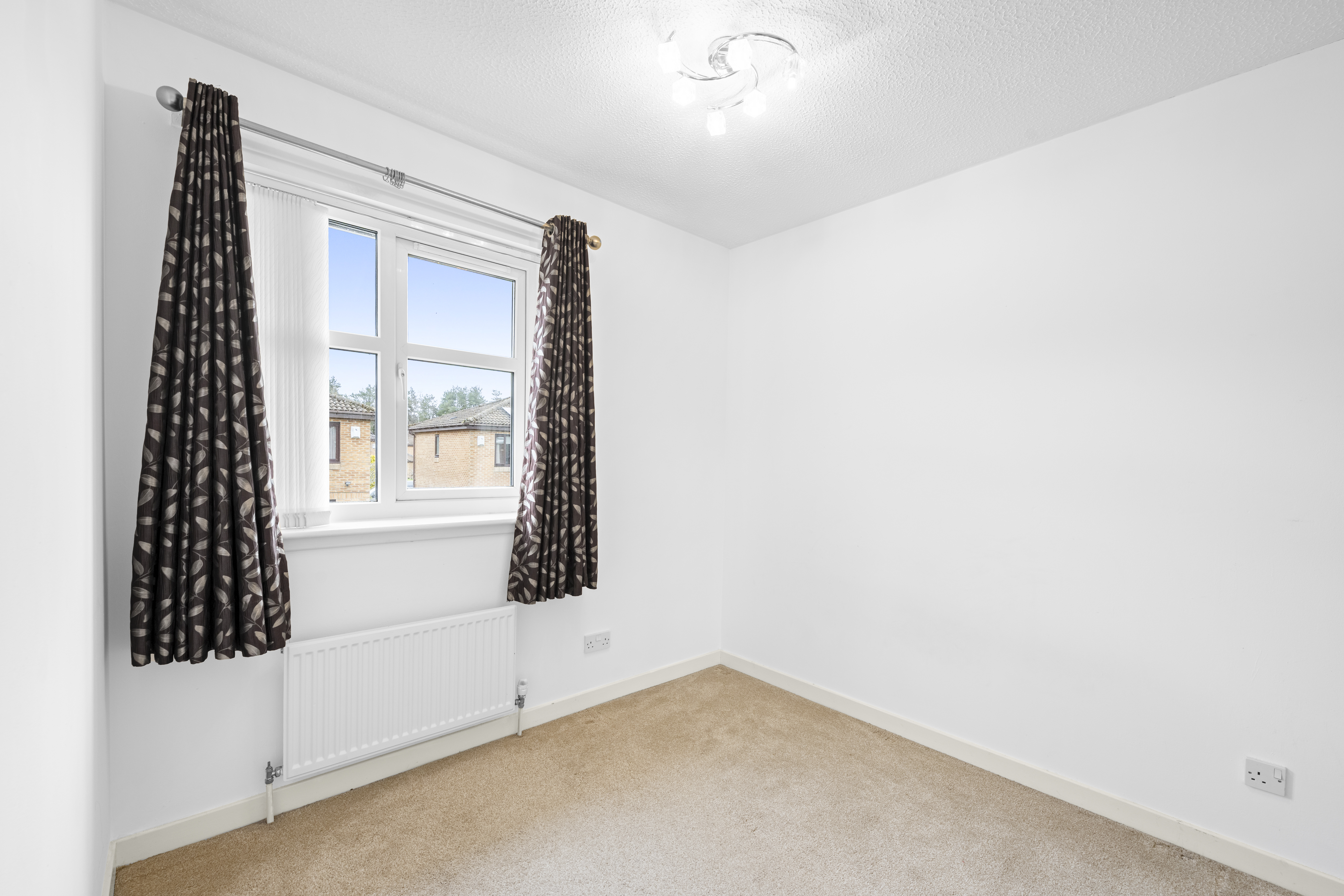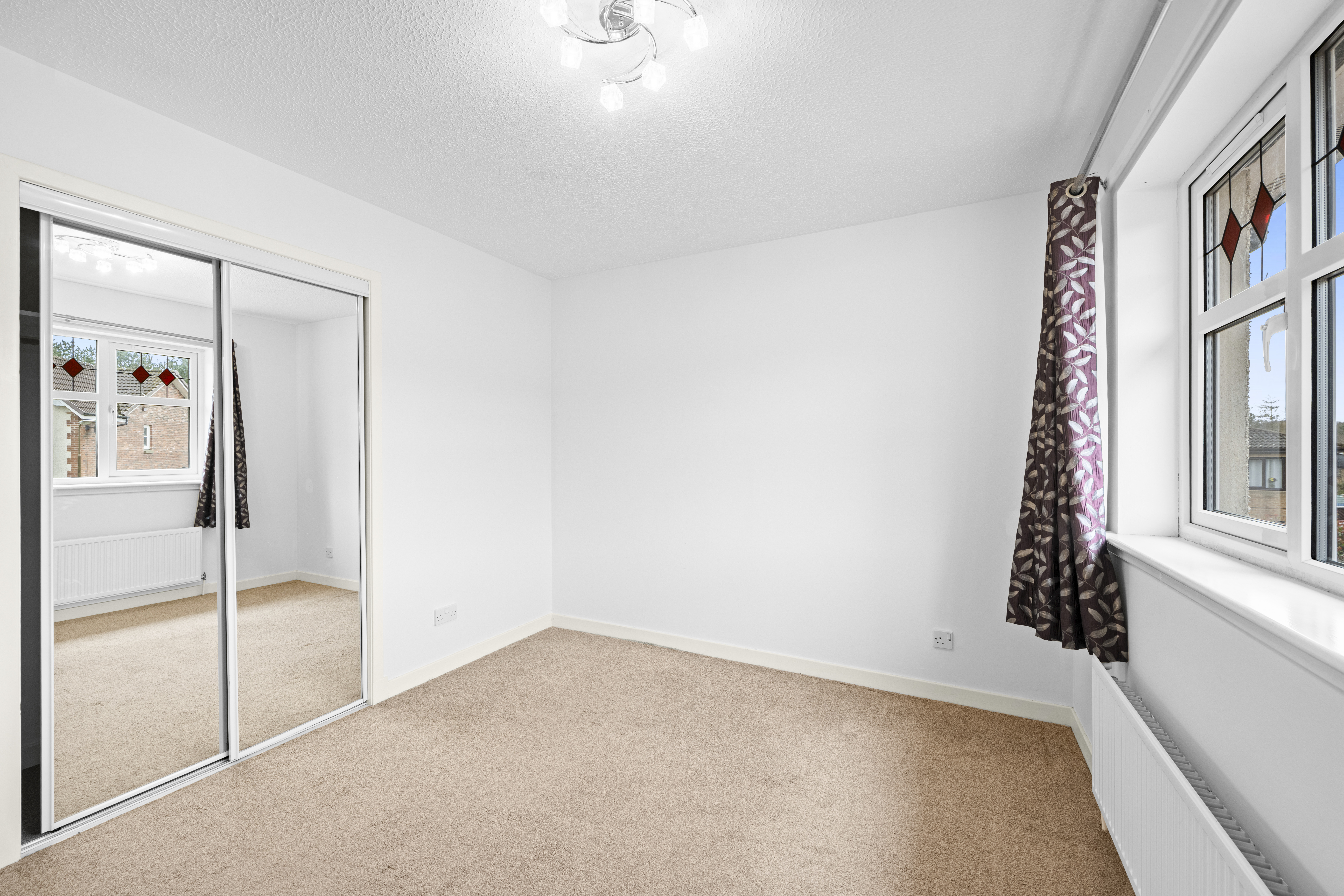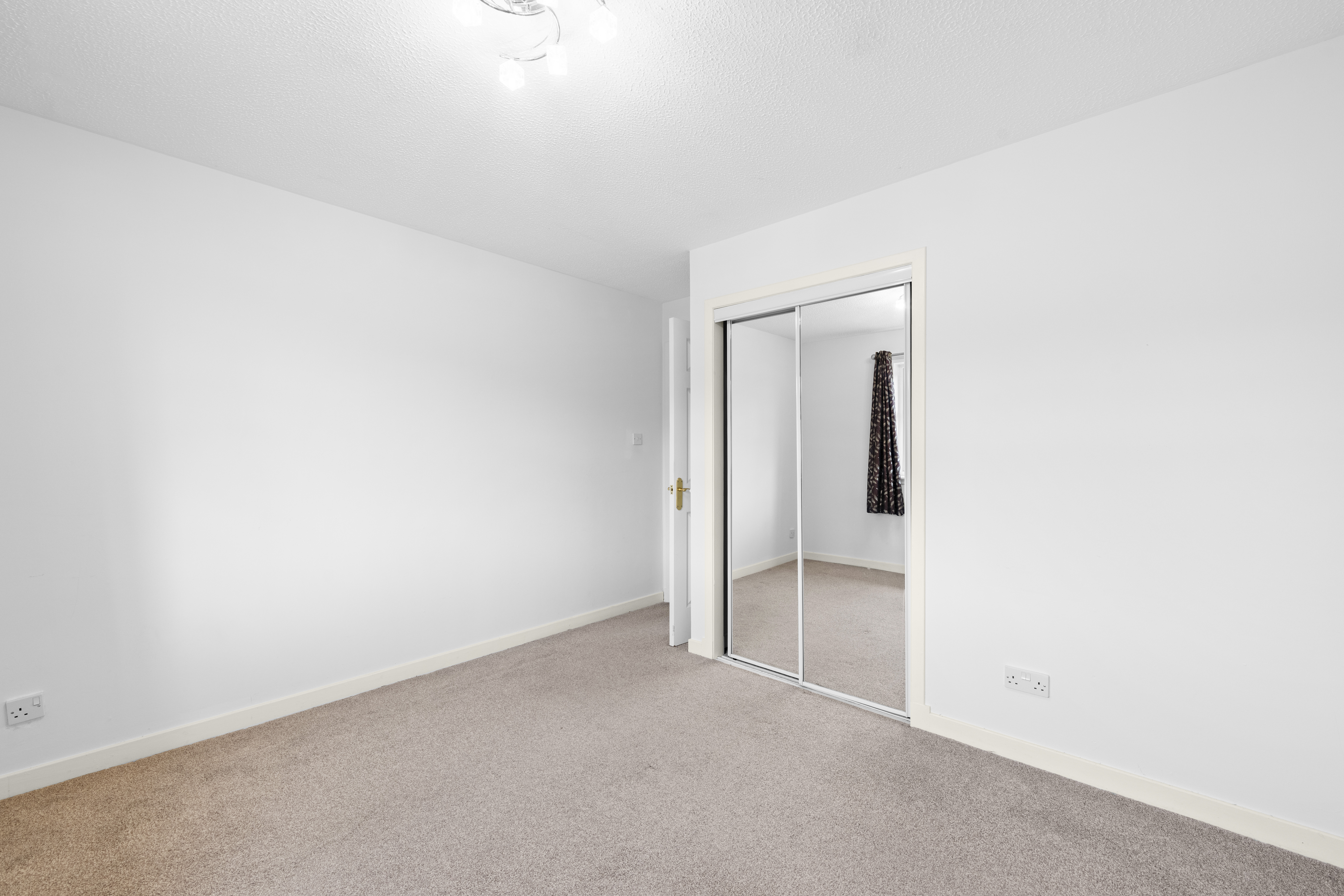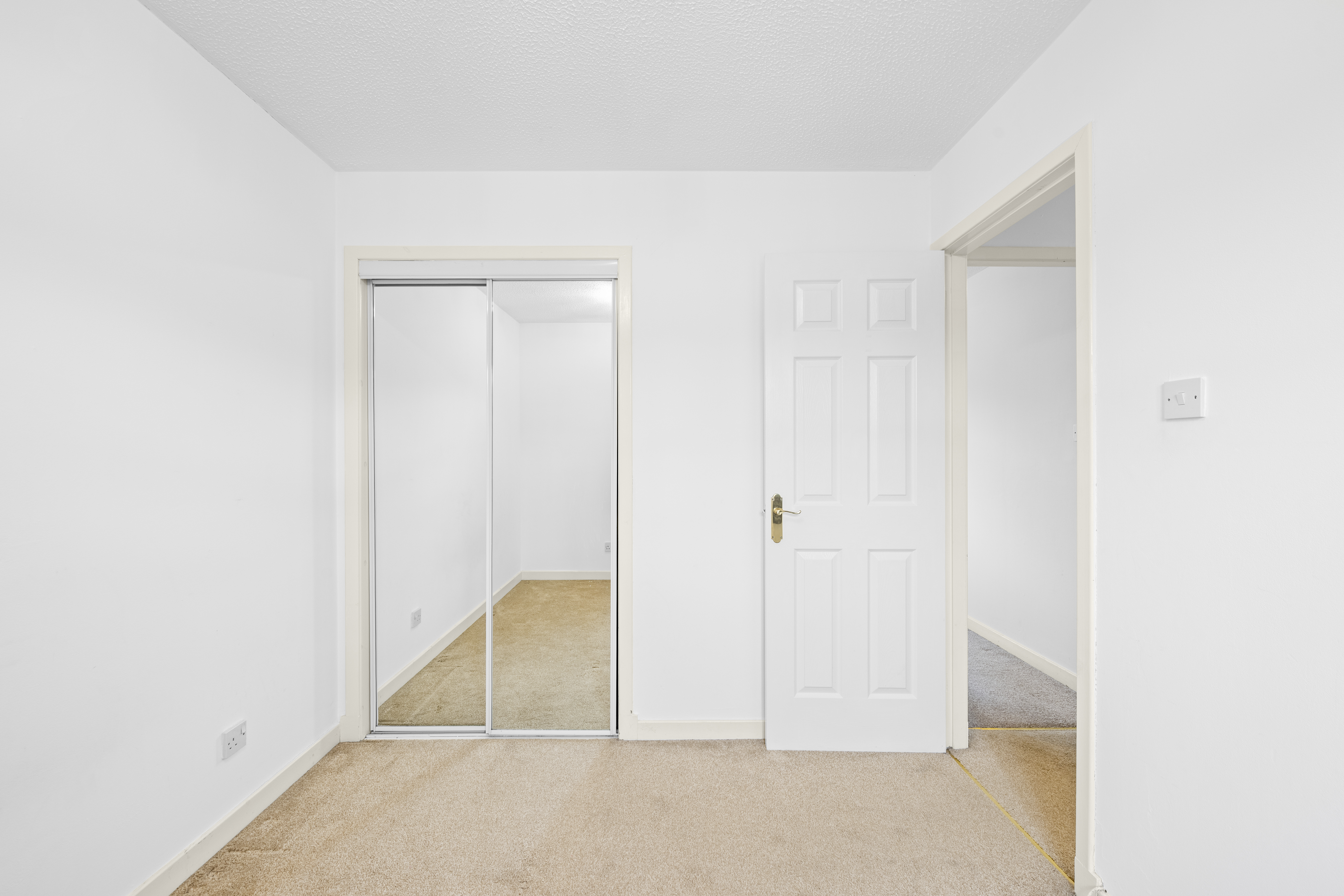 Good sized third bedroom with rear facing window, vertical blinds, curtains and pole. Fitted wardrobe concealed behind sliding mirrored doors. Fitted carpet, radiator.