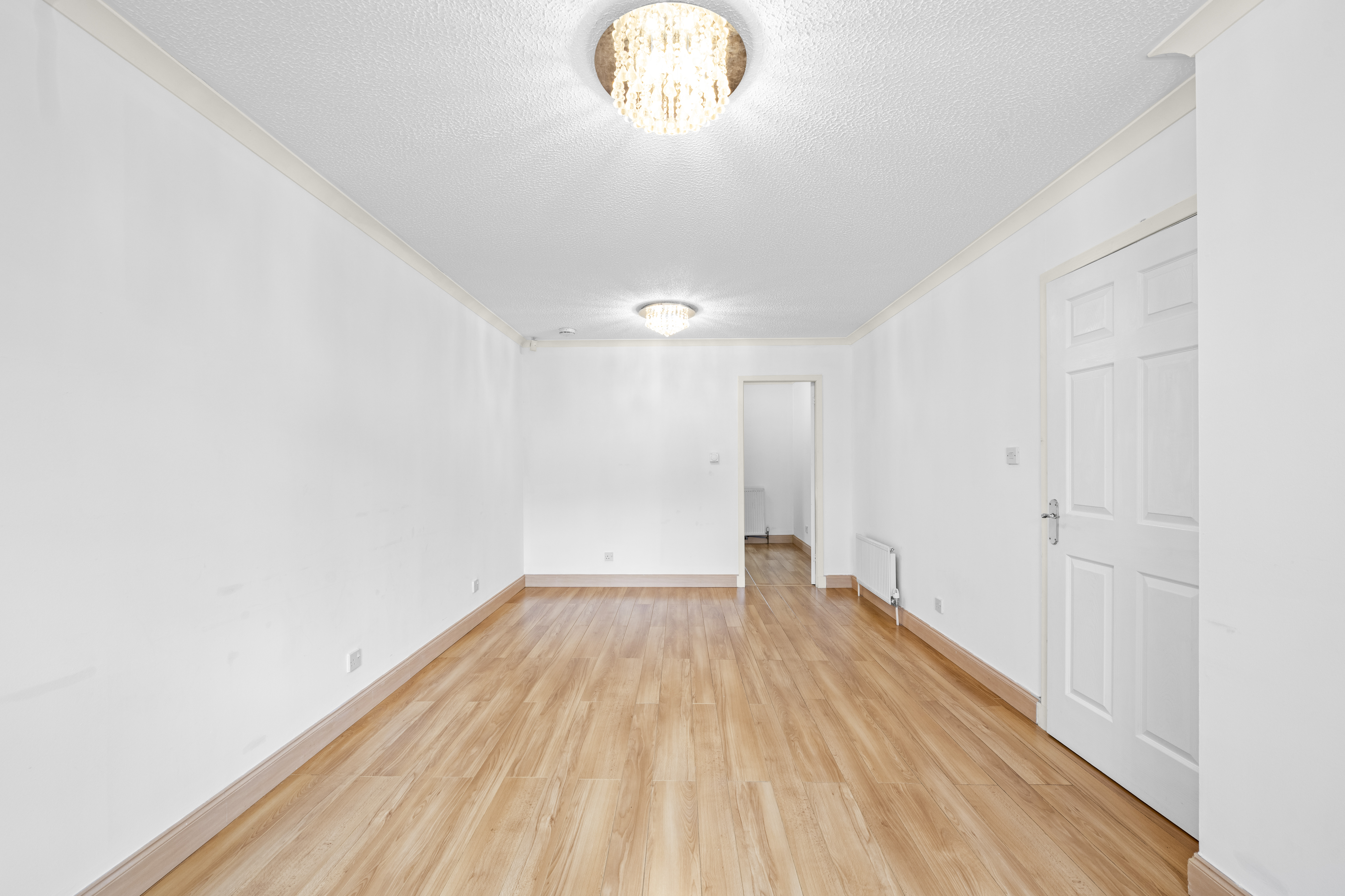 Spacious sitting room with front facing window, vertical blind, curtains and pole. Two radiators, two glass/crystal chandeliers.
