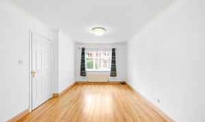 Spacious double bedroom with front facing window, curtains and pole. Fitted wardrobe concealed behind sliding mirrored doors. Fitted carpet, radiator.